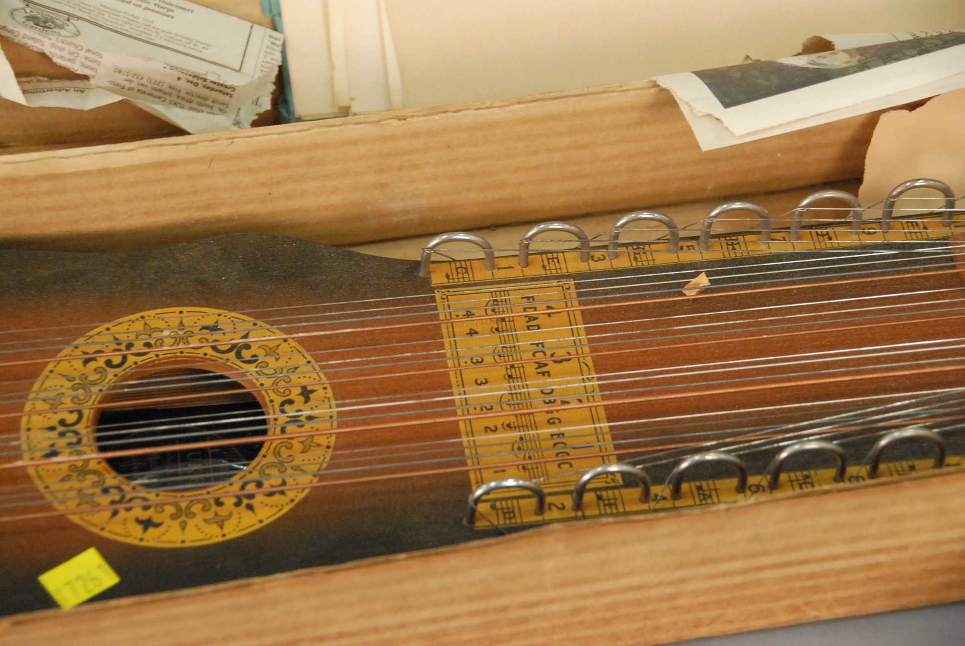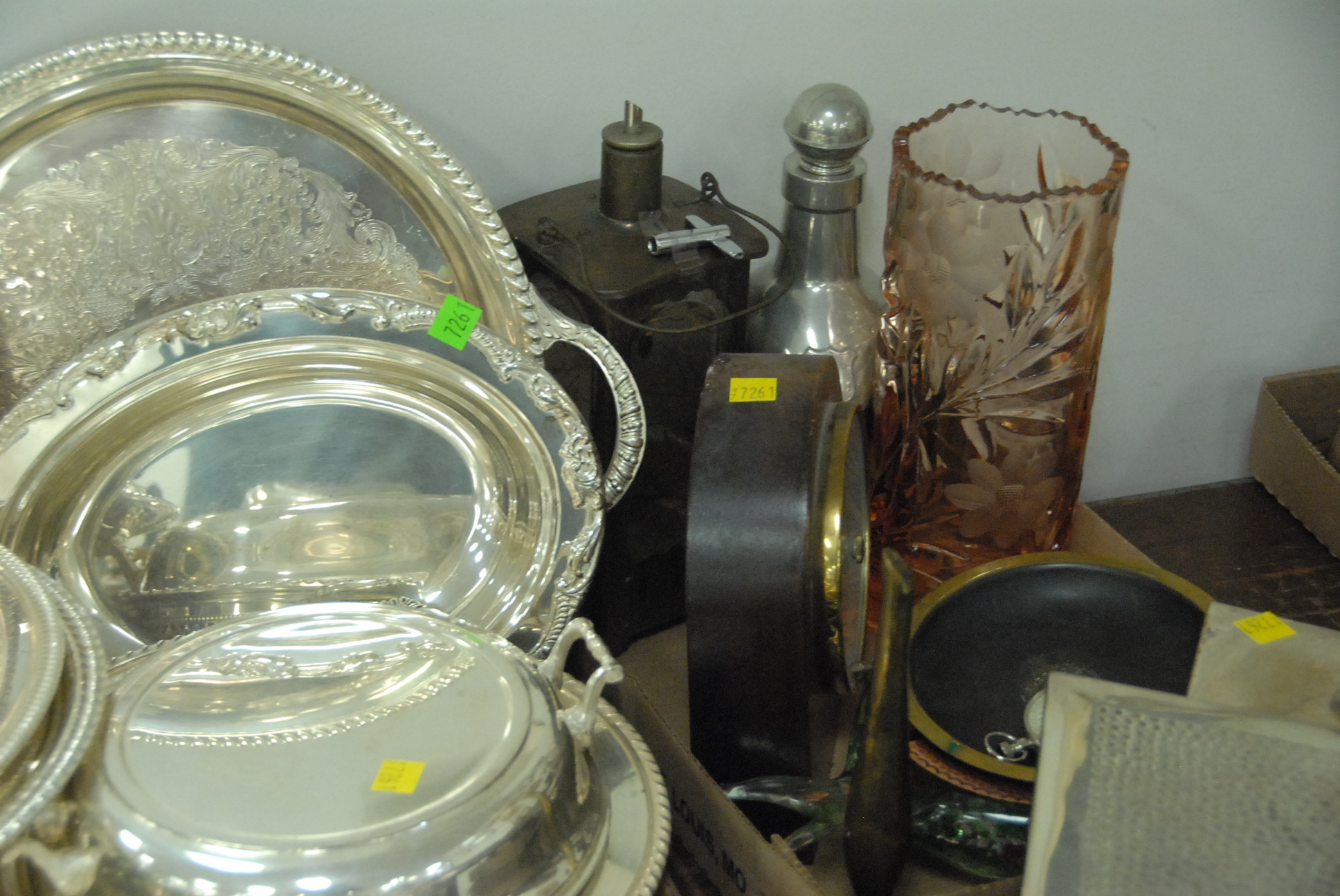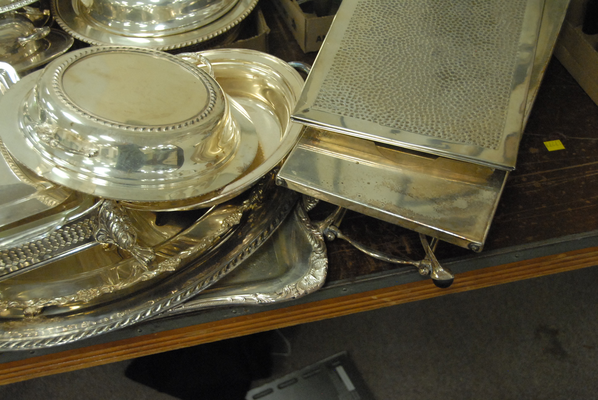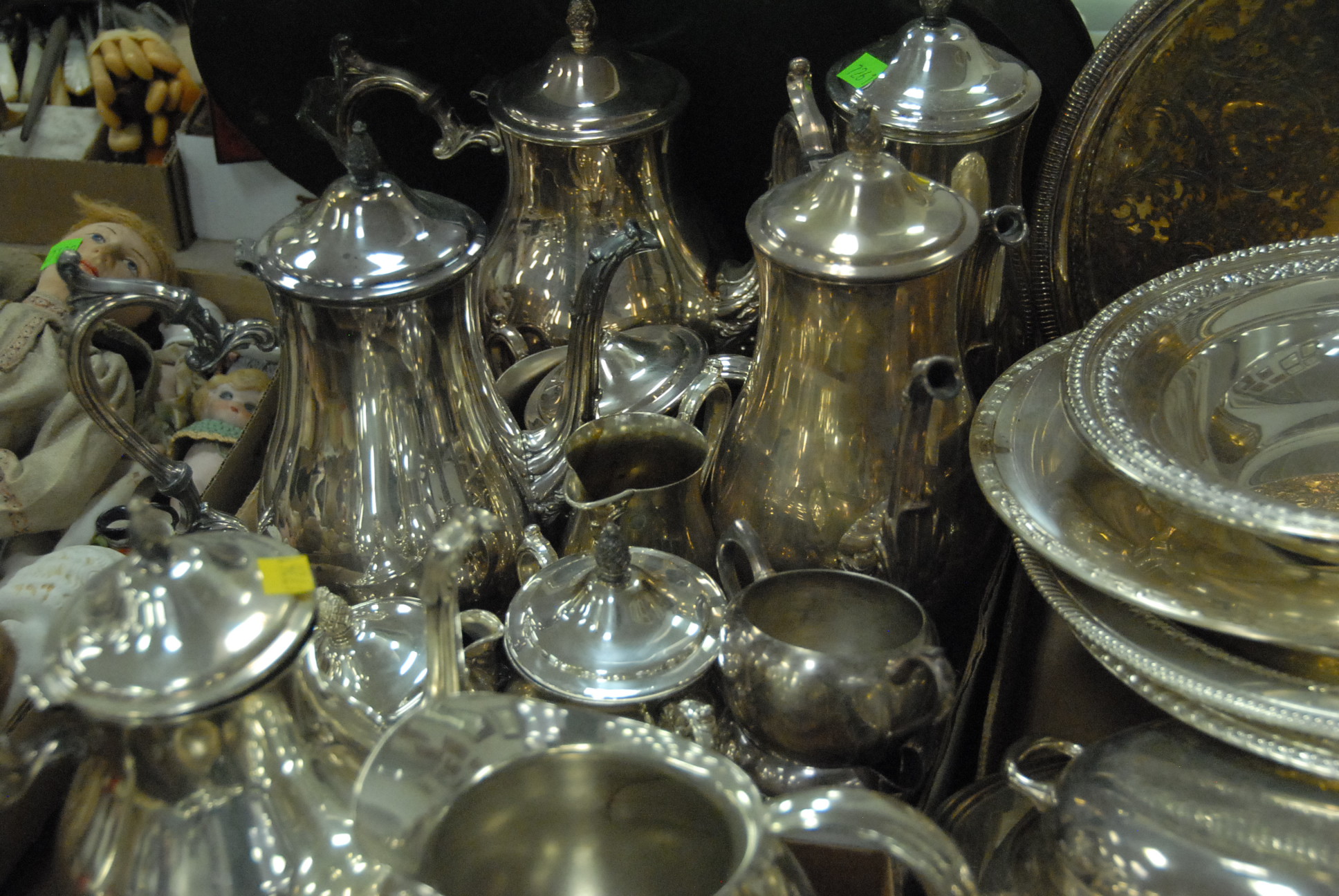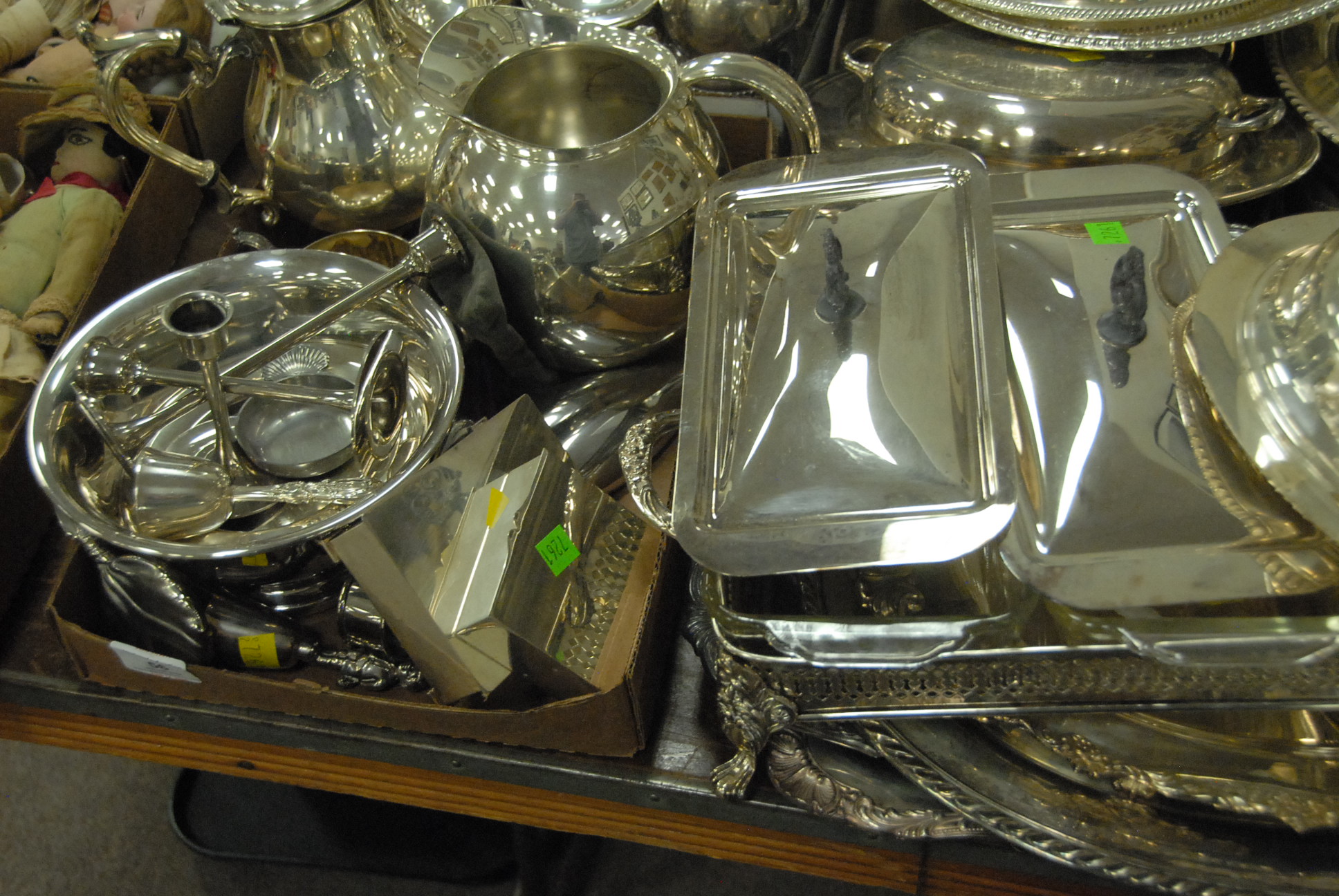Lot 56: Large lot to include a Ukelin and large grouping of silverplate including trays, covered dishes, tea sets, bowls, vases, clock, etc.