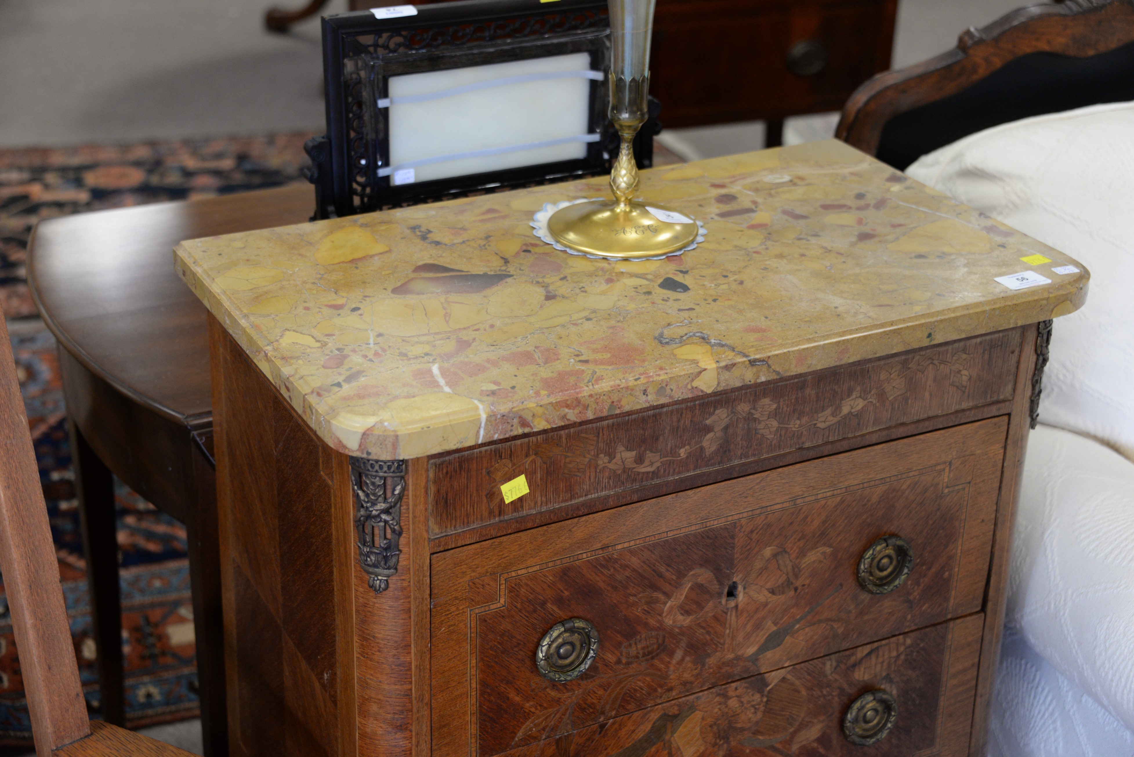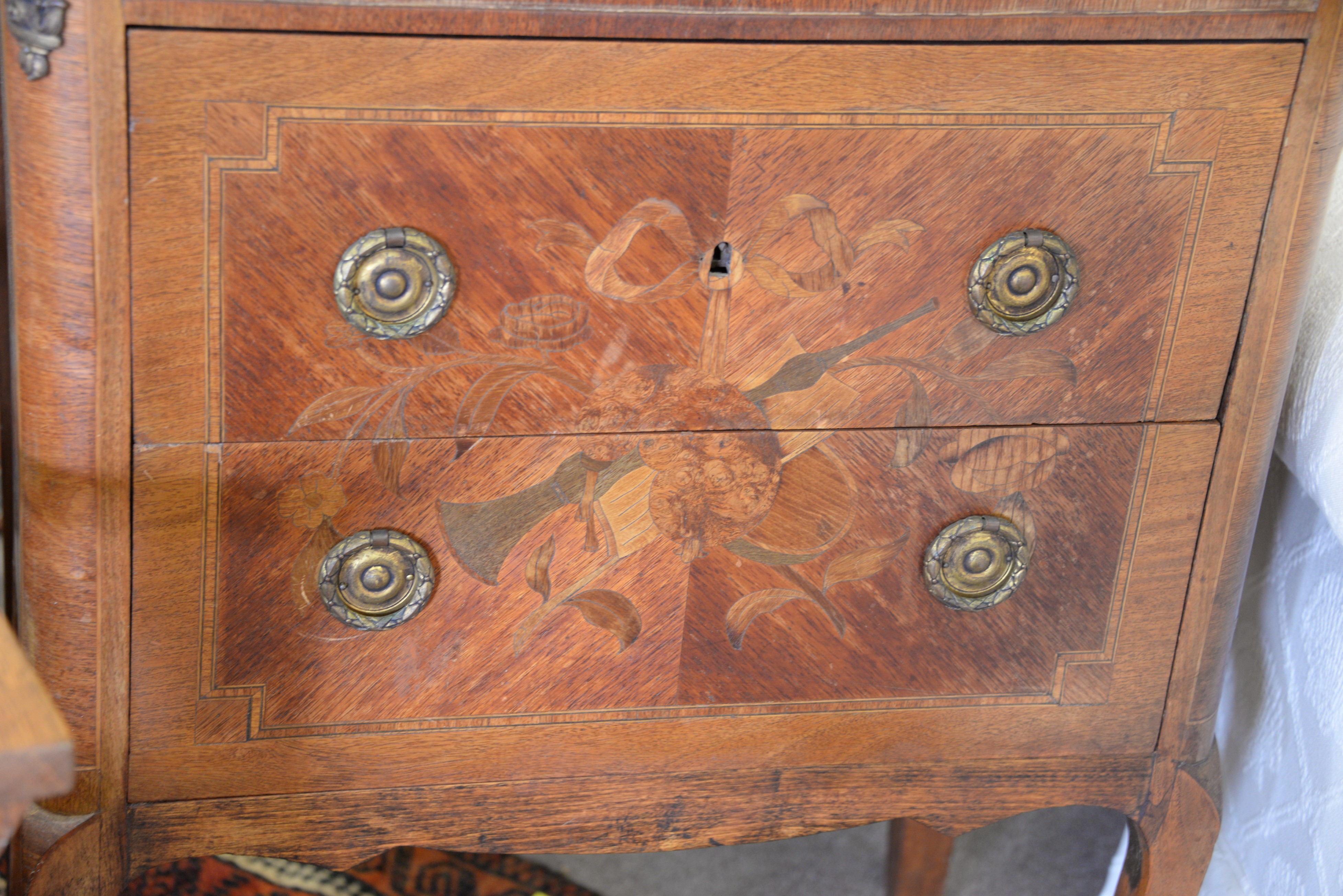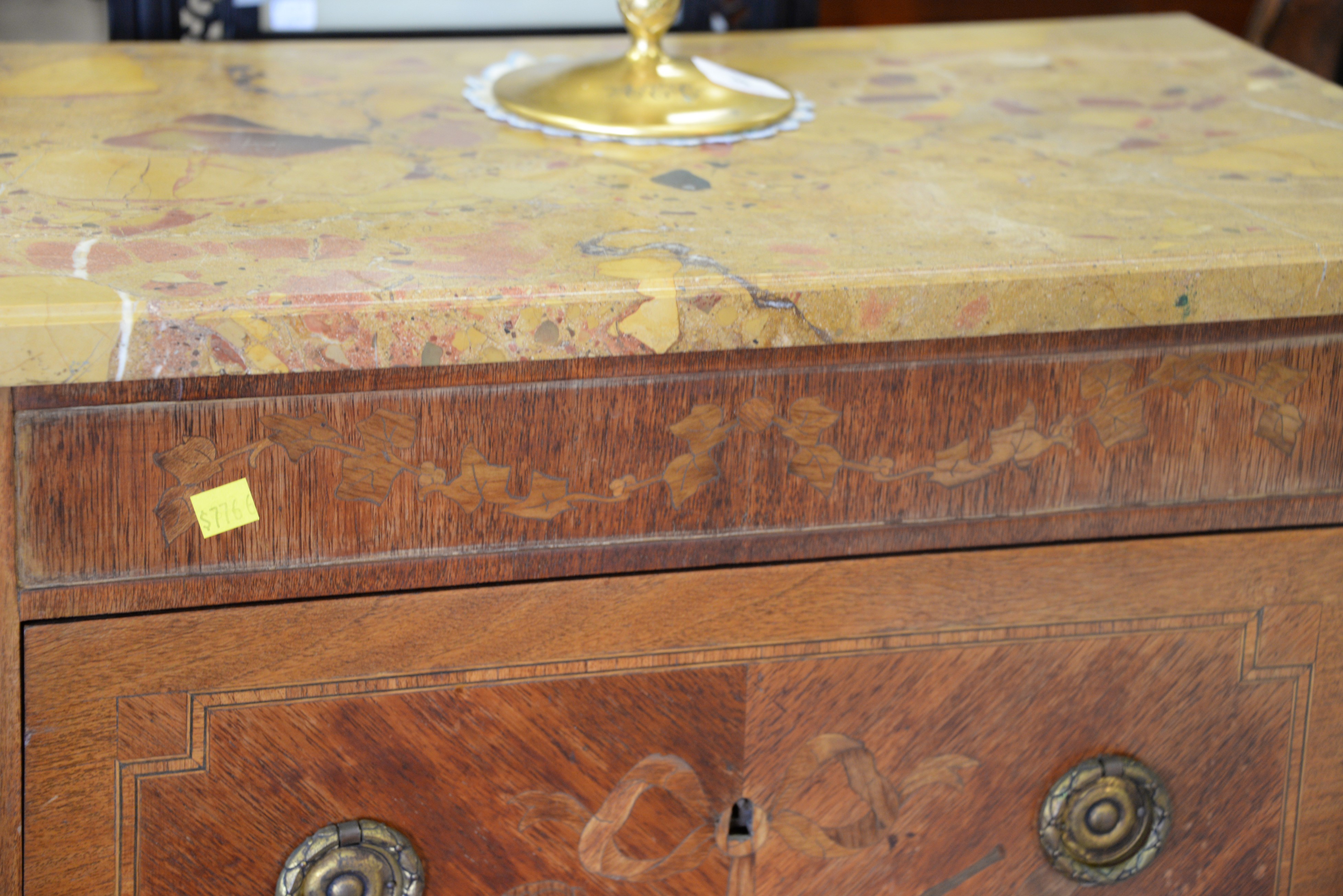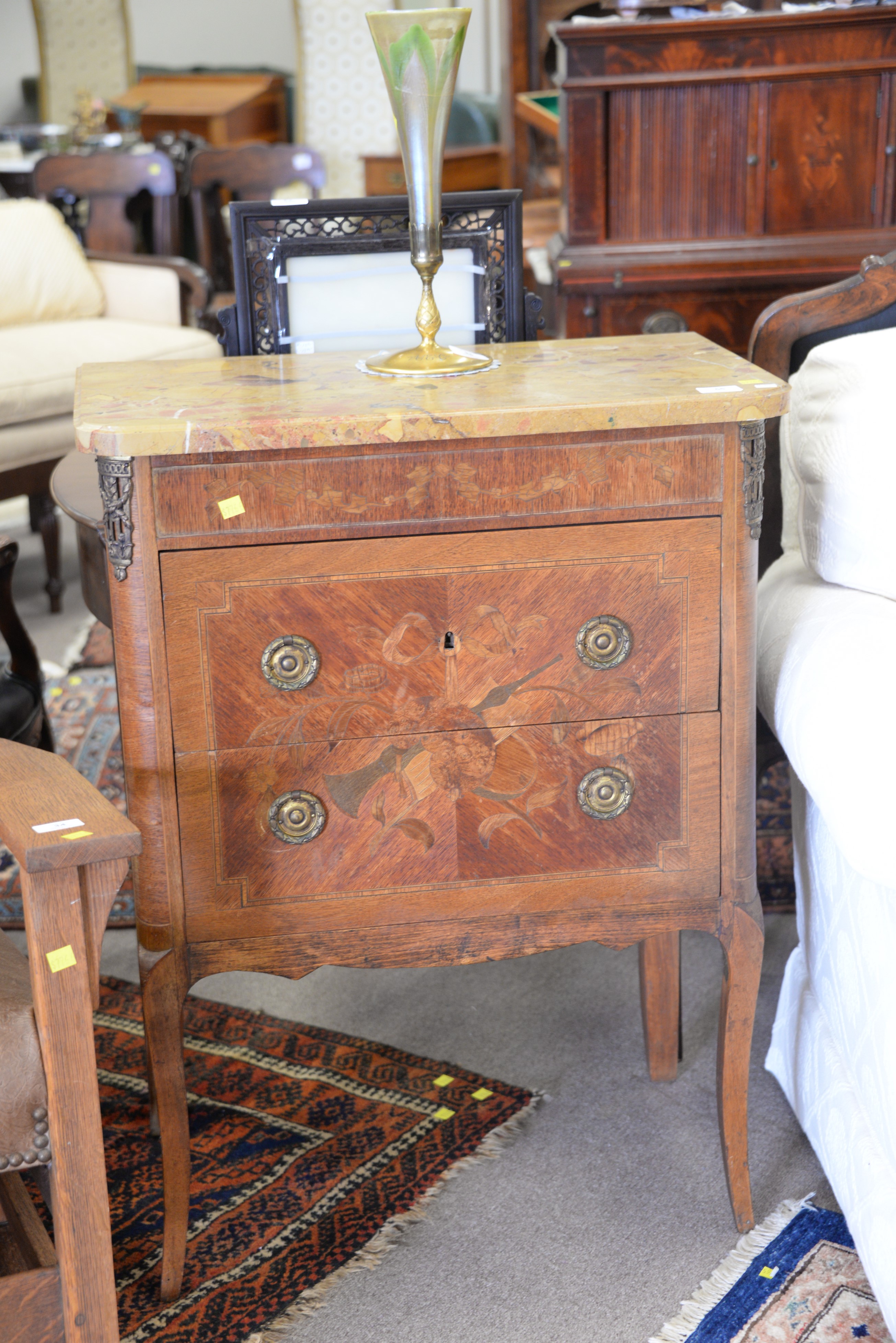 Louis XV style marble top commode, made in France. ht. 34 in. wd. 26 in. dp. 15 in.