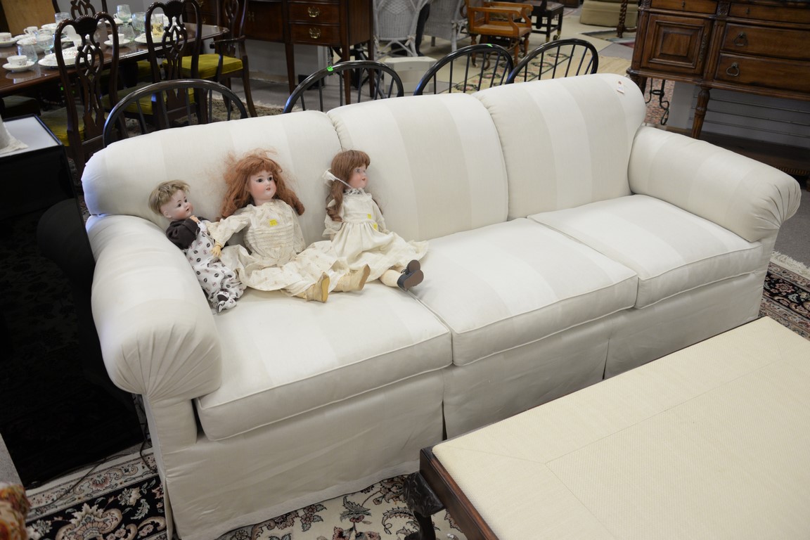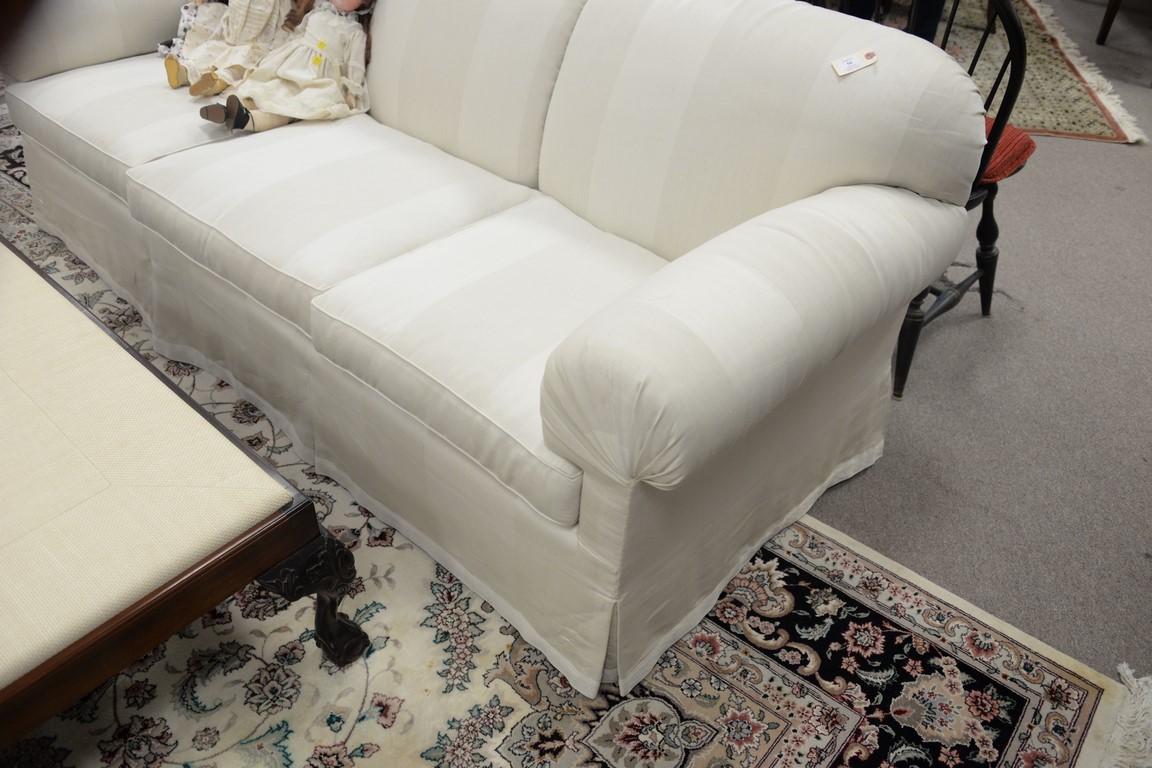 Off white upholstered custom sofa having rolled arms and back, very clean. lg. 88in.