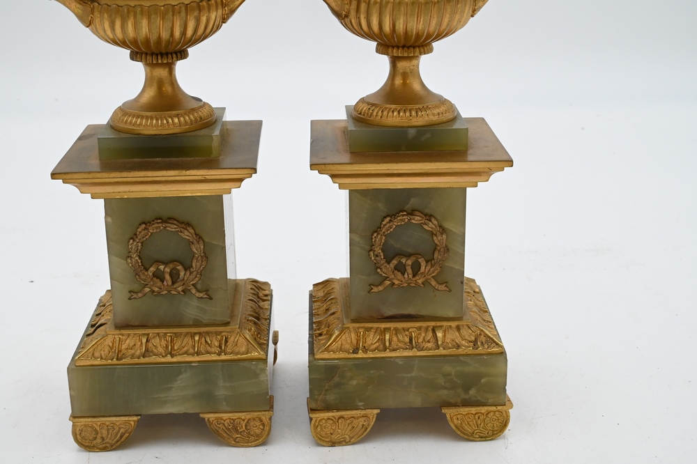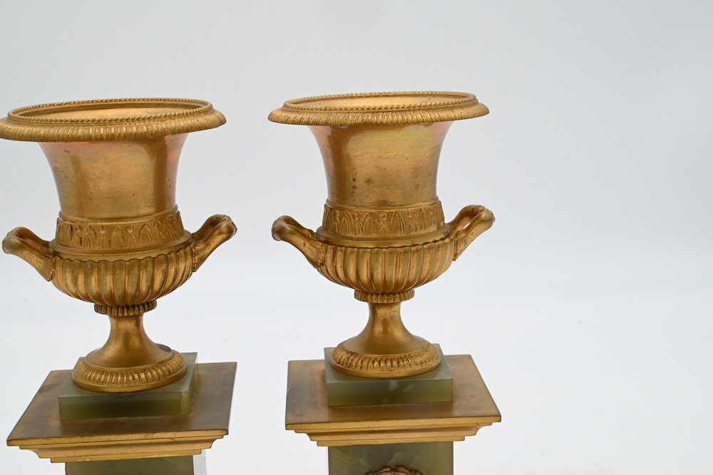 Pair of Onyx and Bronze Urns, bronze urns resting on green onyx pedestal bases having bronze mounts, height 9 inches.