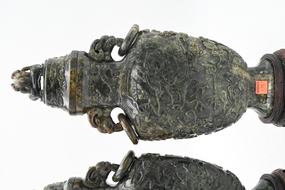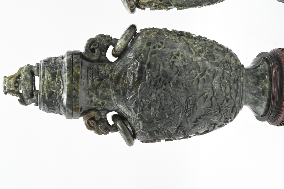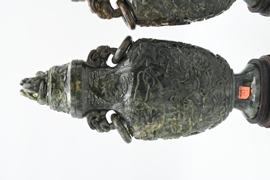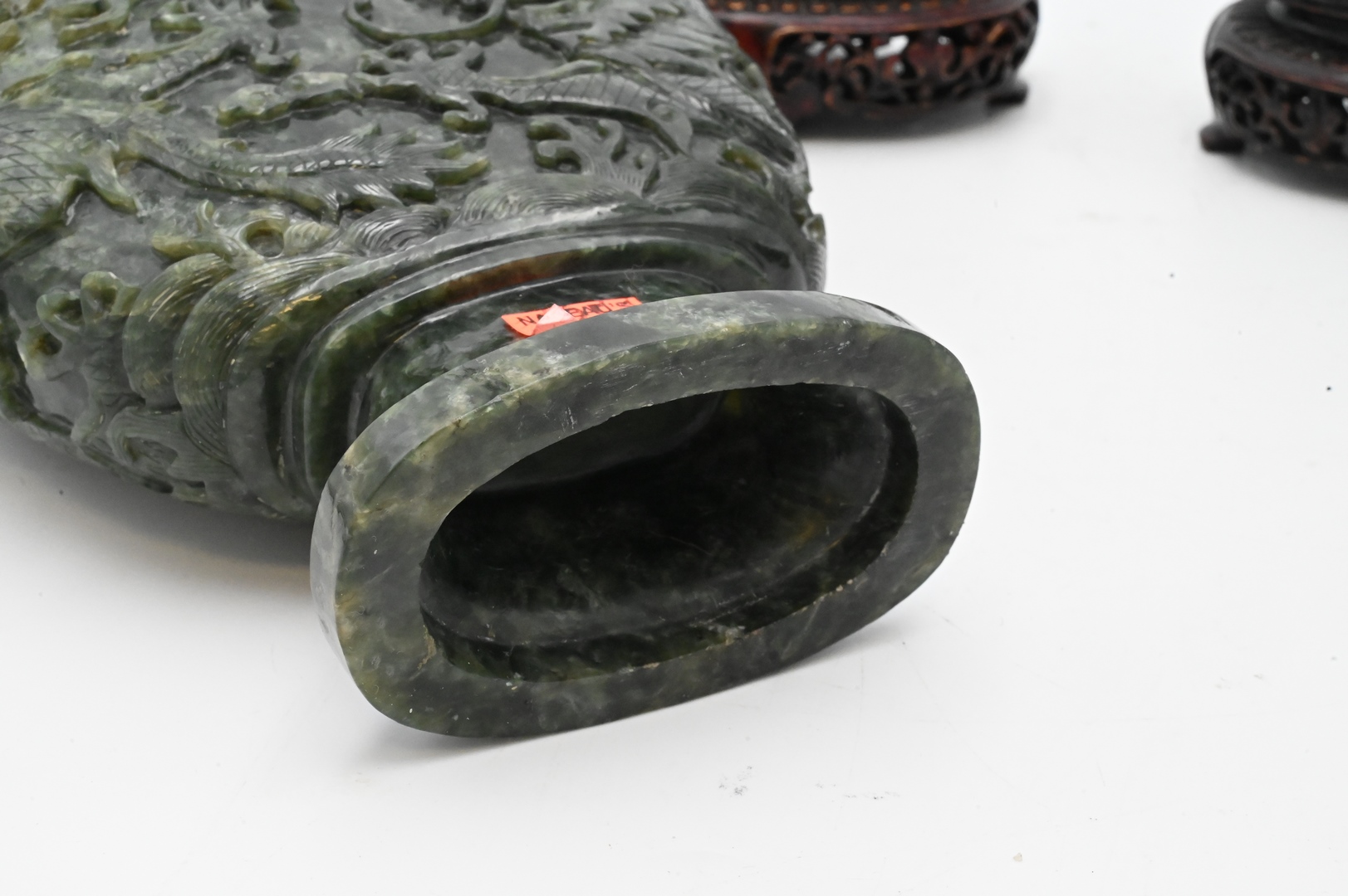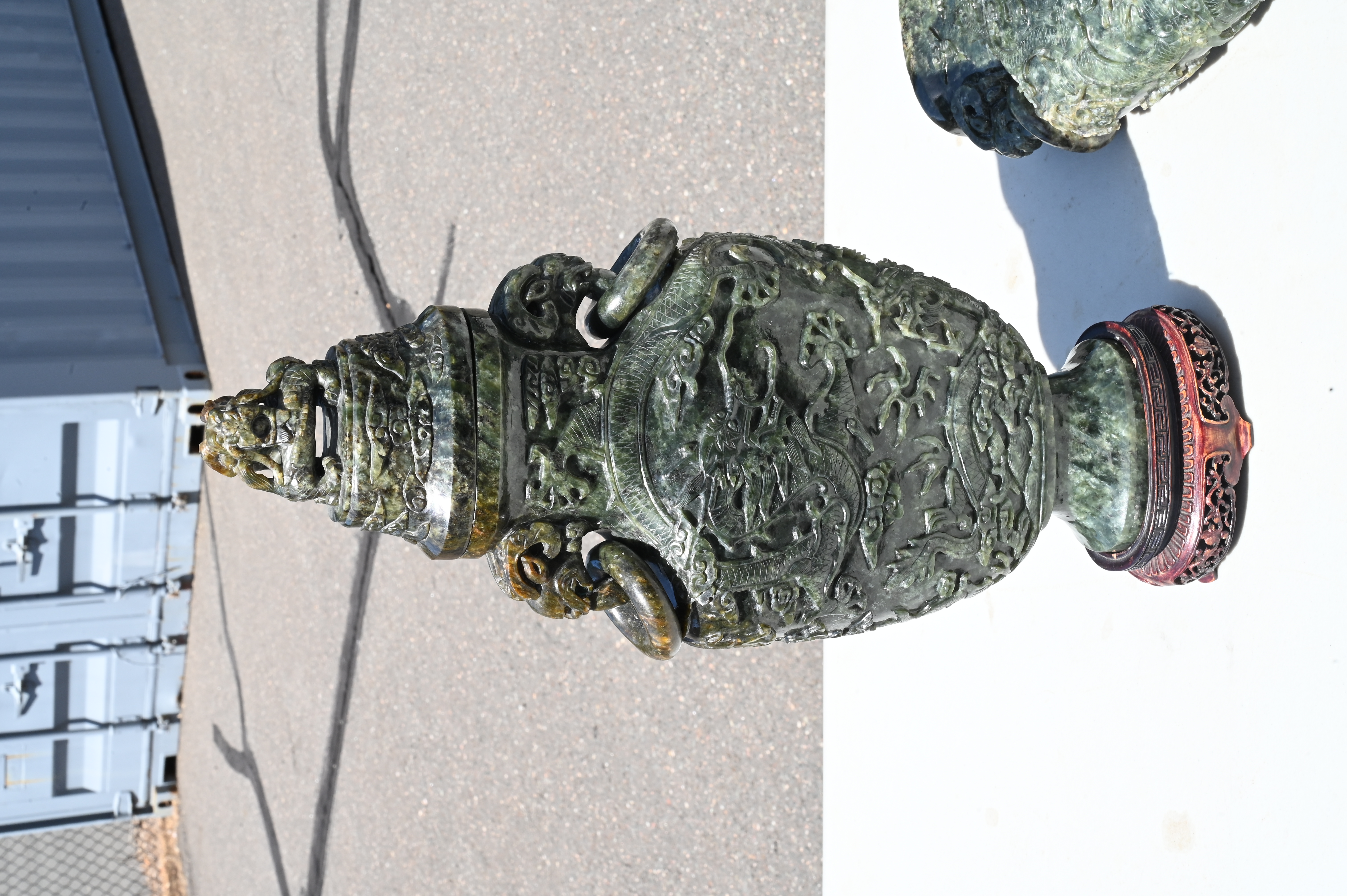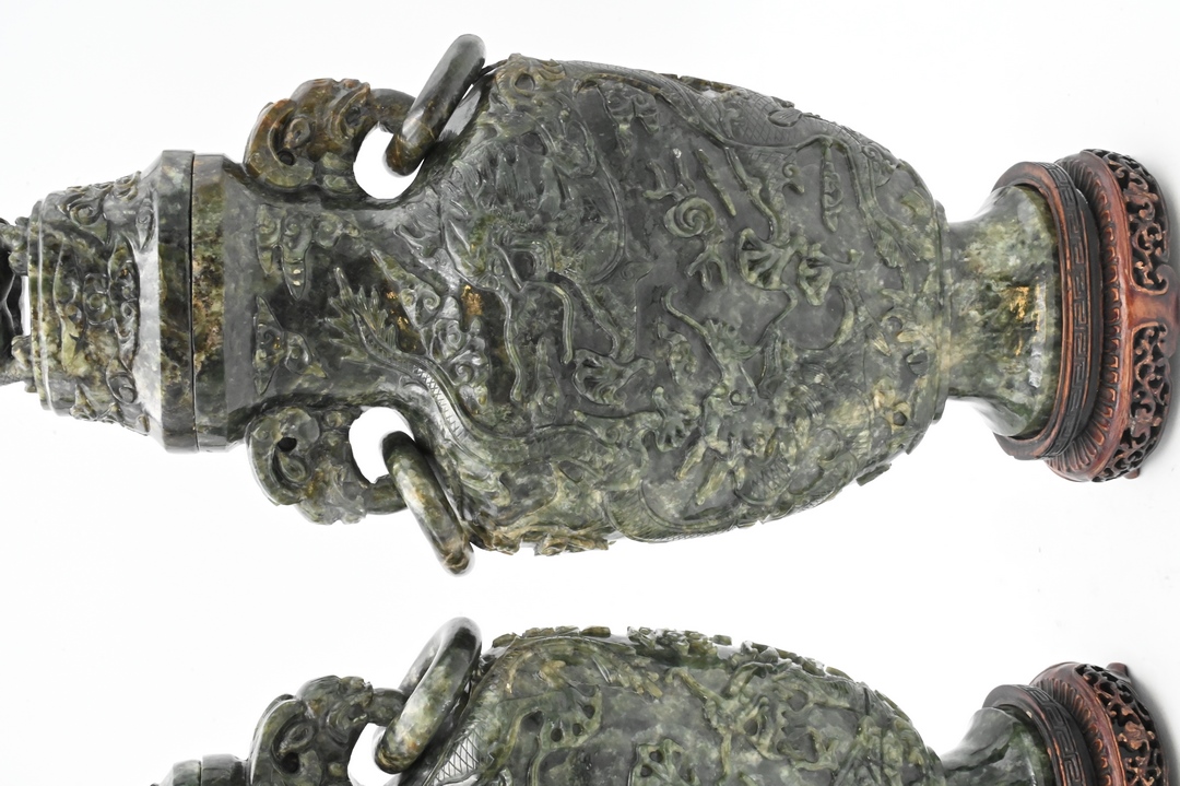 Pair of Spinach Jade Covered Vases, having dragons, along with wood stands, height 16 inches, width 7 inches.