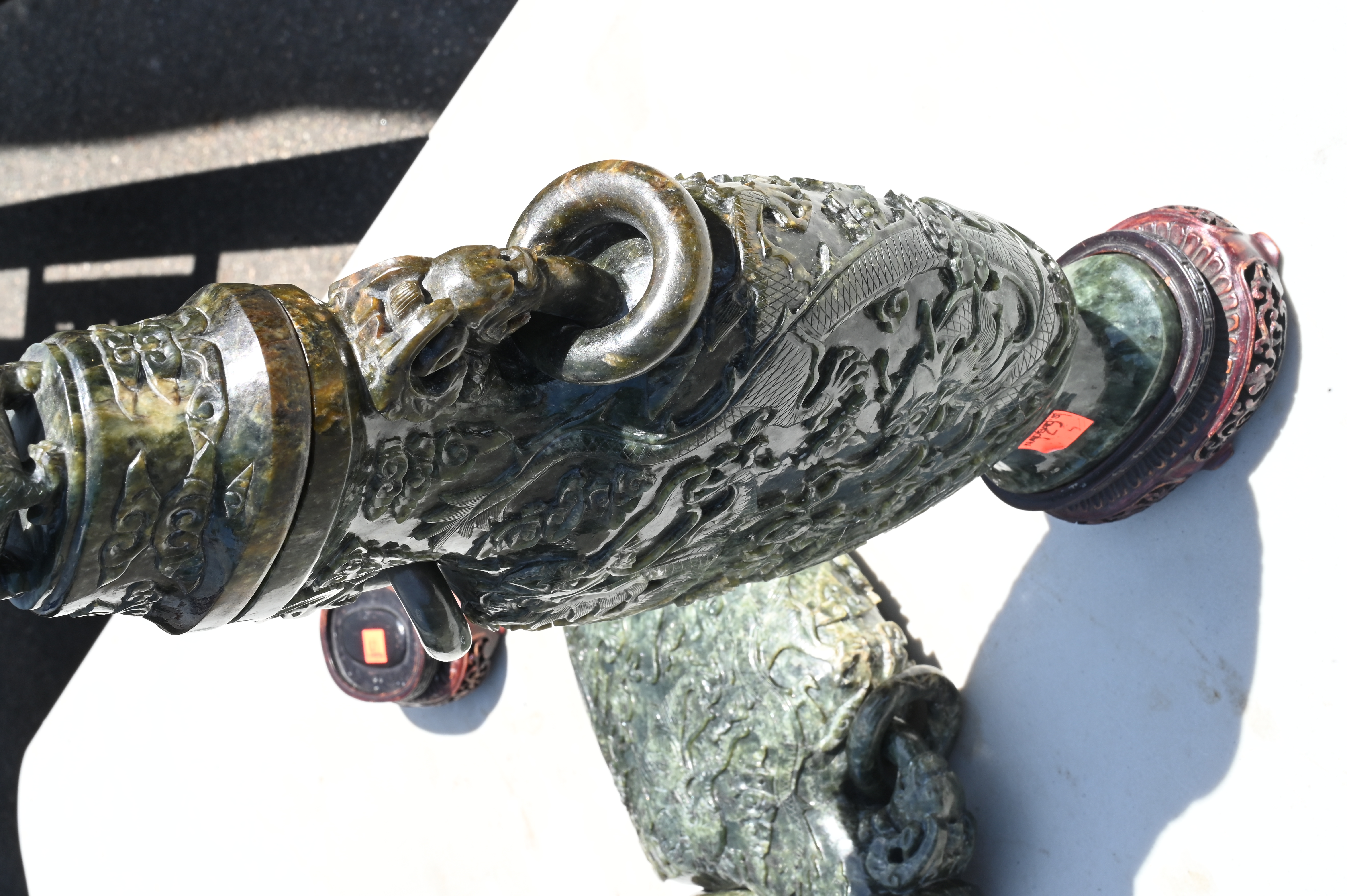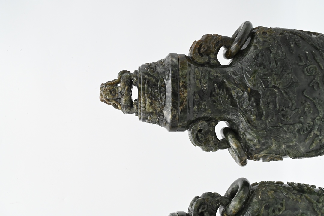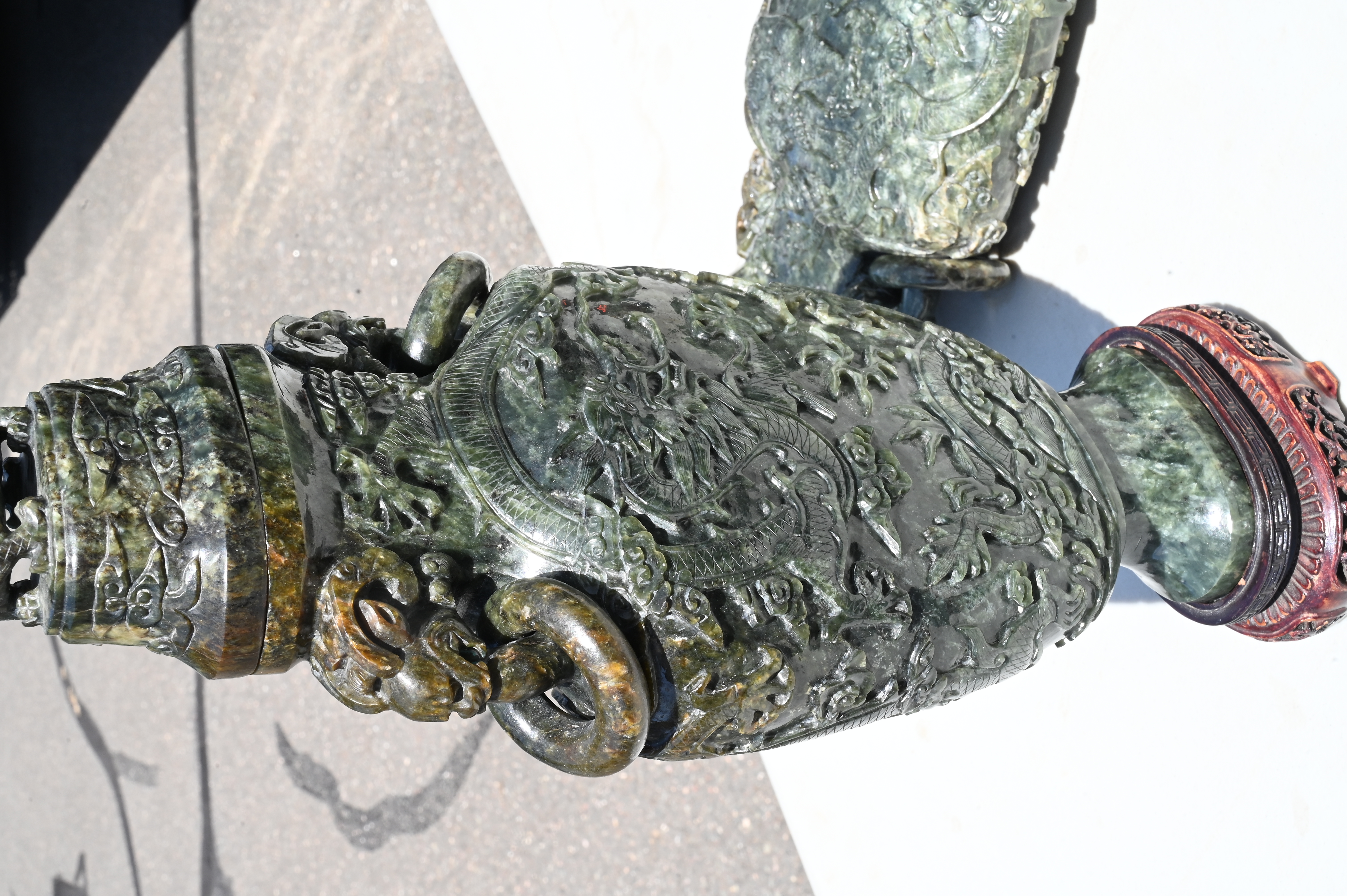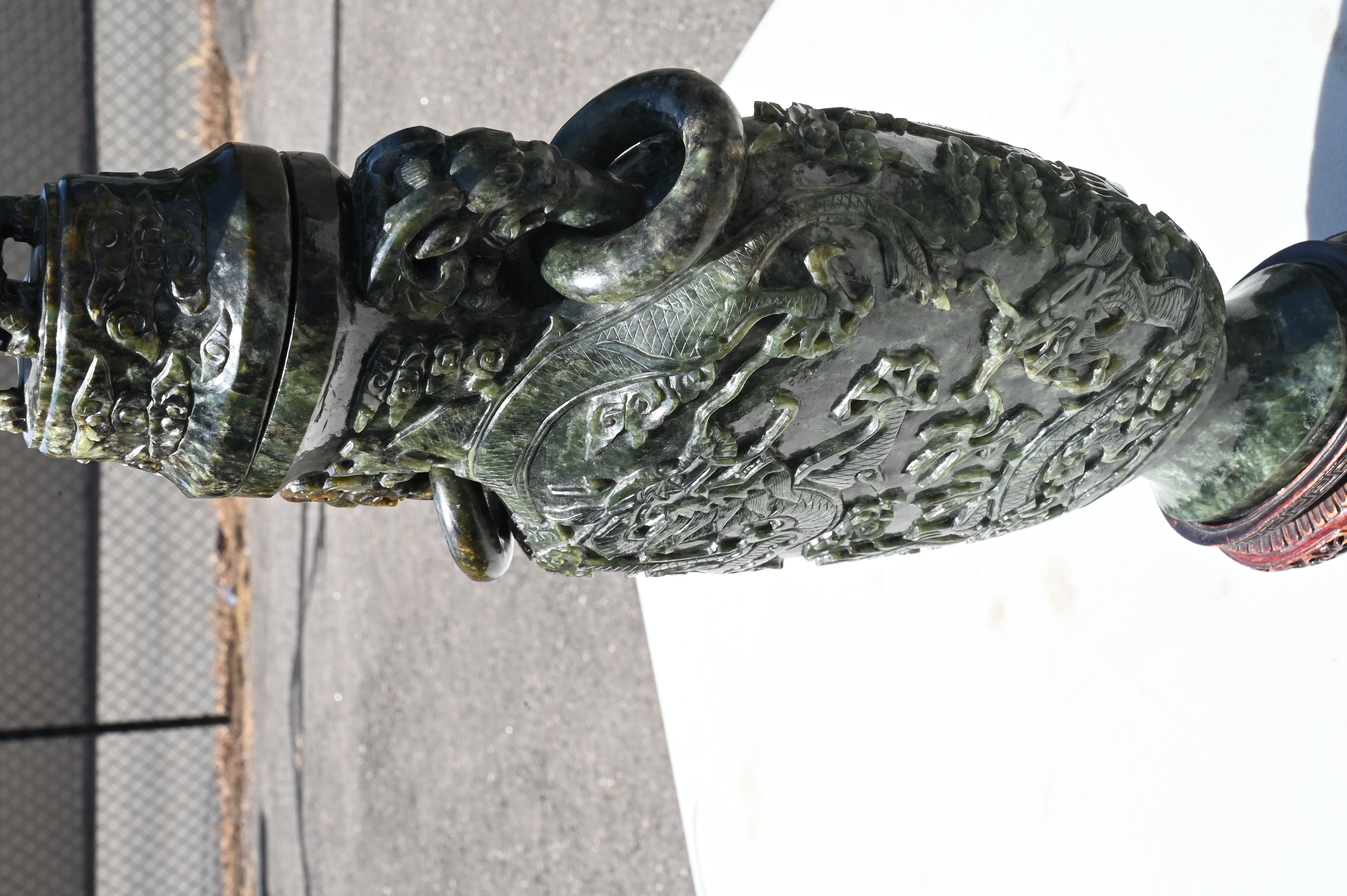 Pair of Spinach Jade Covered Vases, having dragons, along with wood stands, height 16 inches, width 7 inches.