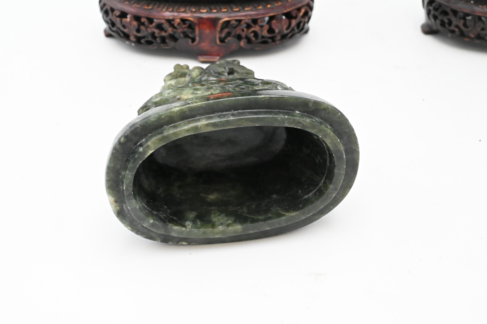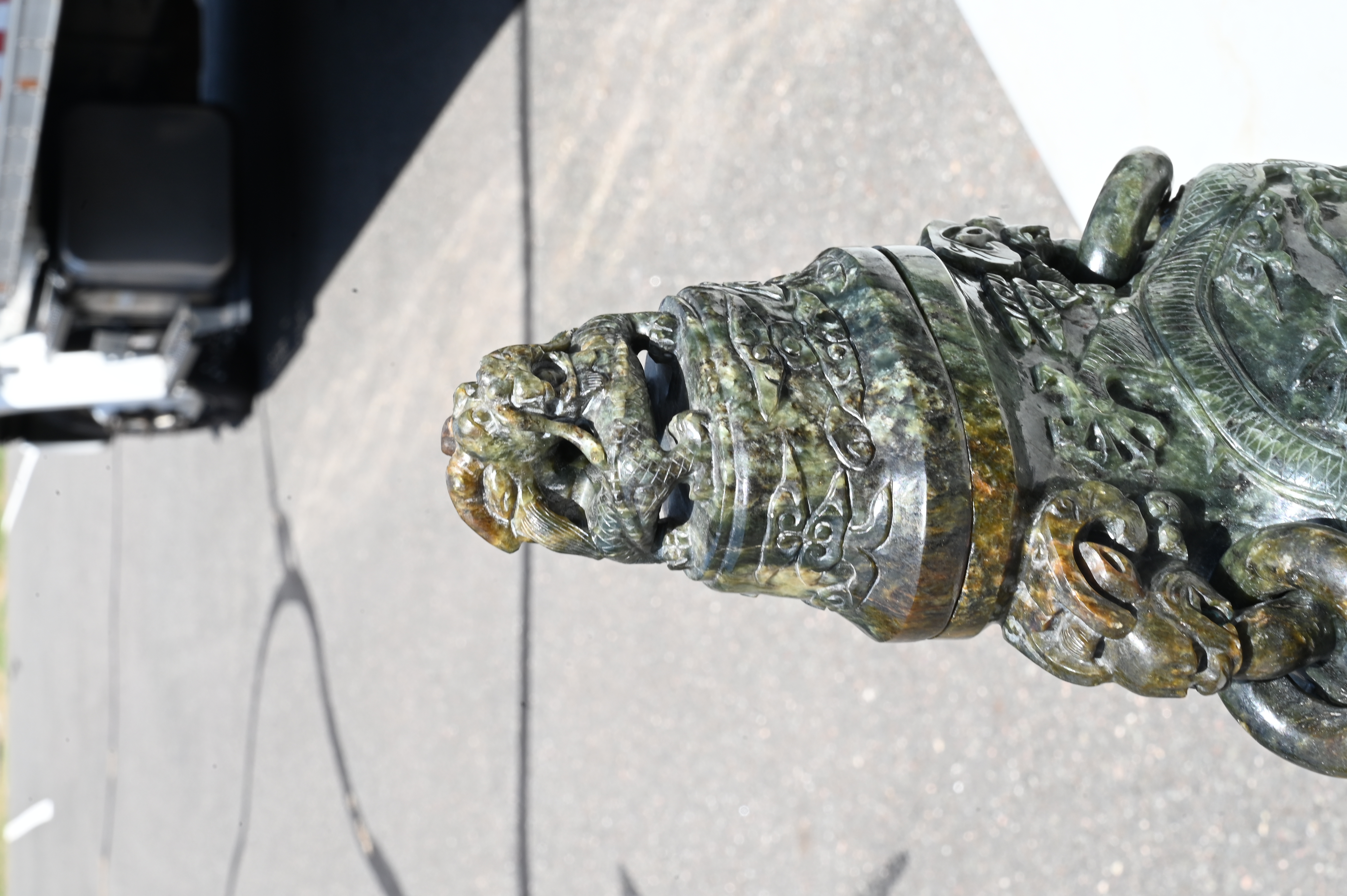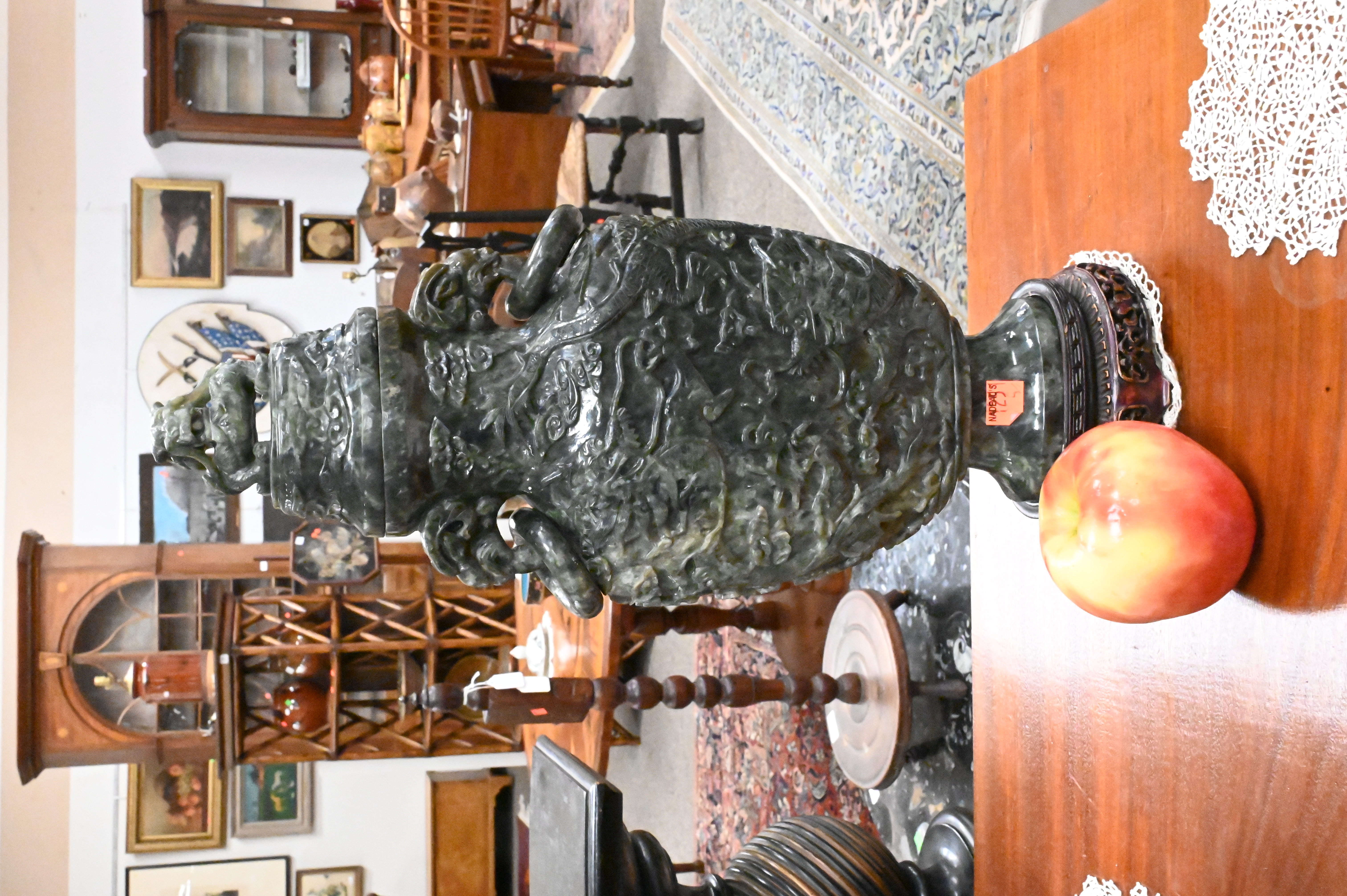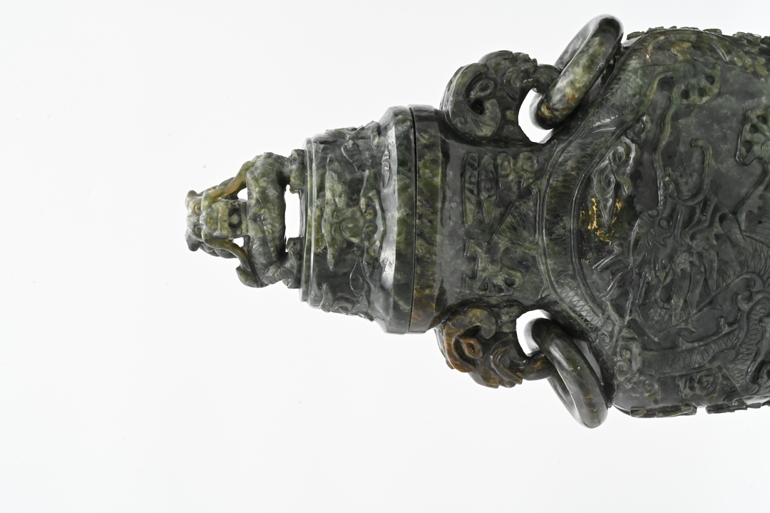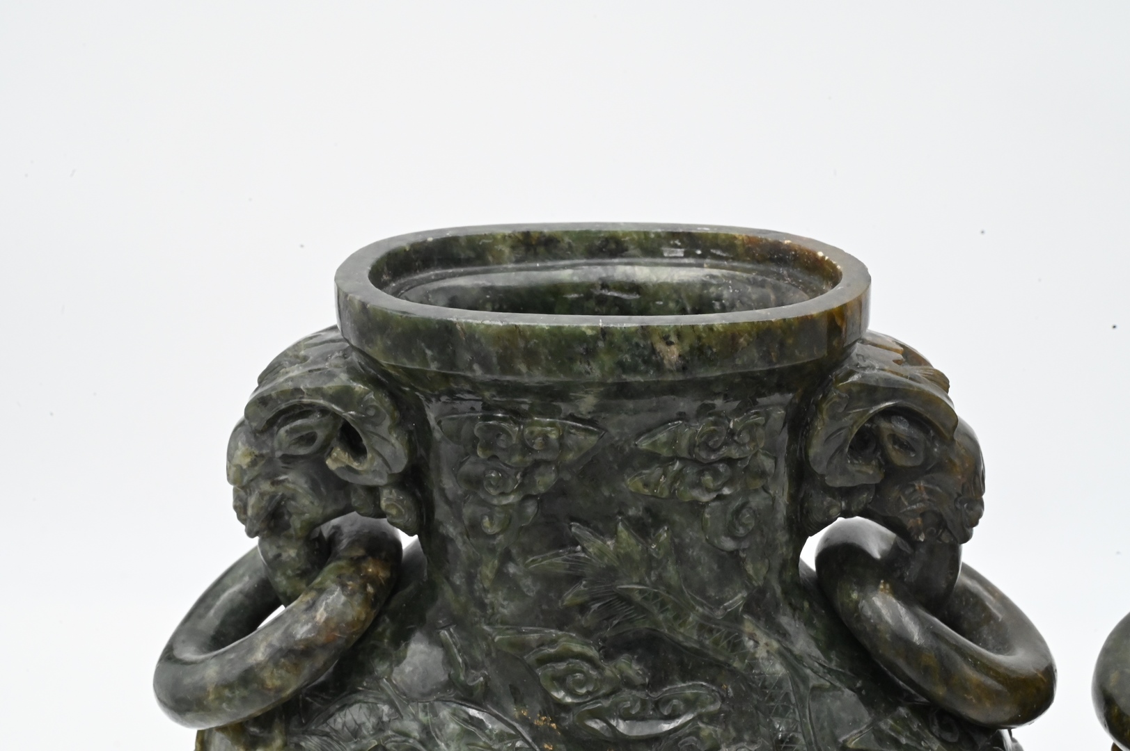 Pair of Spinach Jade Covered Vases, having dragons, along with wood stands, height 16 inches, width 7 inches.
