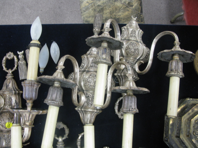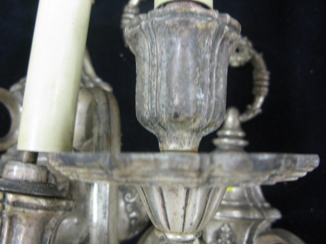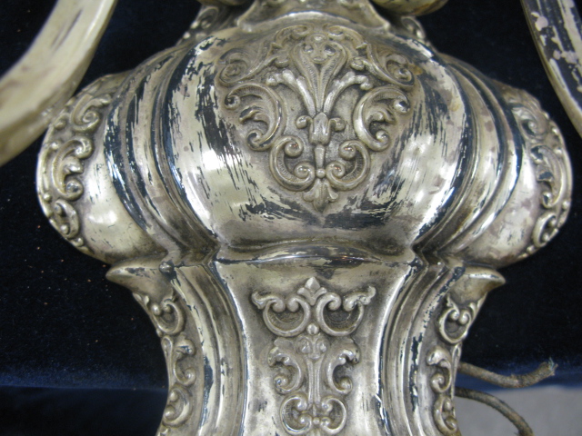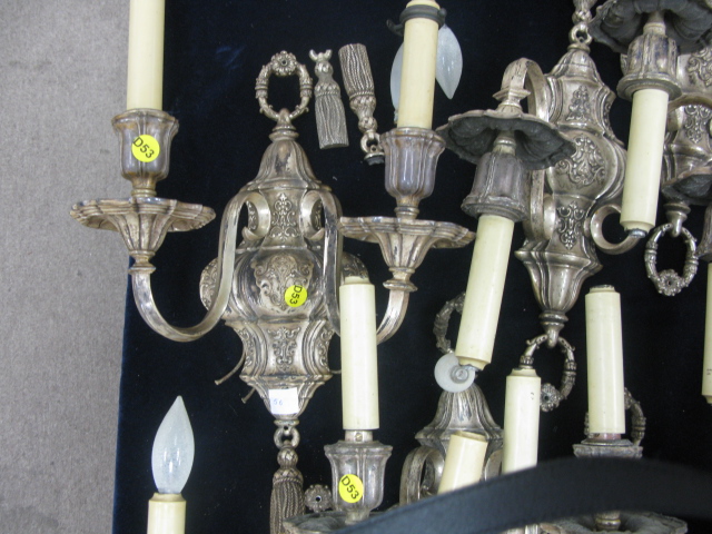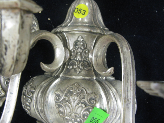 Set of six silver plated double candelabra, marked with C inside of a triangle with tassels on bottom, two tassels disconnected