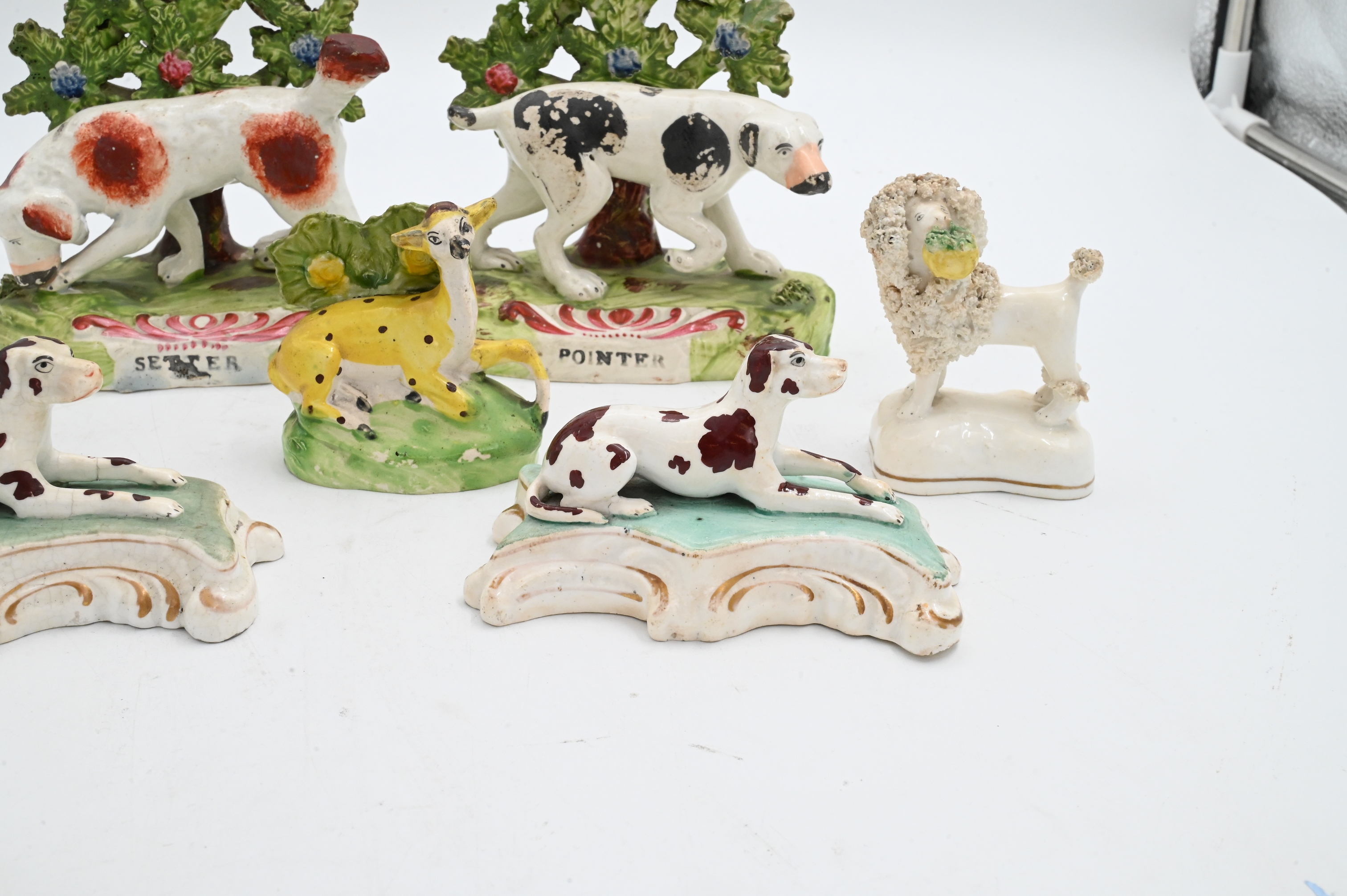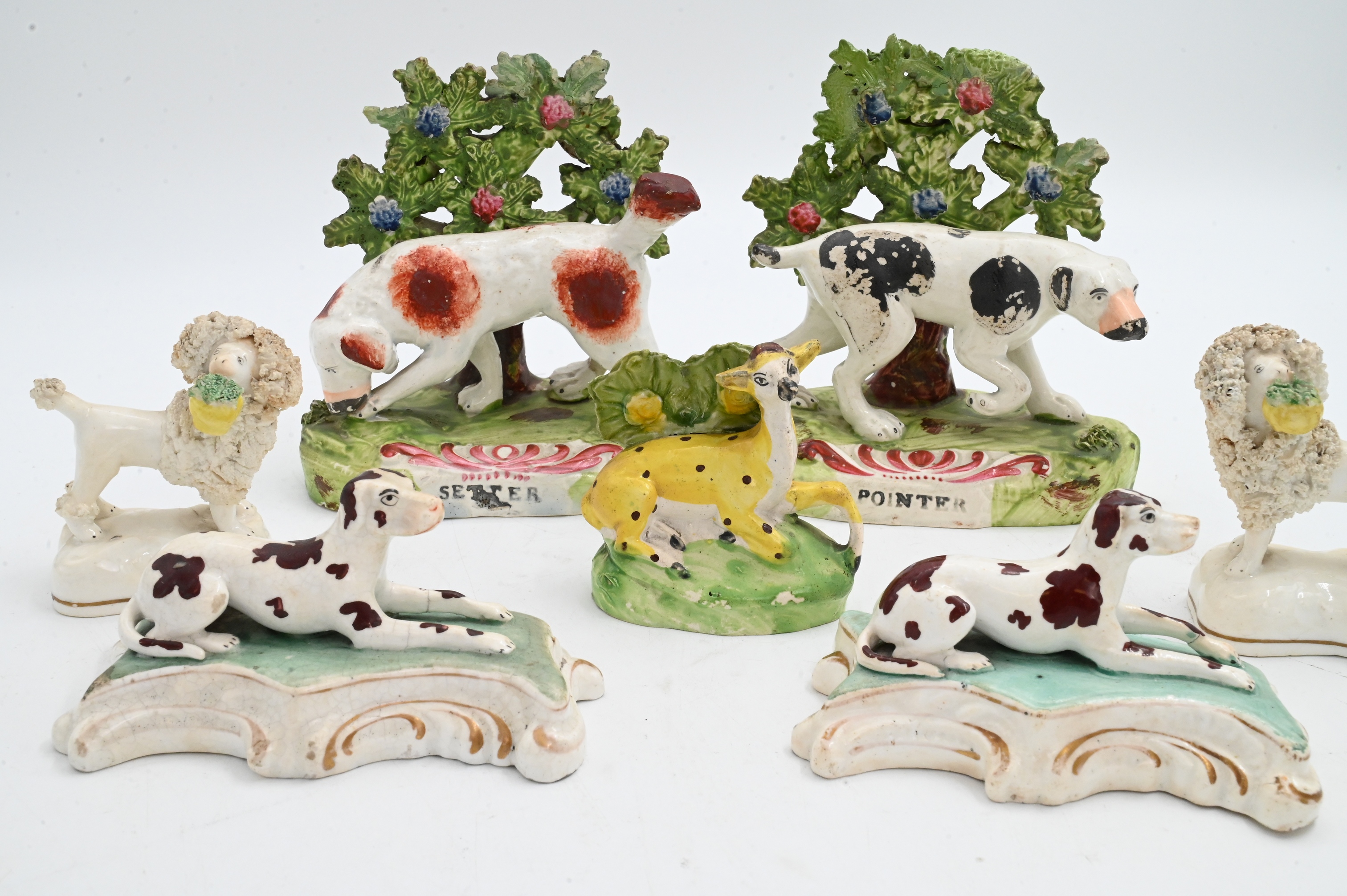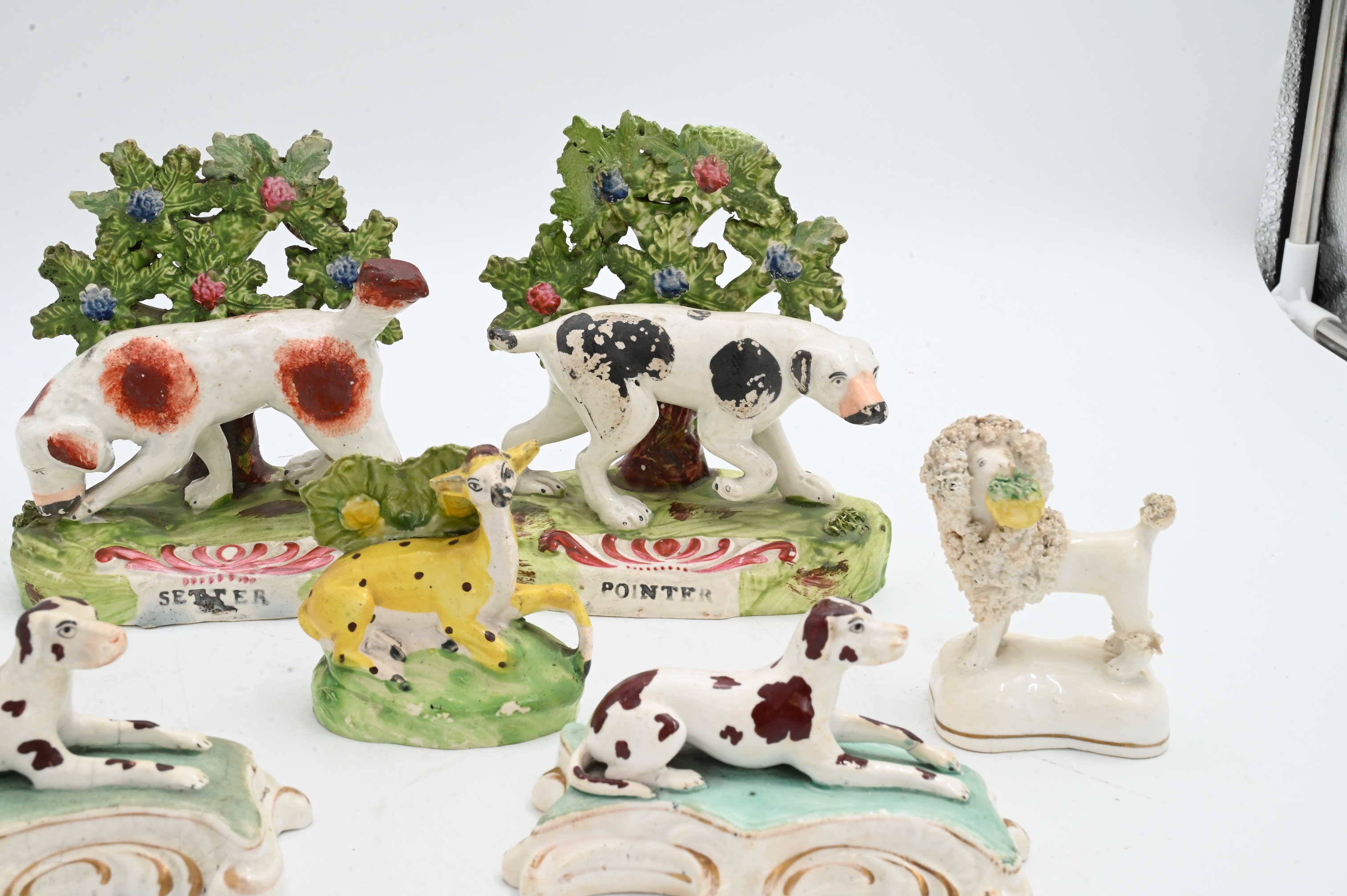 to include pair of English setter and English pointer dogs in front of leaf balayage, pair of small poodles with flower pots in their mouths, pair of recumbent spotted dogs on scrolling base, along with yellow painted deer in front of bush, 19th century