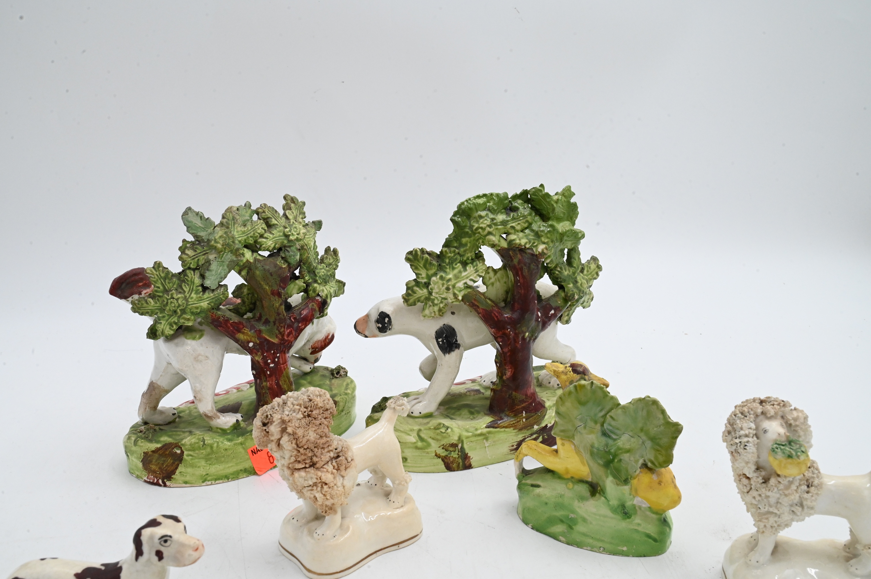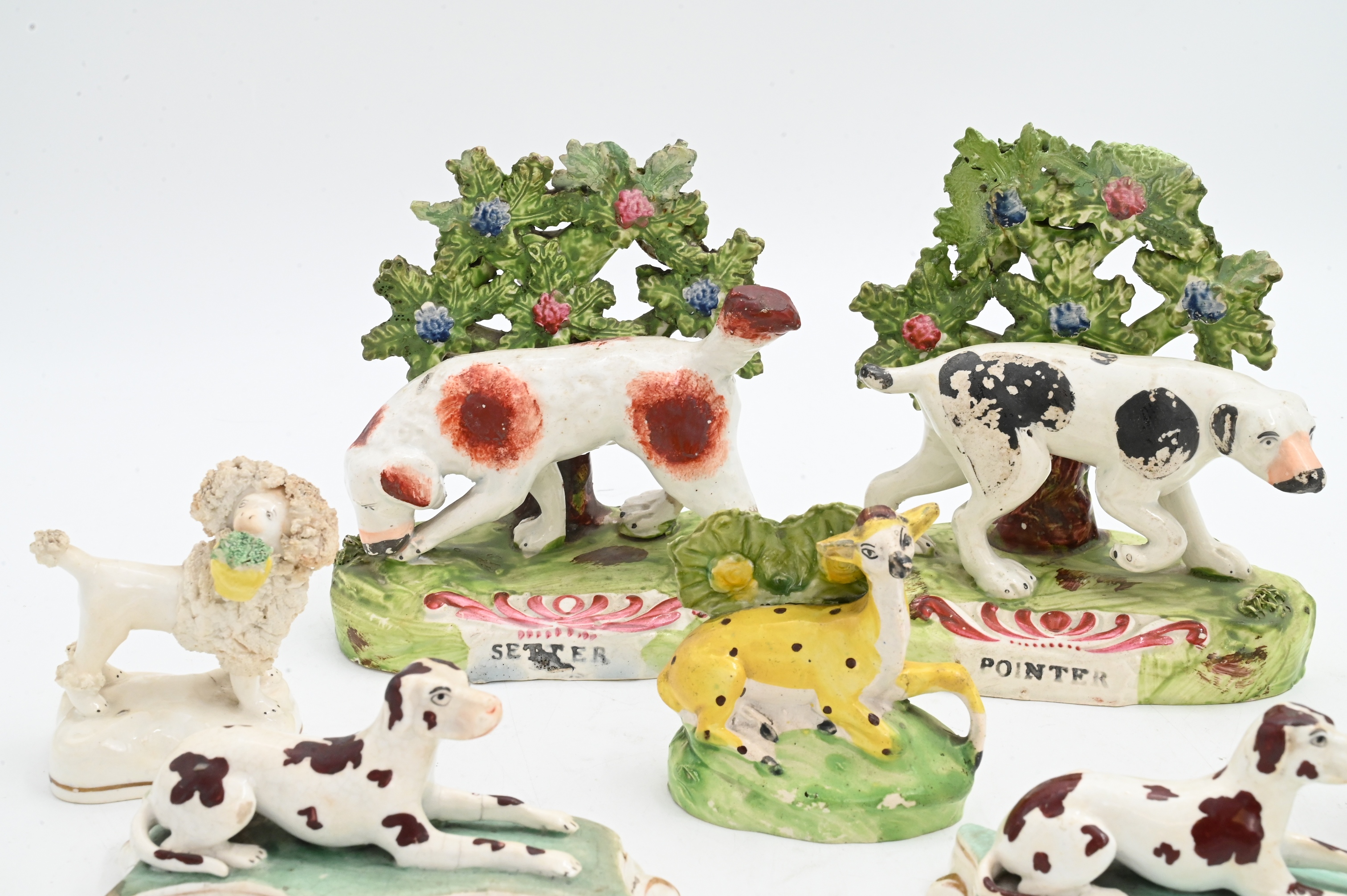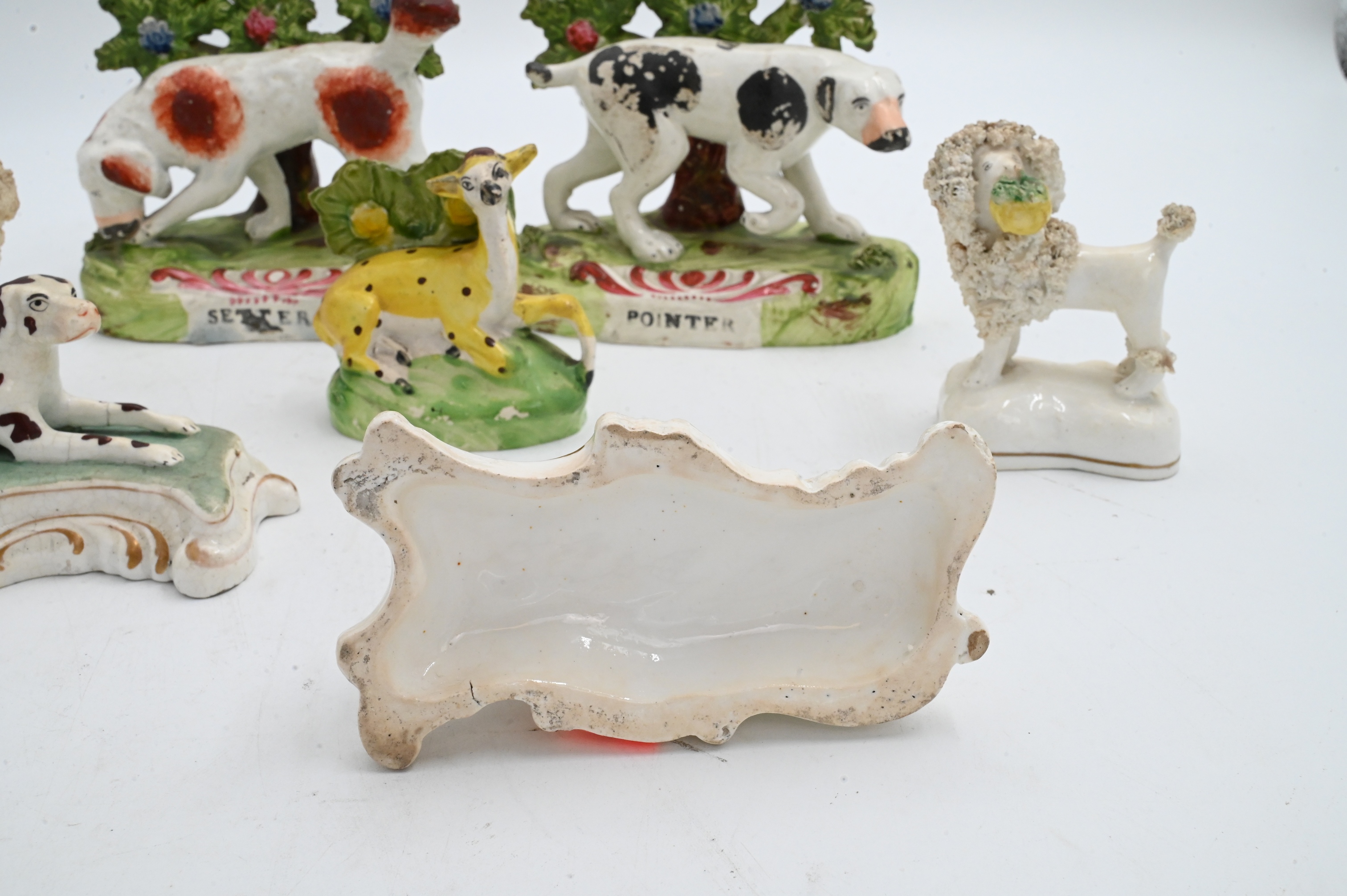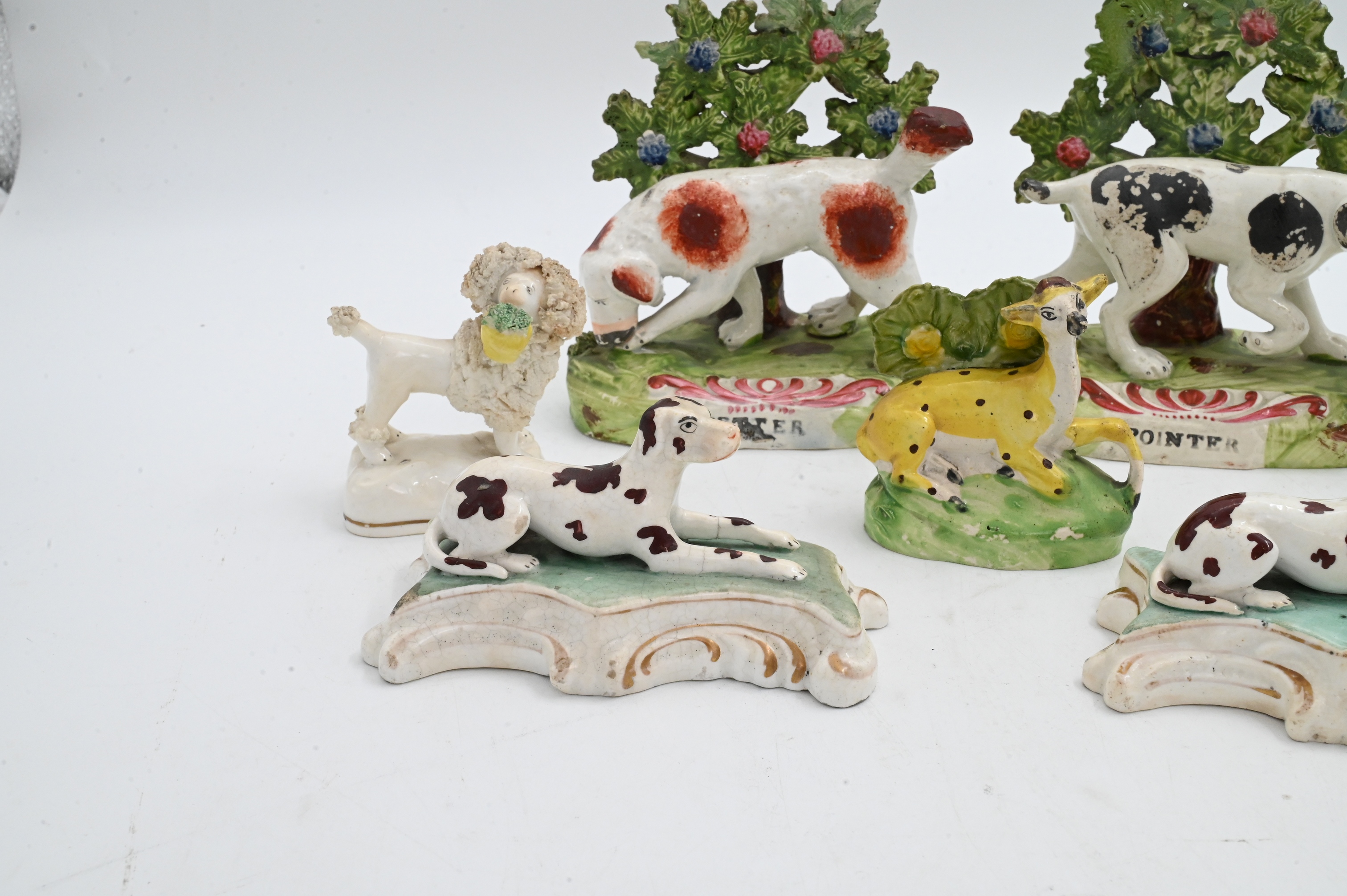 to include pair of English setter and English pointer dogs in front of leaf balayage, pair of small poodles with flower pots in their mouths, pair of recumbent spotted dogs on scrolling base, along with yellow painted deer in front of bush, 19th century