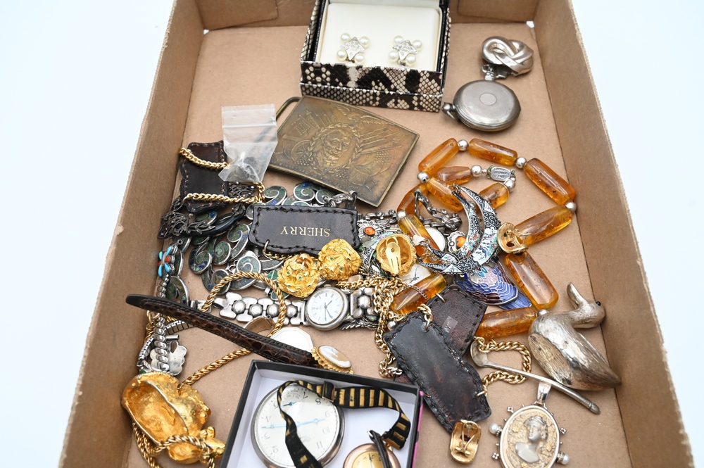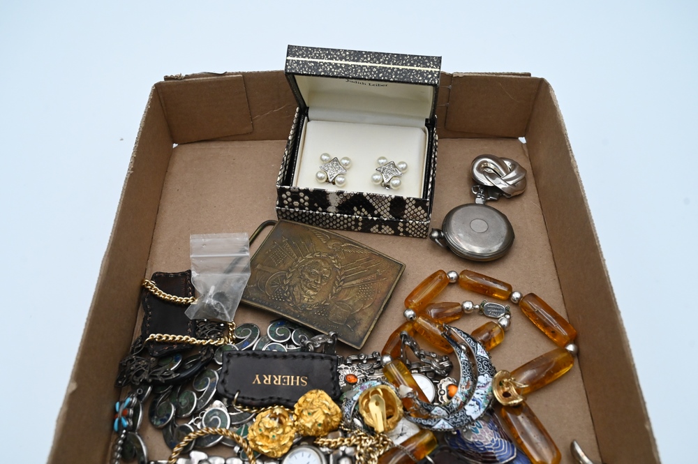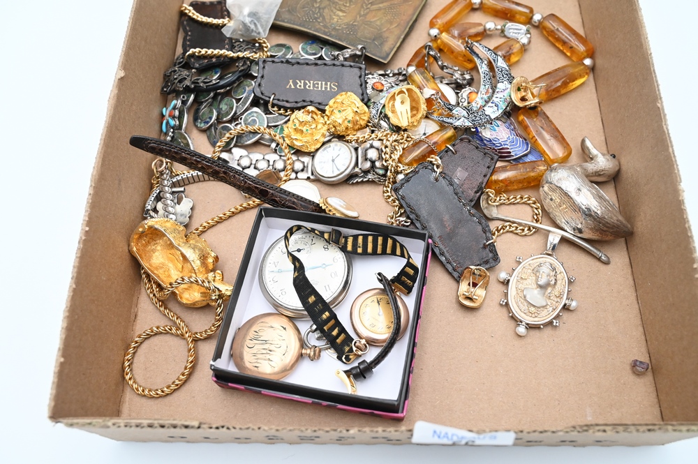 Tray Lot of Silver Jewelry, to include wristwatches, several with stone mounted bands, pocket watches, Abe Lincoln belt buckle, amber necklace, etc.