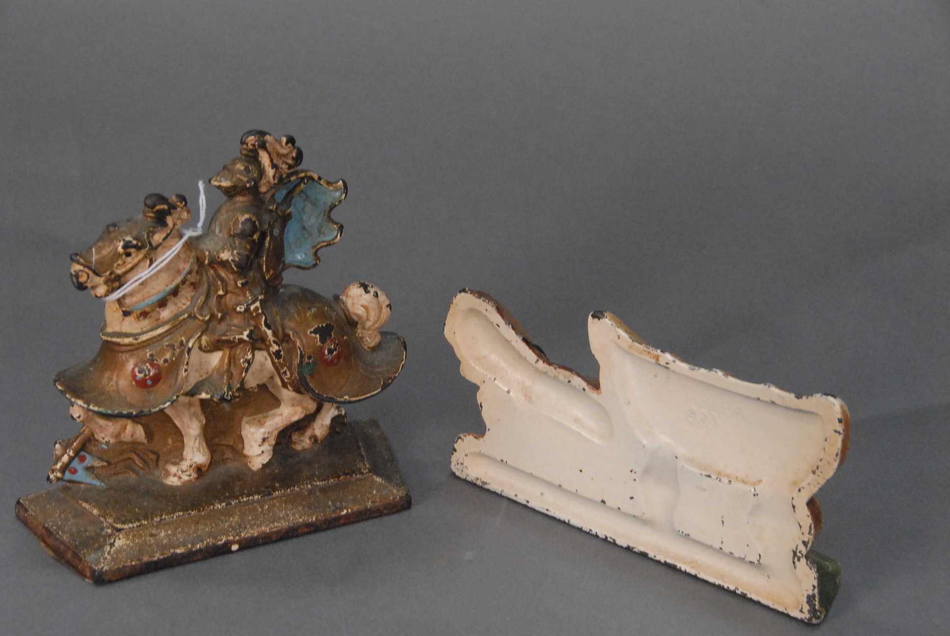Lot 56: Two iron door stops Hubly covered wagon and knight on horseback signed Gregory Allen, hts. 4 and 6.