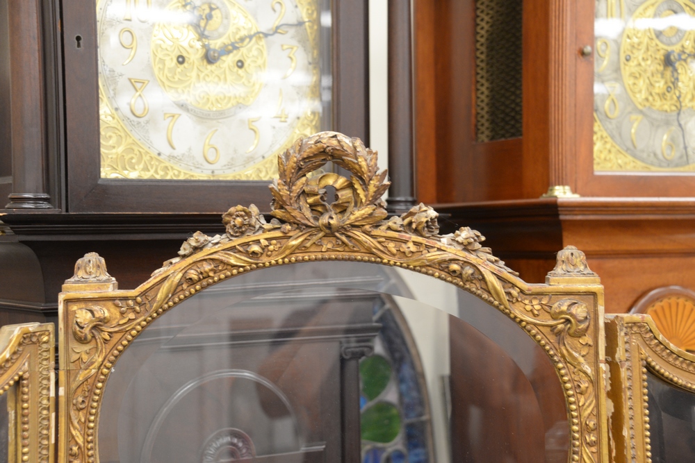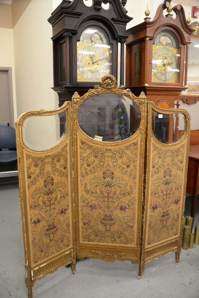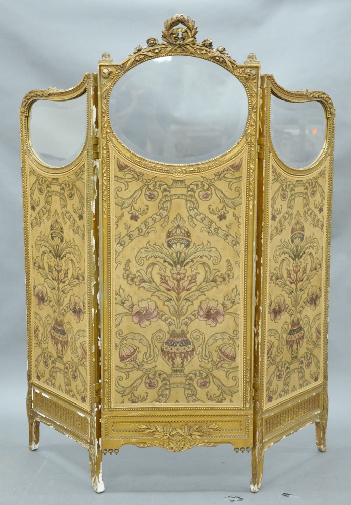 Lot 56: Upholstered Three Part Dressing Screen, having beveled glass and gilt wood frame, height 68 inches, width 58 inches.
