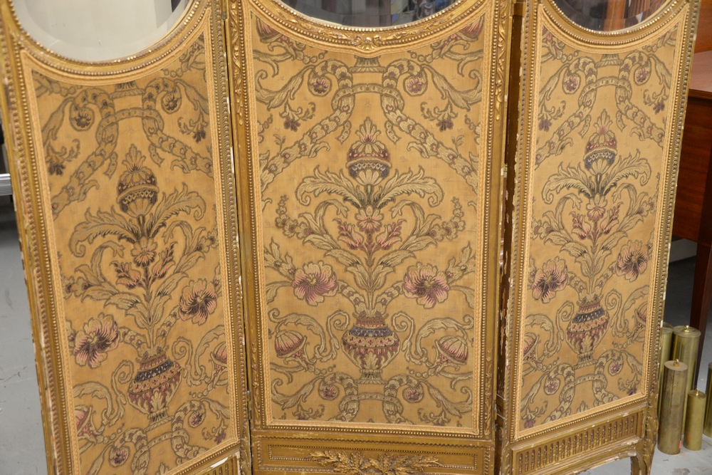 Upholstered Three Part Dressing Screen, having beveled glass and gilt wood frame, height 68 inches, width 58 inches.