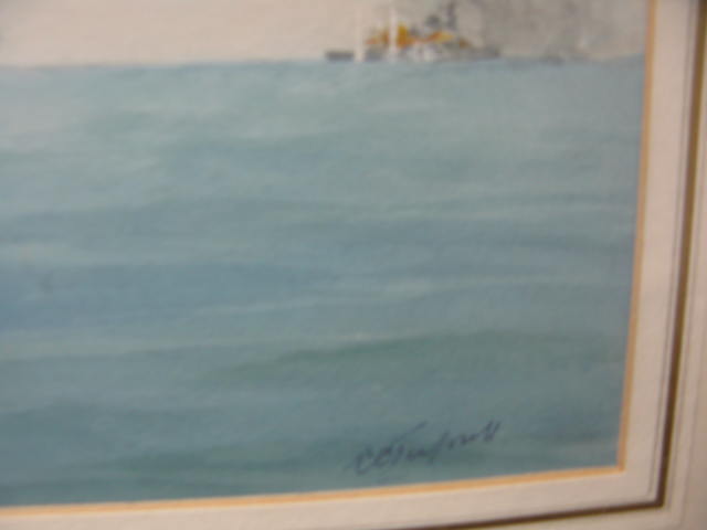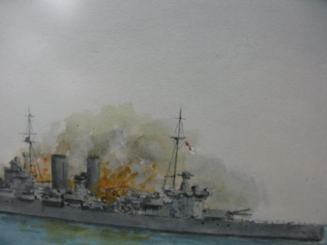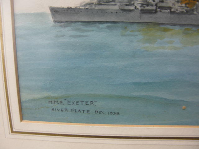 Watercolor of battleship MMS Exeter signed lower right by Commander Erik Erskine Campbell Tufnell