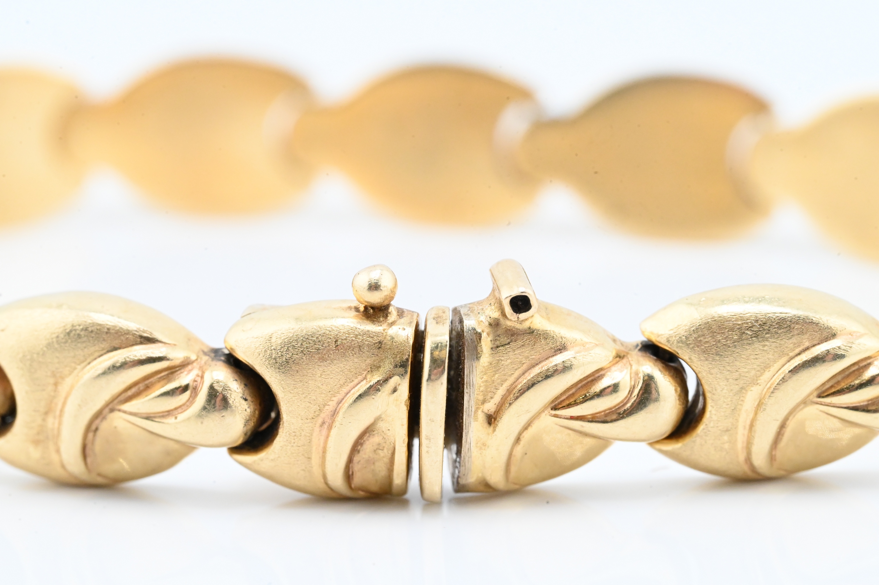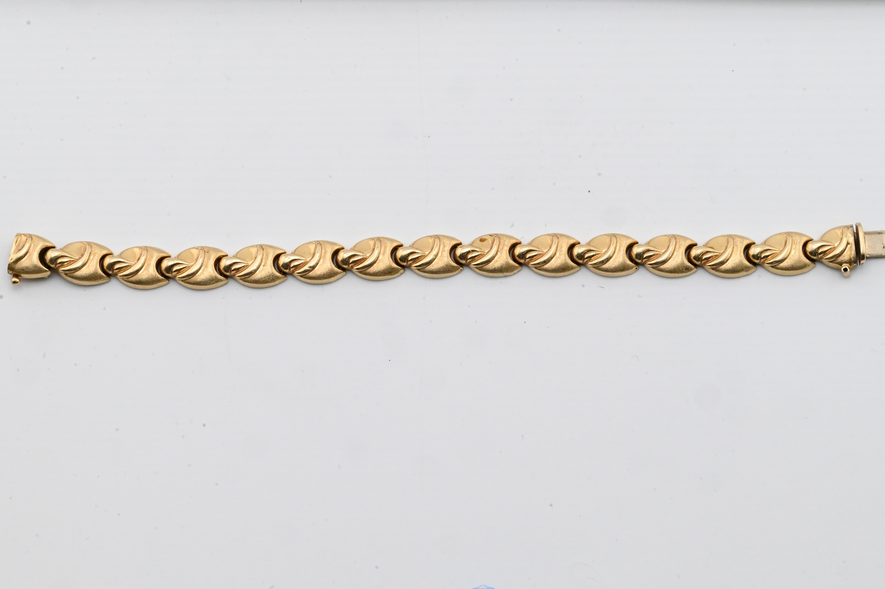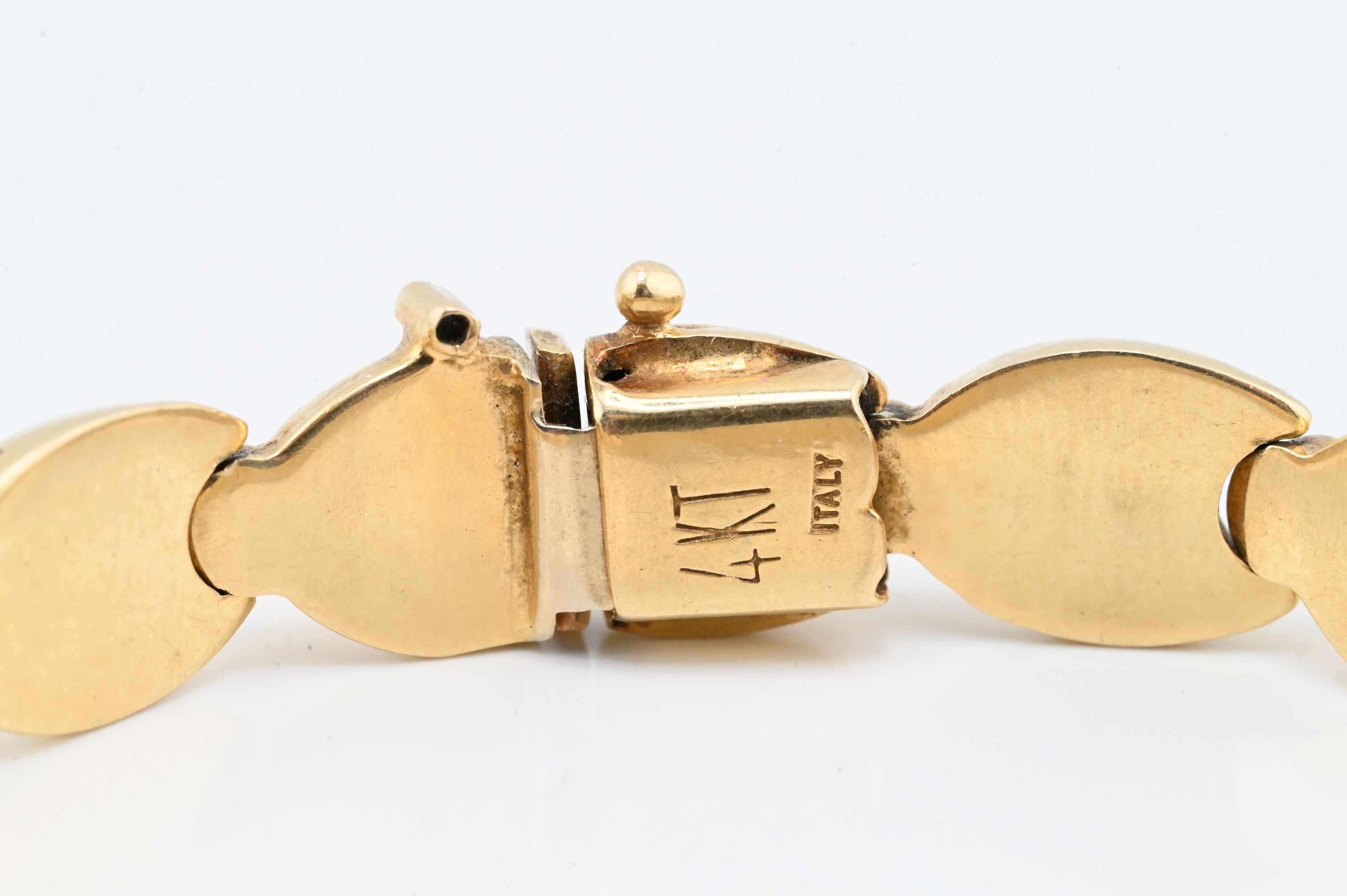 vintage Italian 14K yellow gold bracelet composed of articulated links, ach formed as a stylized sculptural scroll motif with a soft matte finish, the bracelet is fitted with an integrated clasp stamped “14K/ Italy”, along with an additional maker’s mark present on the clasp