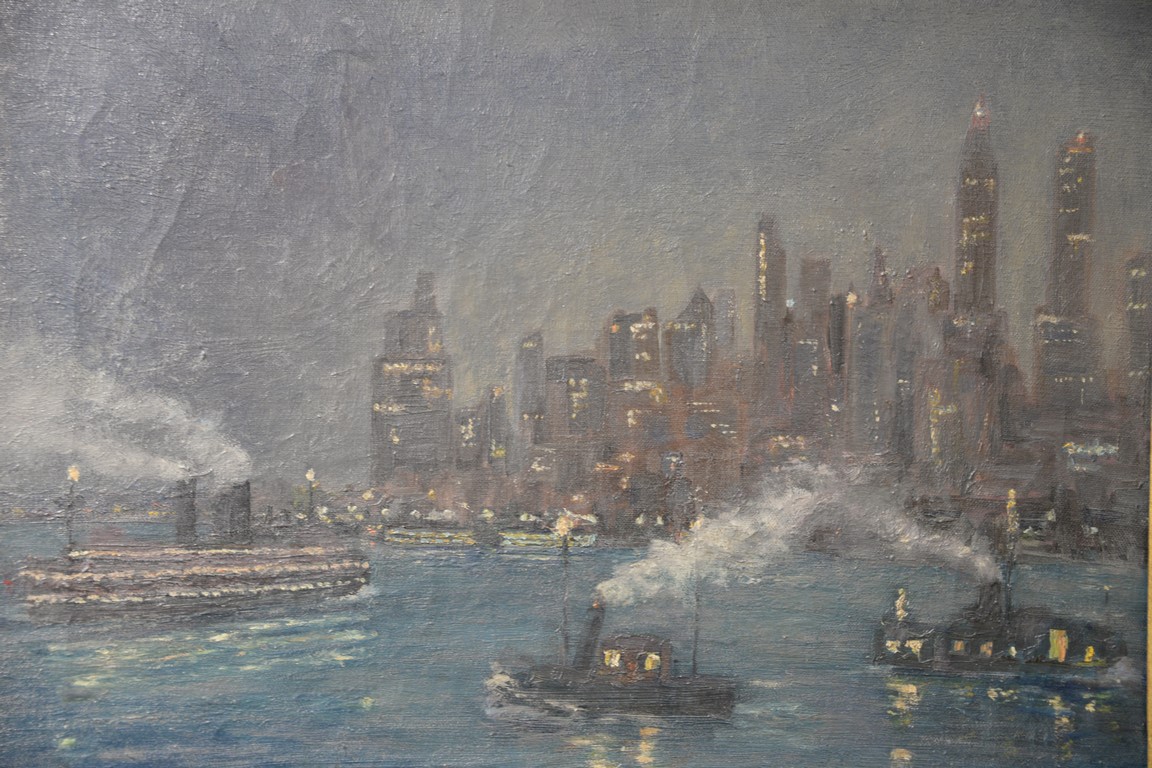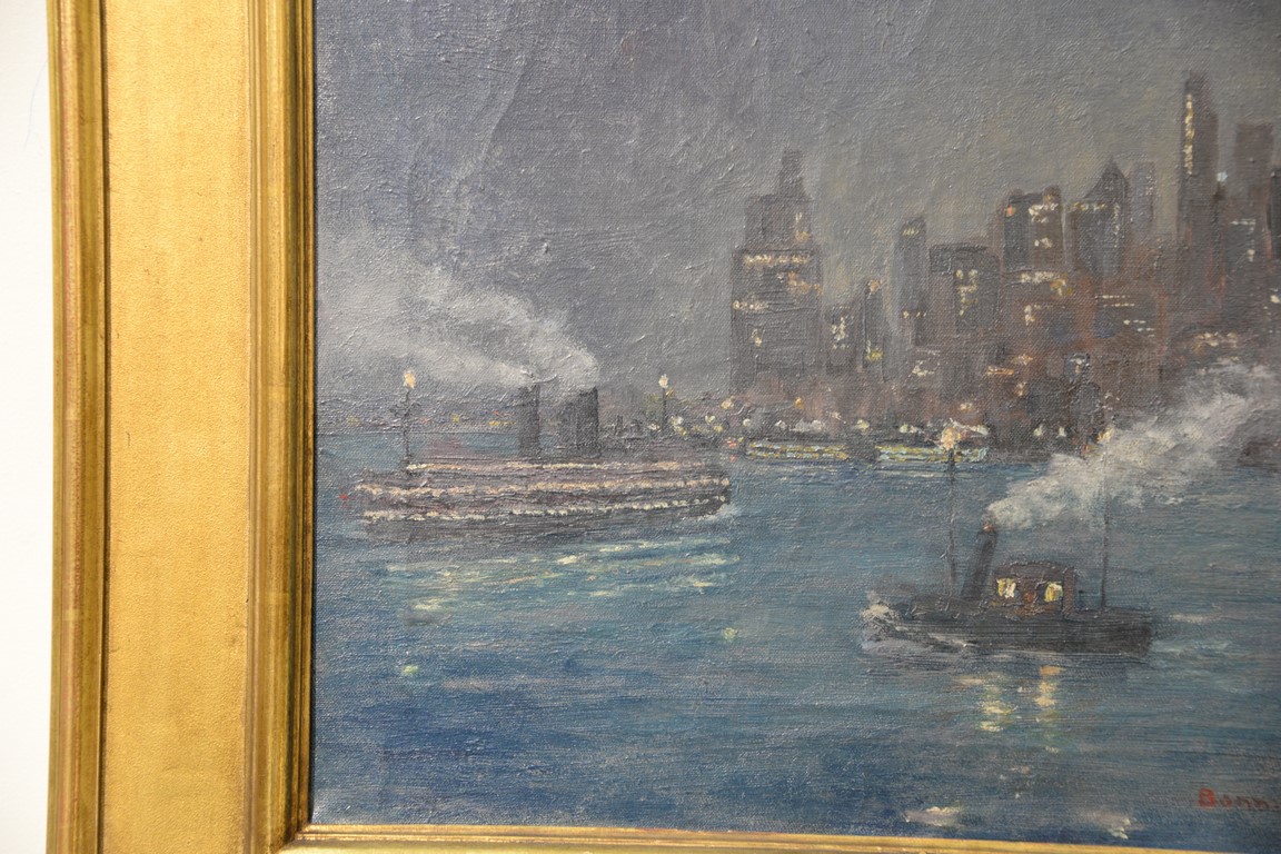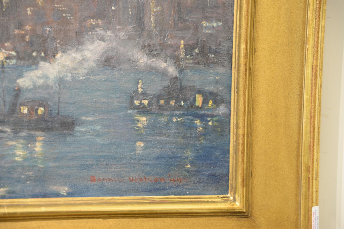 Lot 560: Bonnie Walson early 20th century oil on canvas New York City Night looking from Brooklyn Heights signed lower right: Bonnie Wa…