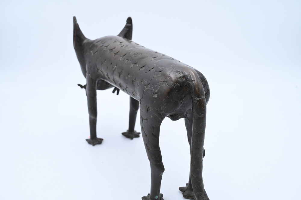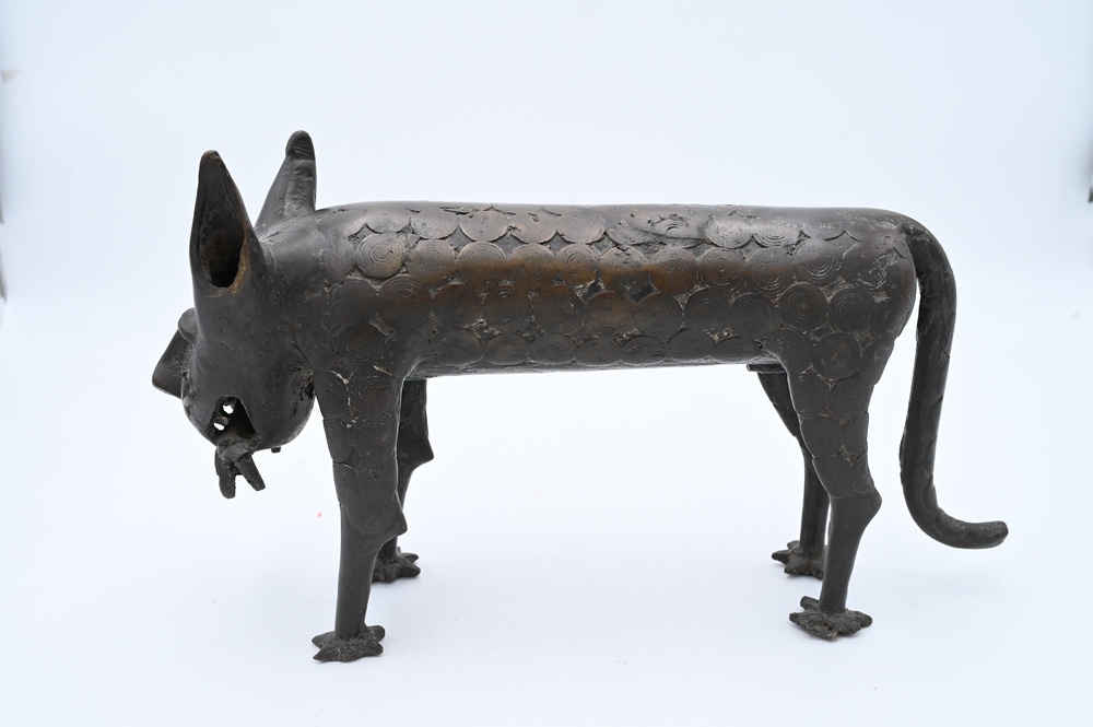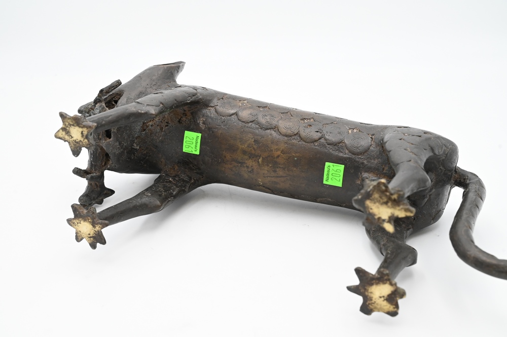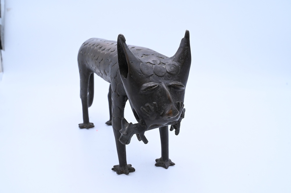 Lot 560: Brutalist Bronze Cat, having coin spot decoration with long slender body holding a small animal in its mouth, height 9 1/2 inches, length 16 inches.