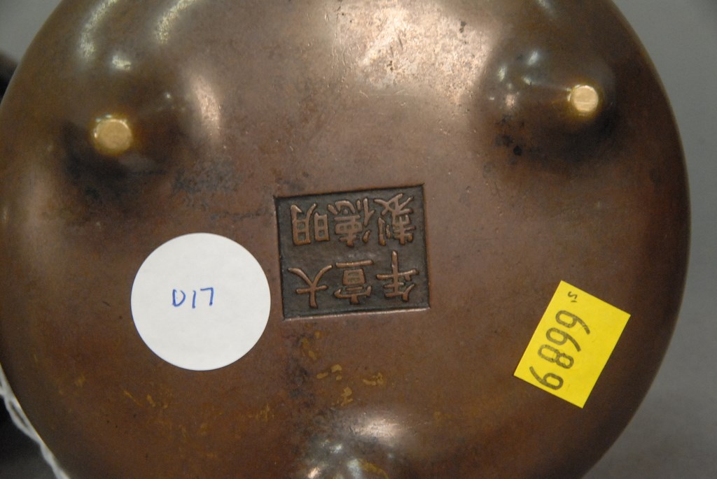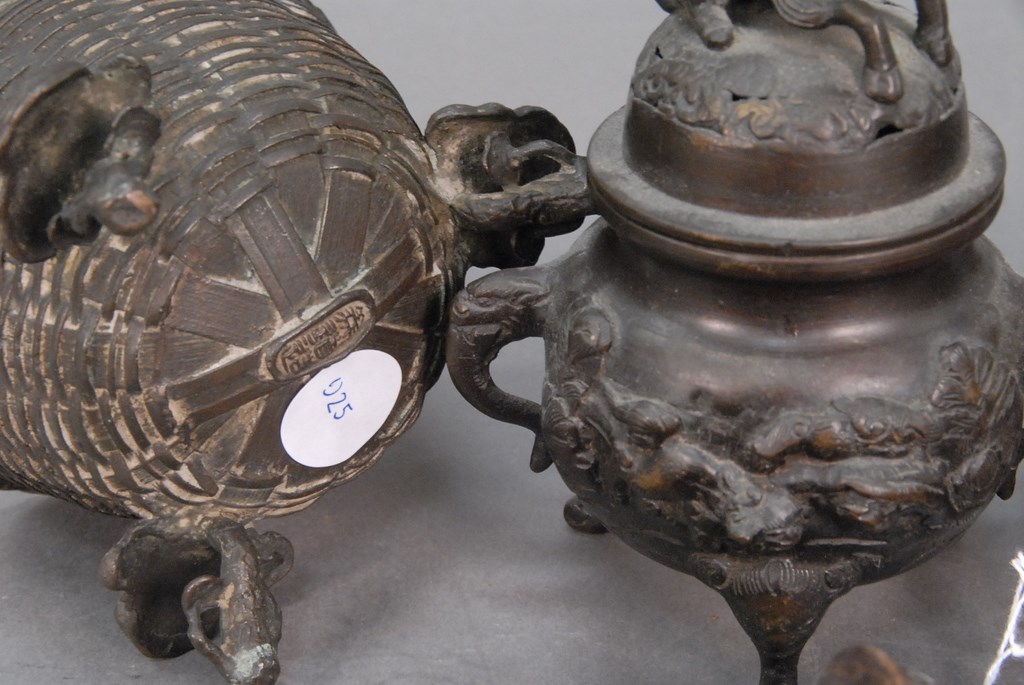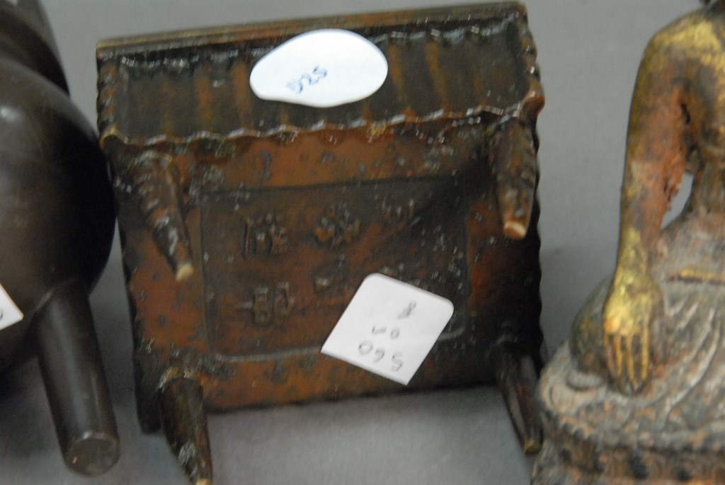 Lot 560: Group of eight bronze and cloisonn items to include five bronze footed censors, iron Buddha, cloisonn plate, and carved wood and c…