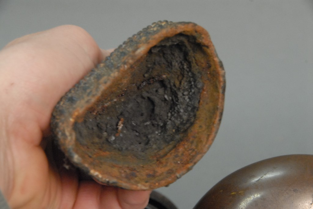 Group of eight bronze and cloisonn items to include five bronze footed censors, iron Buddha, cloisonn plate, and carved wood and cloisonn brush. Buddha: ht. 5in. plate: dia. 7in.
