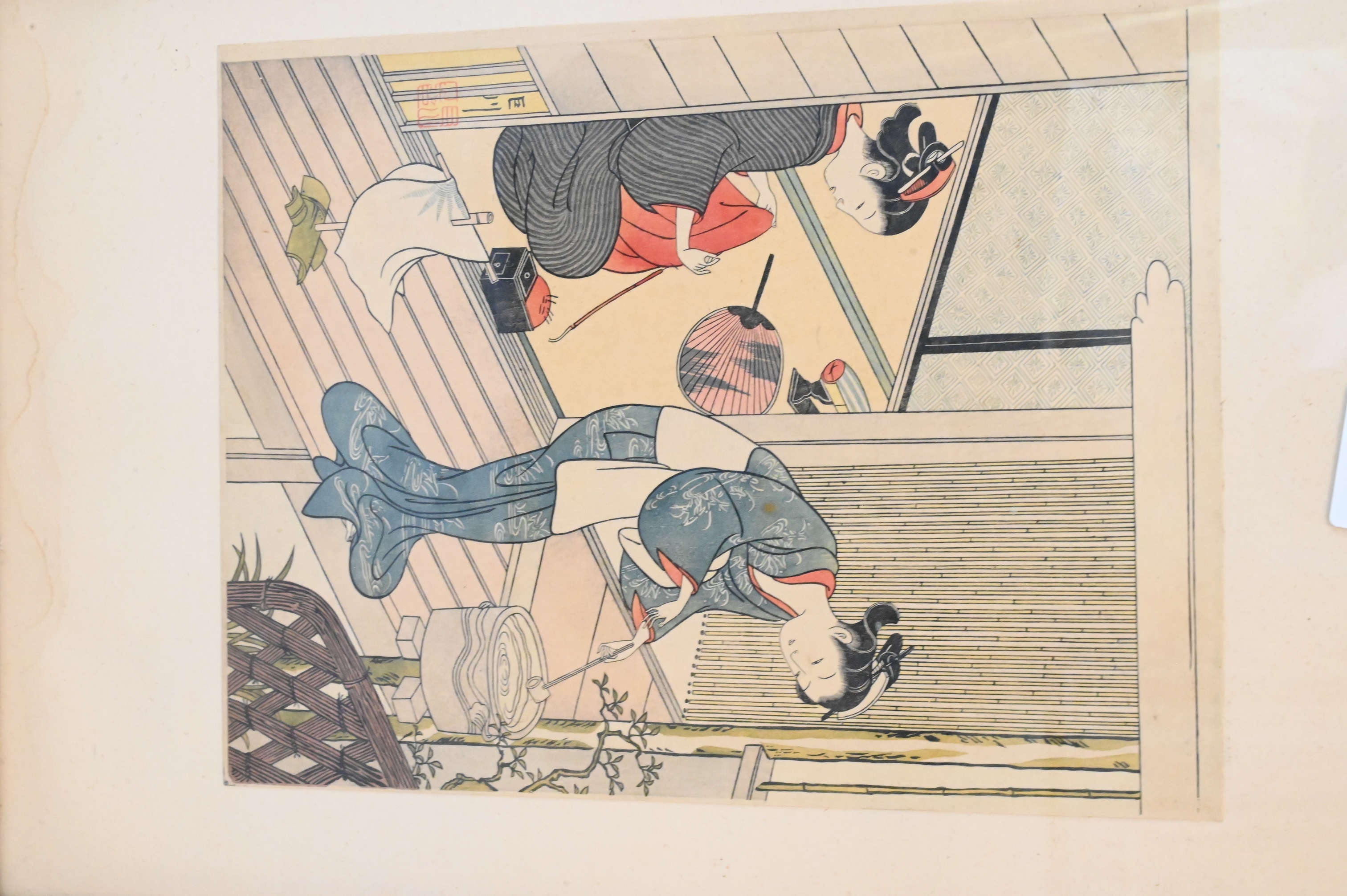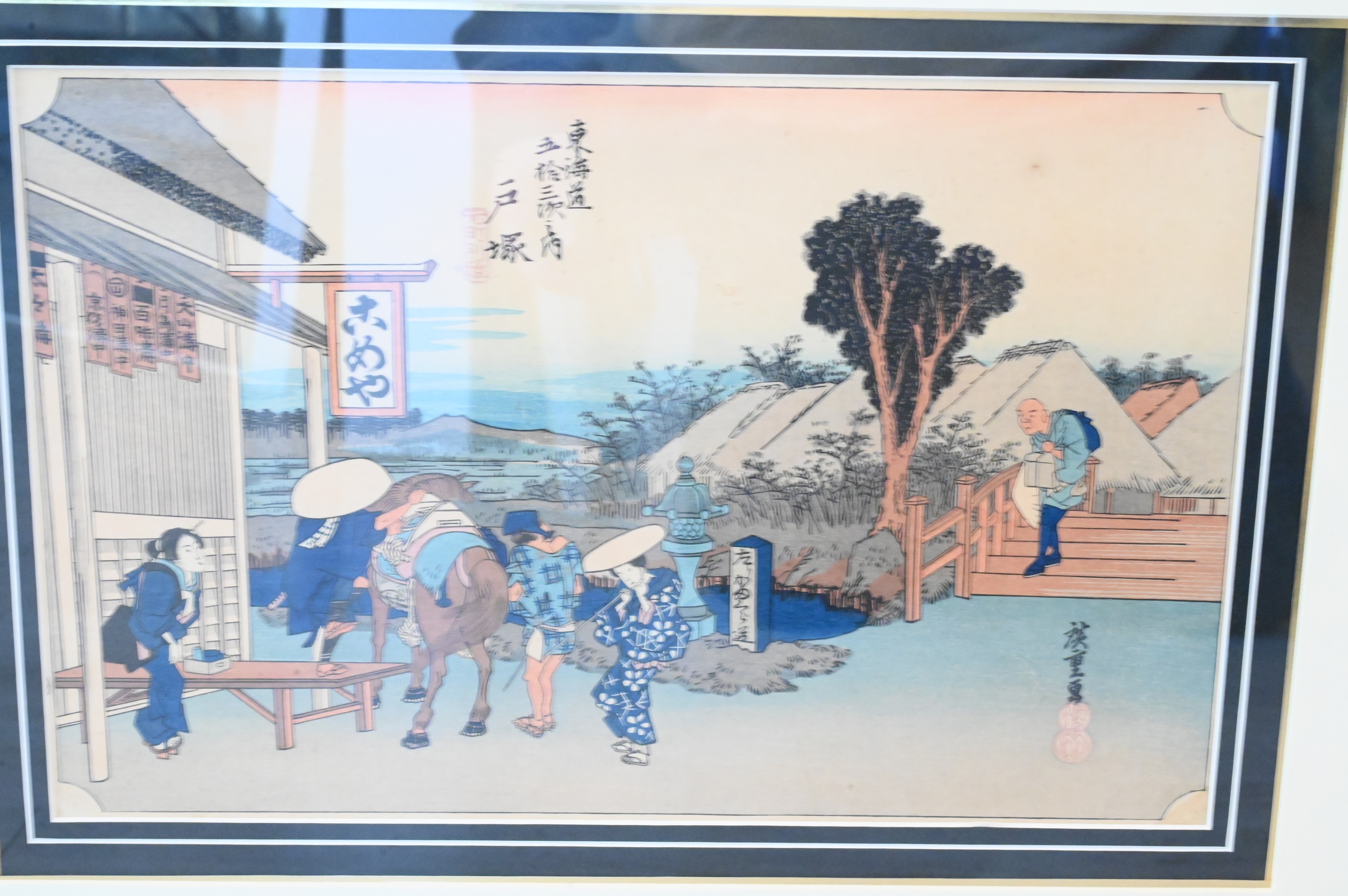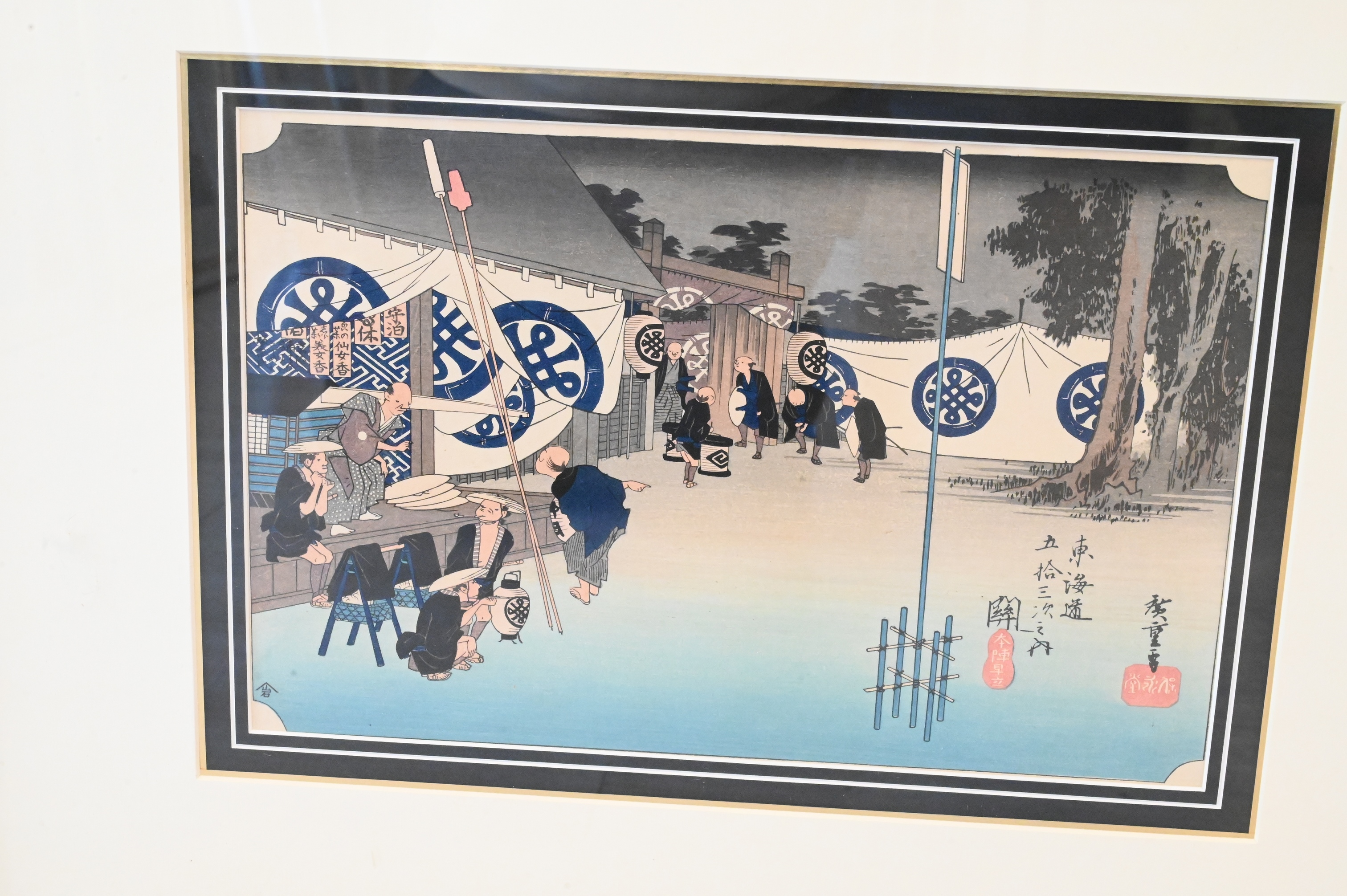 Two Japanese Woodblock Prints, Tokaido Gojusan-tsugi no Uchi, “Fifty-Three Stations of the Tokaido”, after Hiroshige by Goyo, circa 1915, station 6 and 48, each matted in contemporary frame