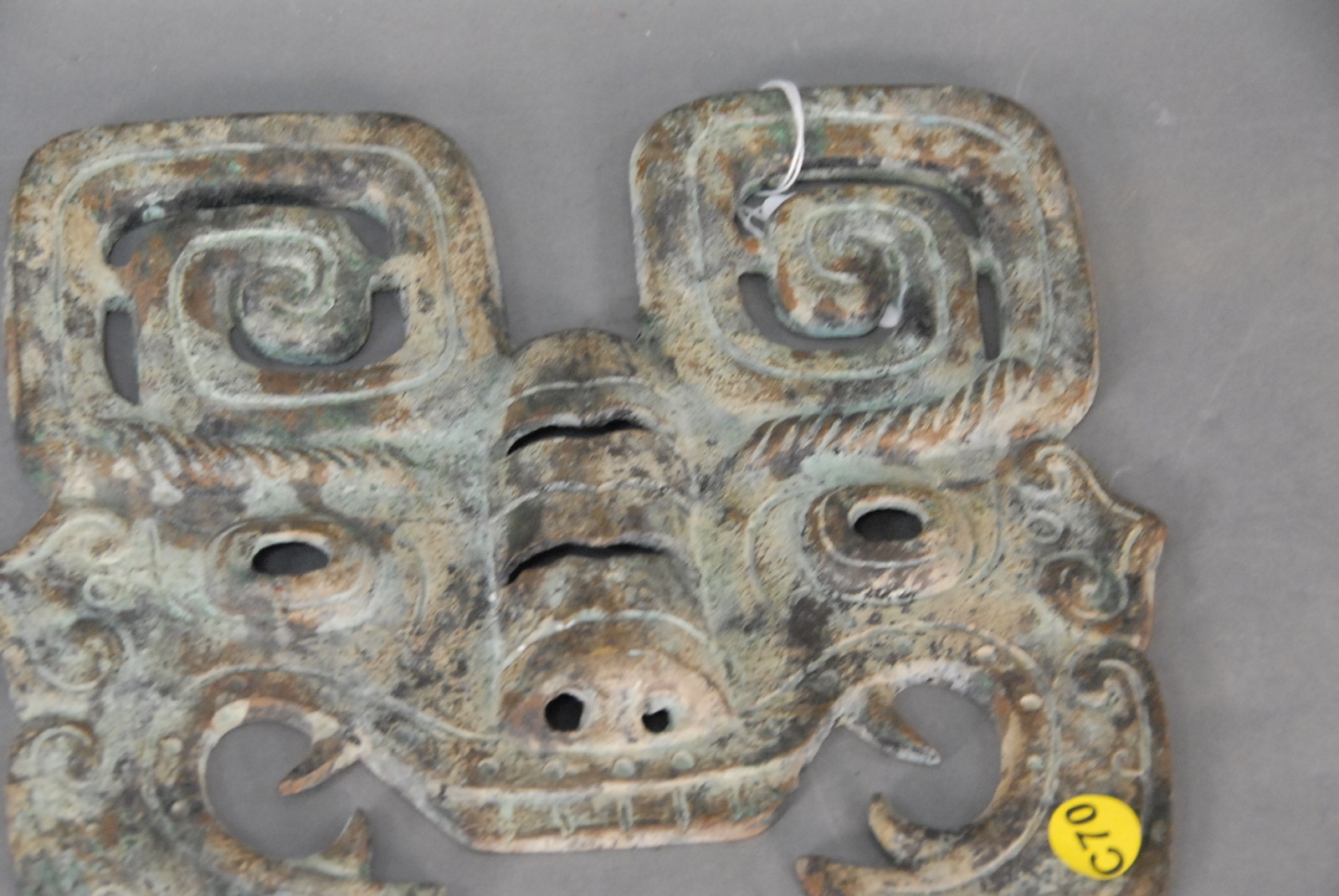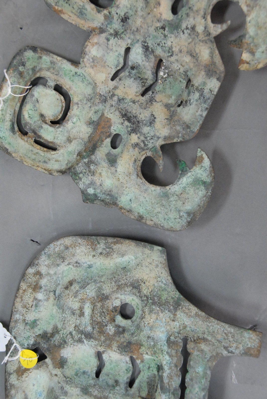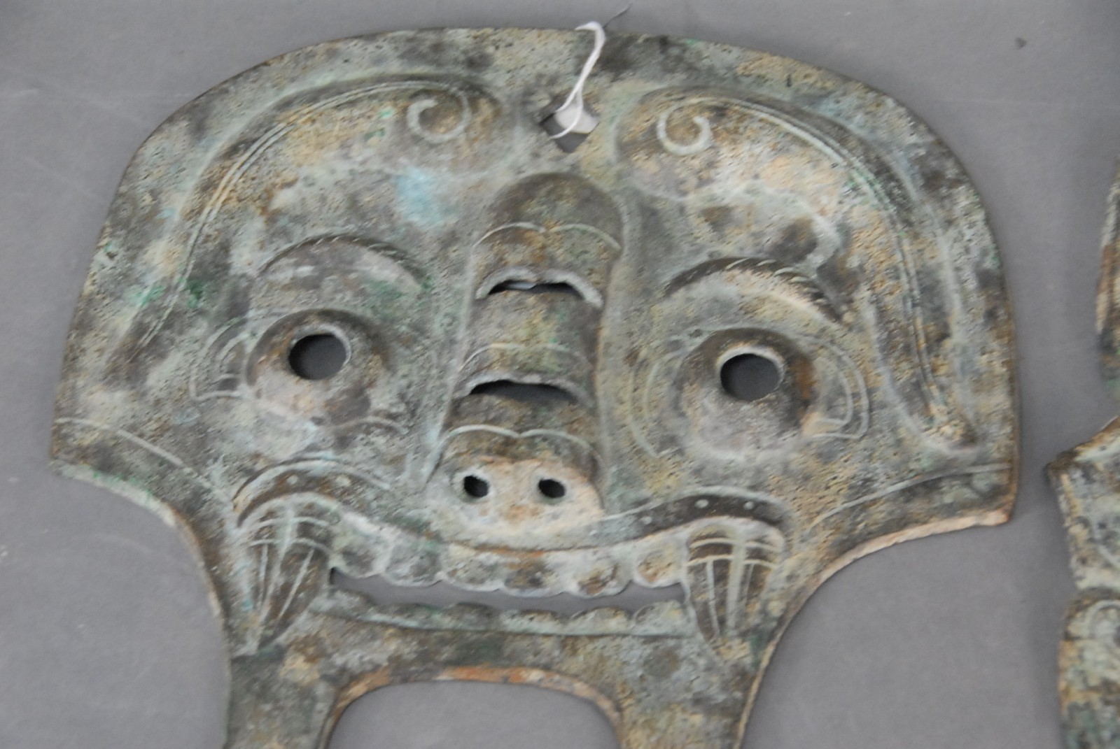 Pair of Chinese bronze wall plaques in the shape of archaic tao-tieh masks.