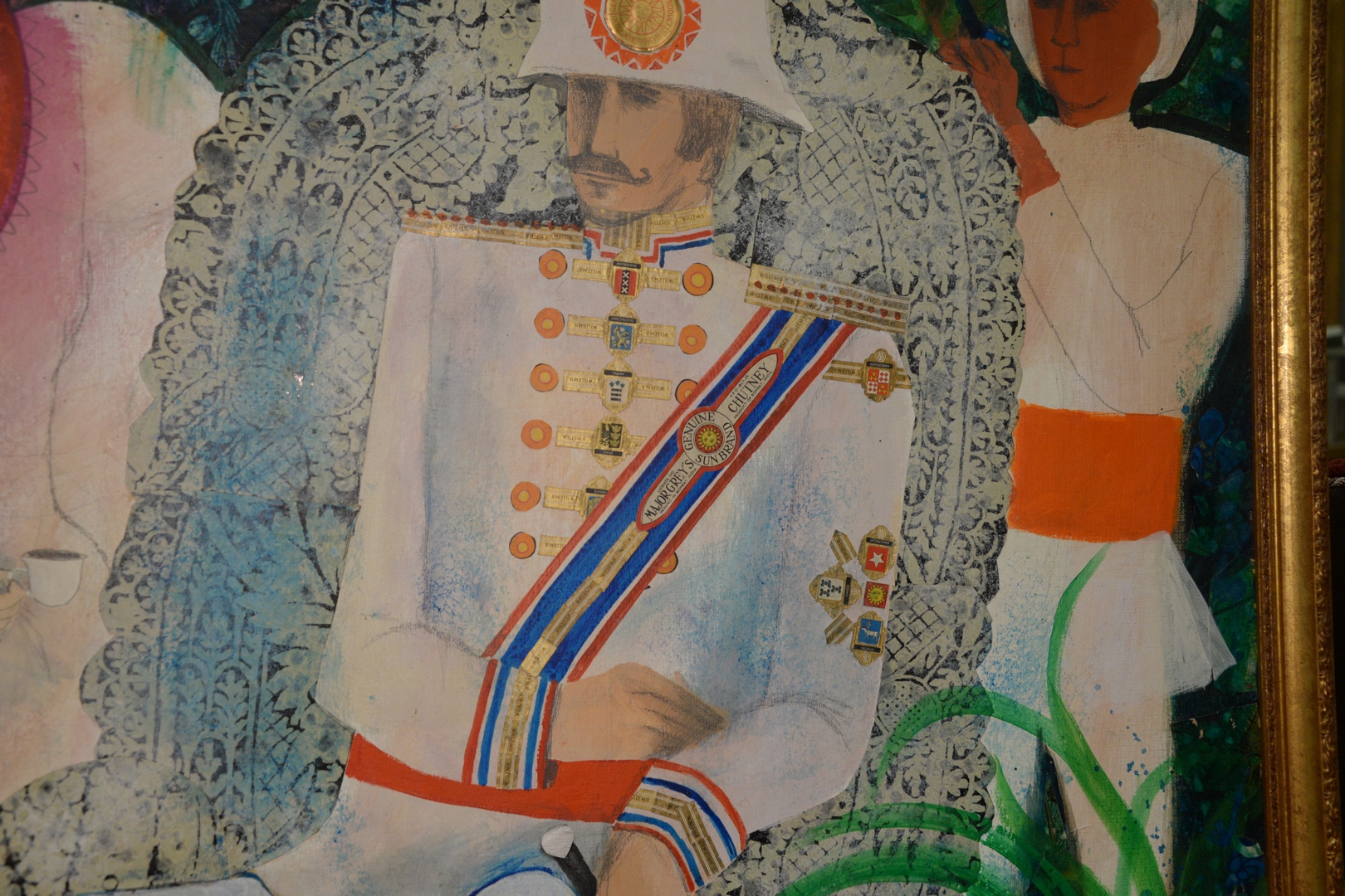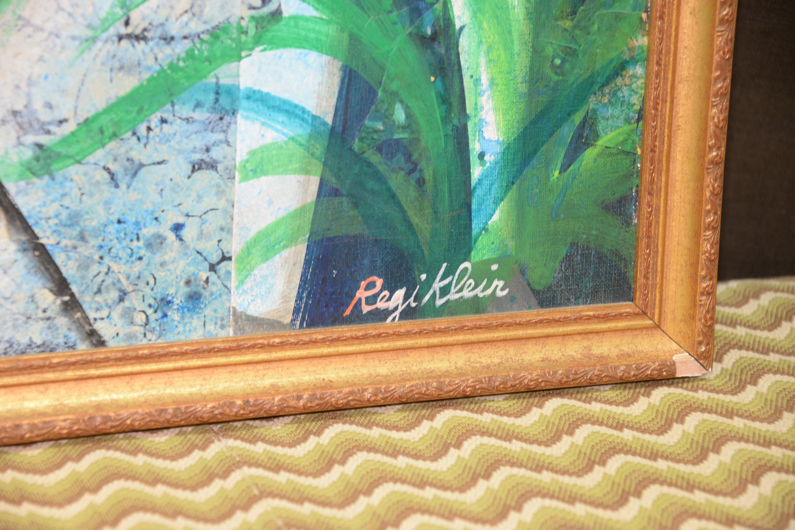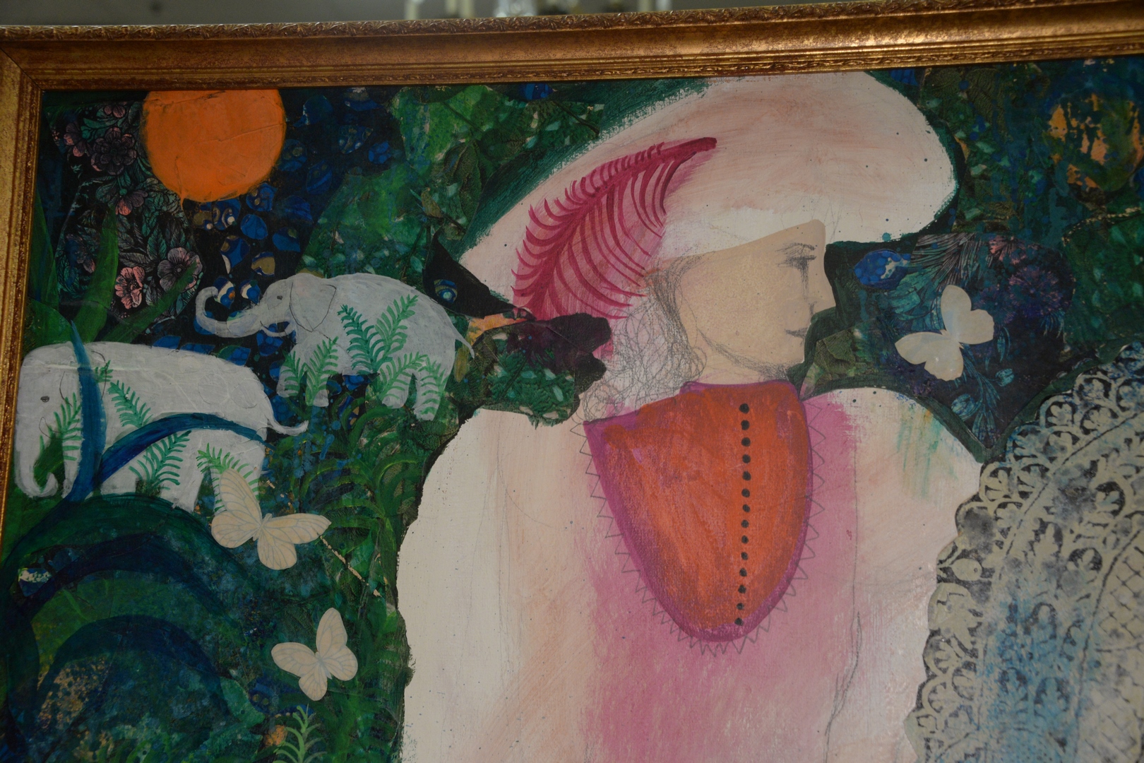 Lot 560: Regina Klein (American, 1931 – 2006), The Raj, acrylic and collage on canvas laid on board, signed lower right “Regi Klein”, 35 1/2″ x 47 1/2″.