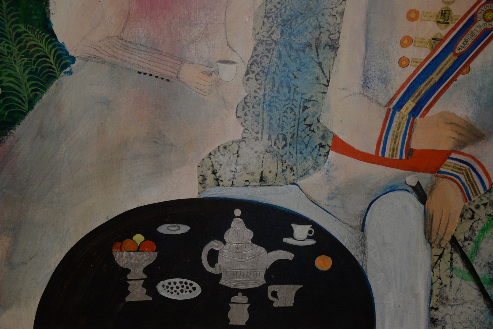 Regina Klein (American, 1931 – 2006), The Raj, acrylic and collage on canvas laid on board, signed lower right “Regi Klein”, 35 1/2″ x 47 1/2″.