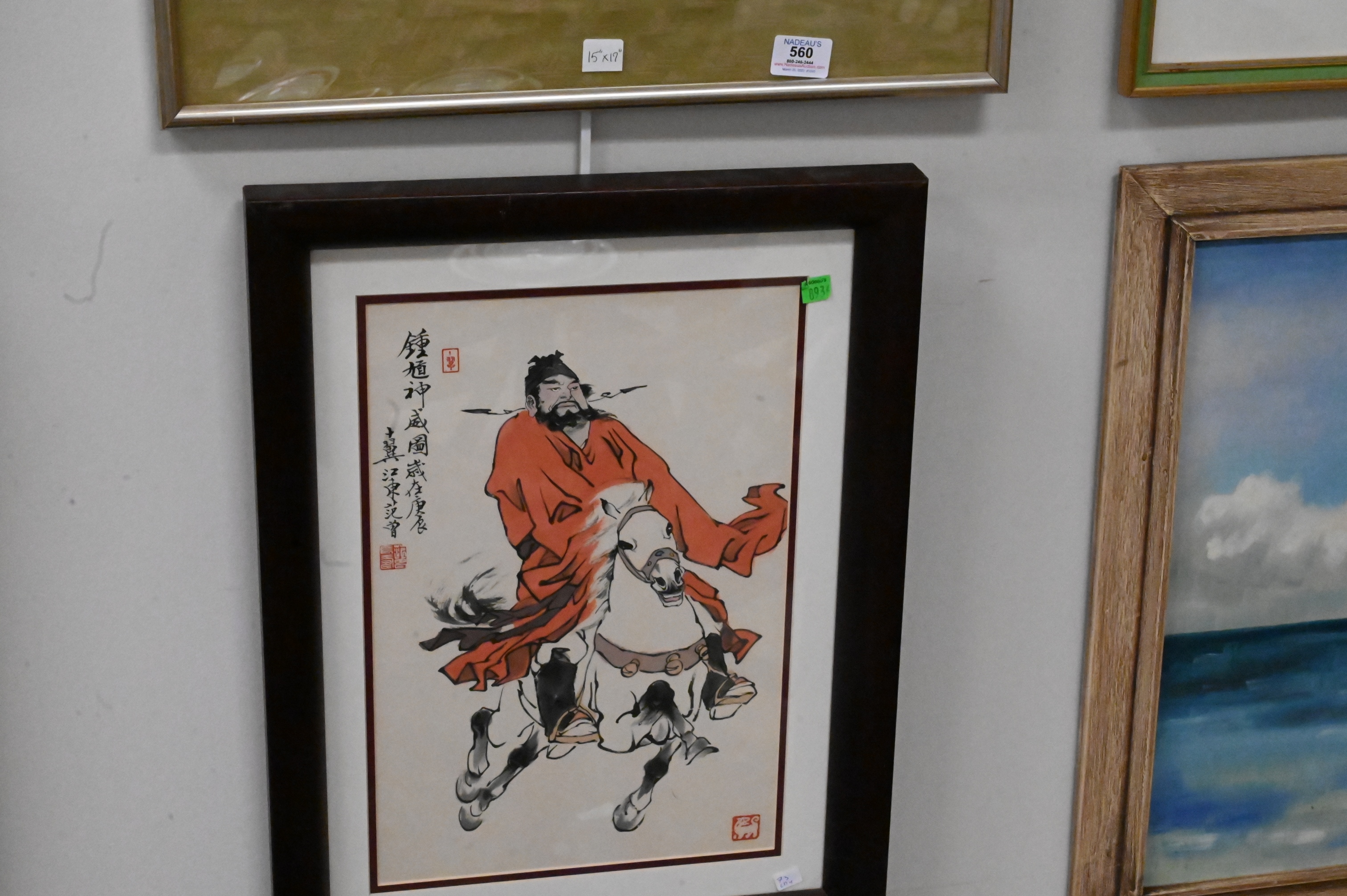 Six Piece Lot of Framed Japanese Artwork, to include a three piece set of botanical prints, watercolor landscape and watercolor portrait with man on horseback, all having seats, along with Yeizan woodblock, circa 1850.