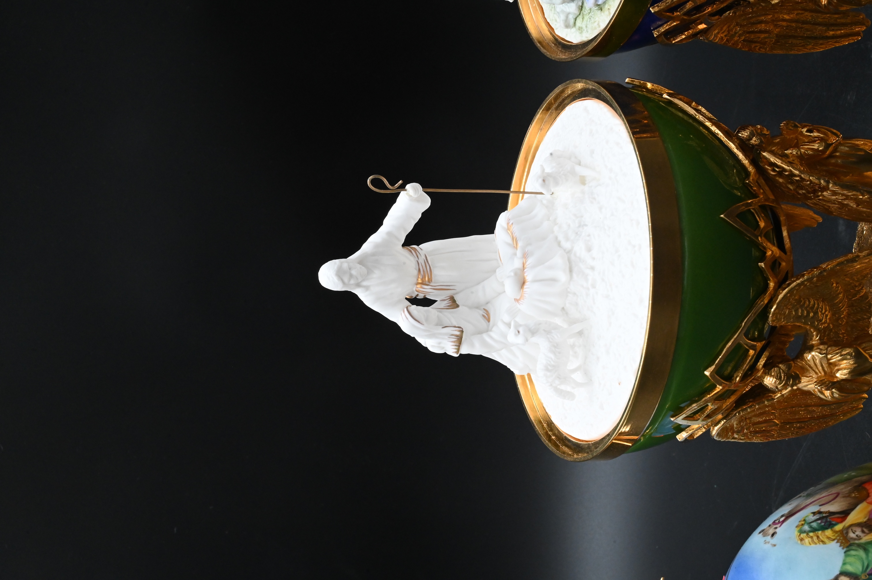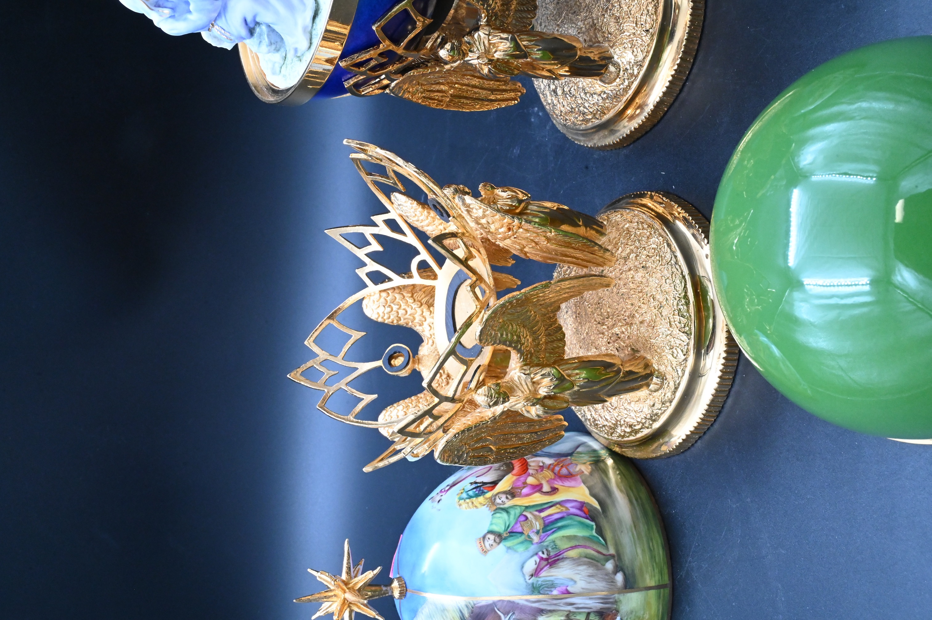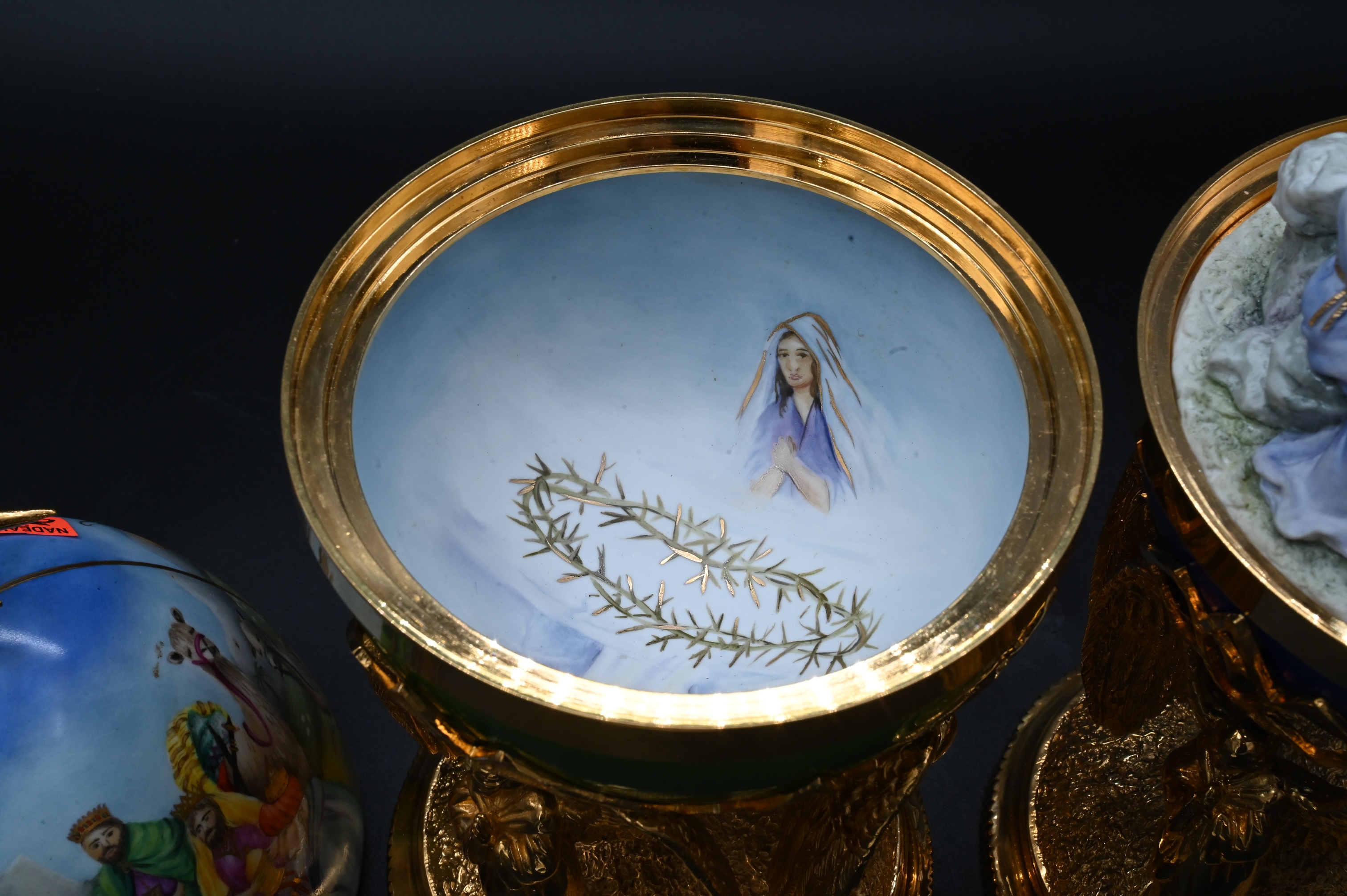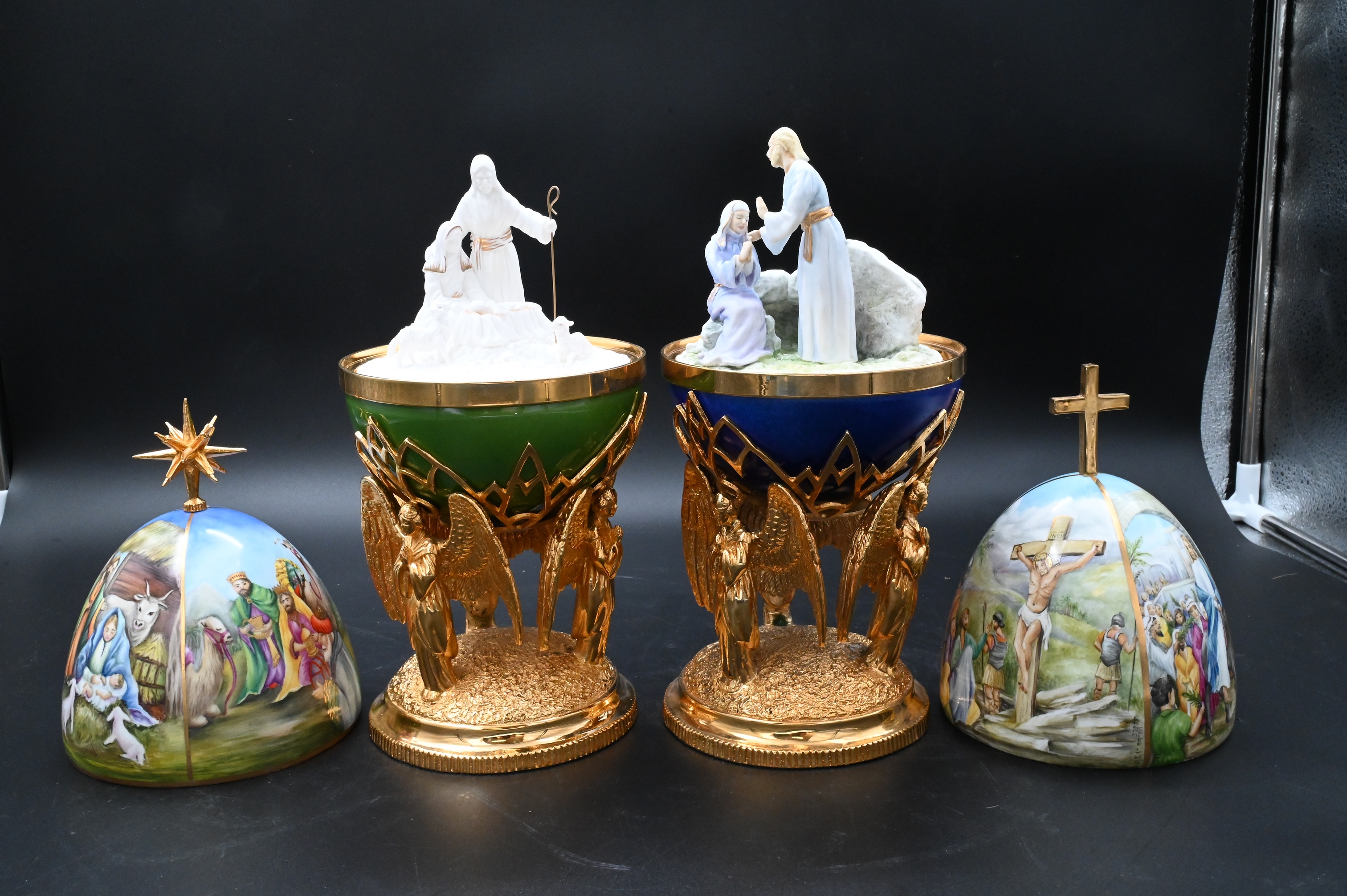 “Easter Celebration” hand painted by R. Sefton, 1992 connoisseur of Malvern, each egg set on gilt angel base and opening to reveal bisque religious scene
