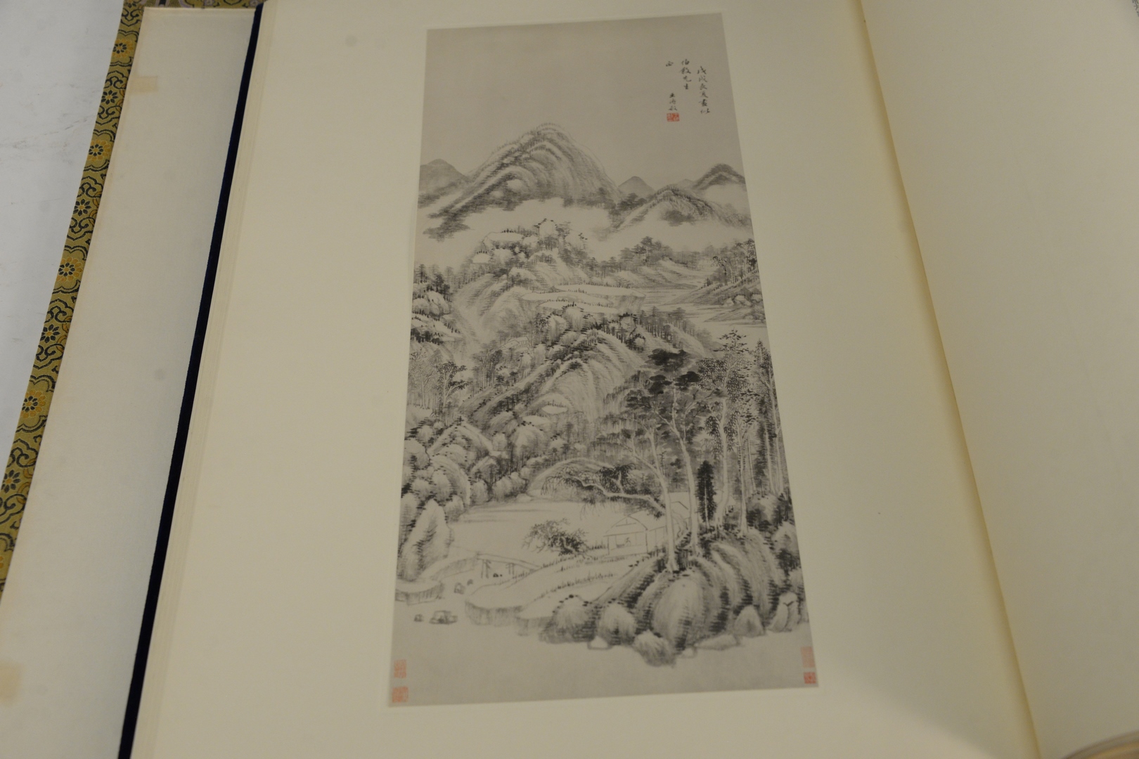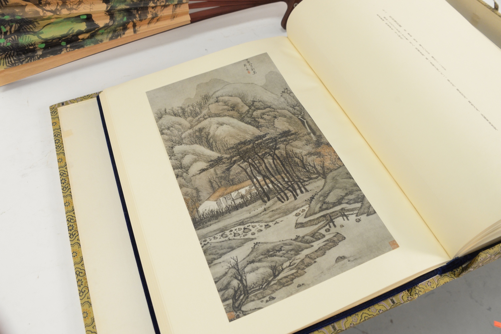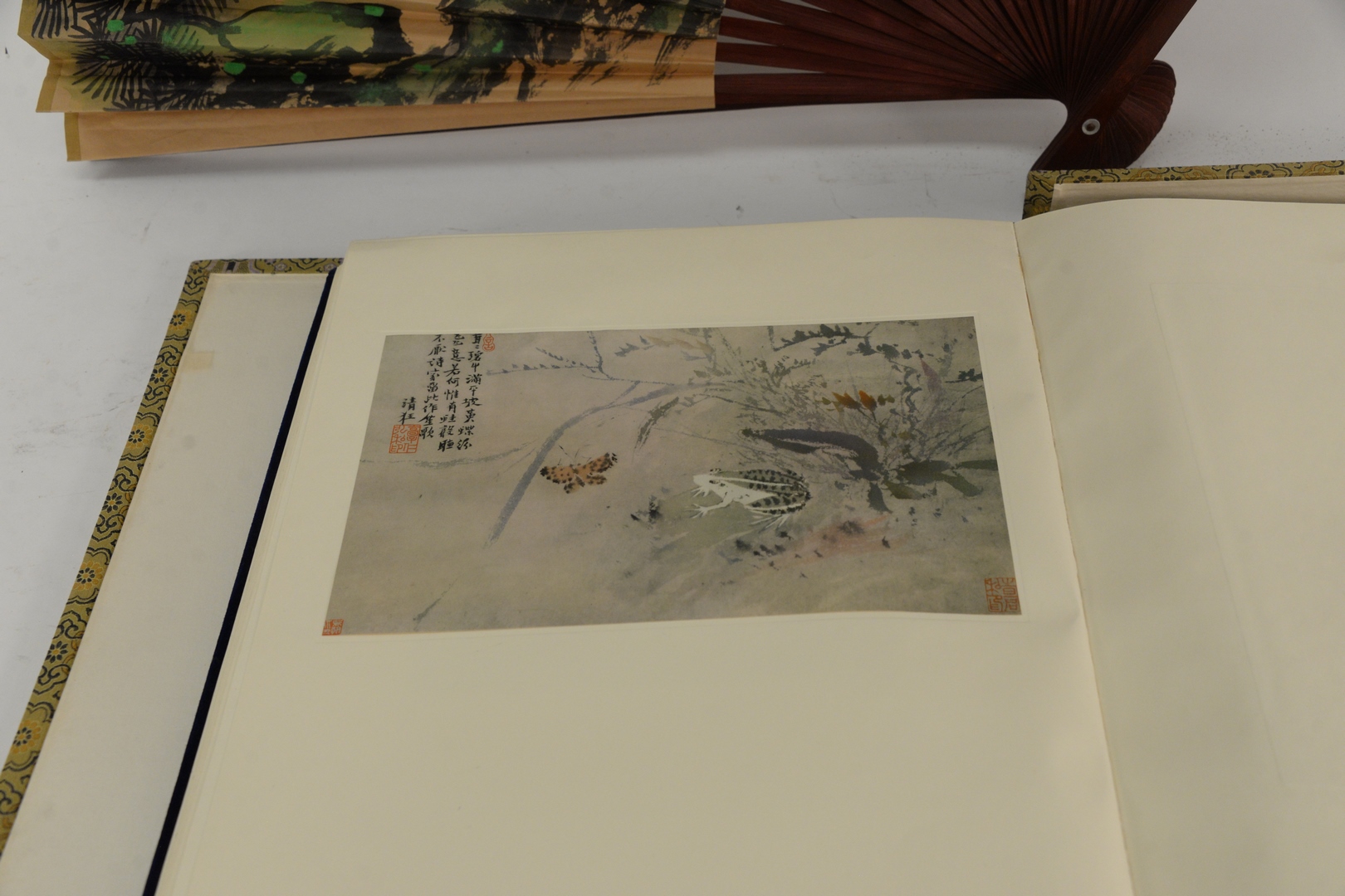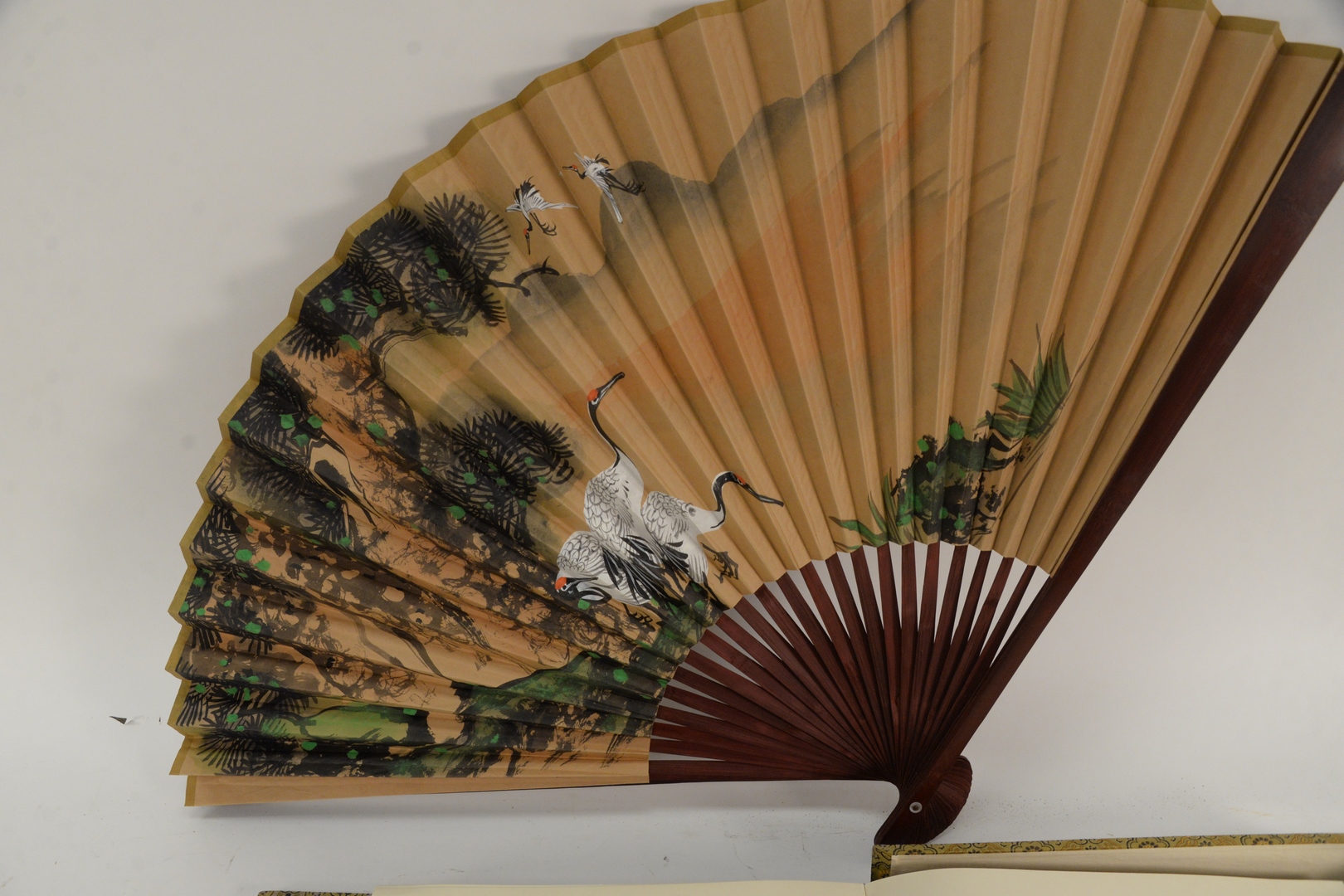 Lot 560: Two piece Oriental group to include a book with printed scrolls, height 22 inches, width 15 inches along with a large fan.