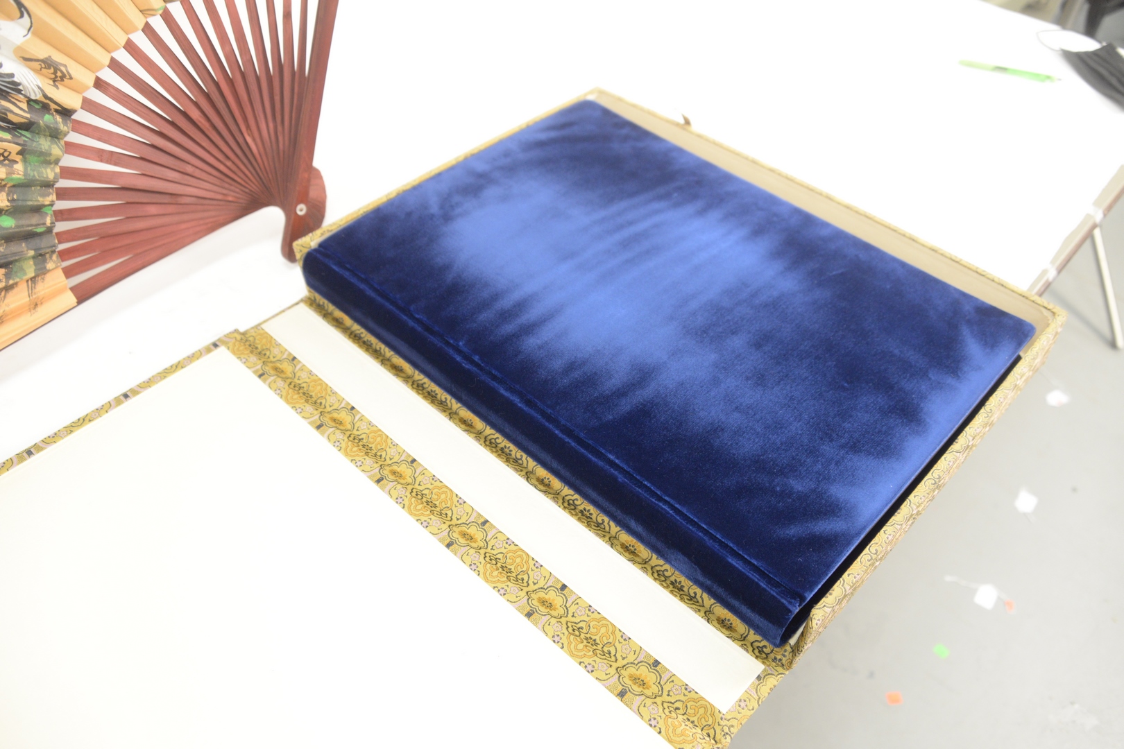 Two piece Oriental group to include a book with printed scrolls, height 22 inches, width 15 inches along with a large fan.