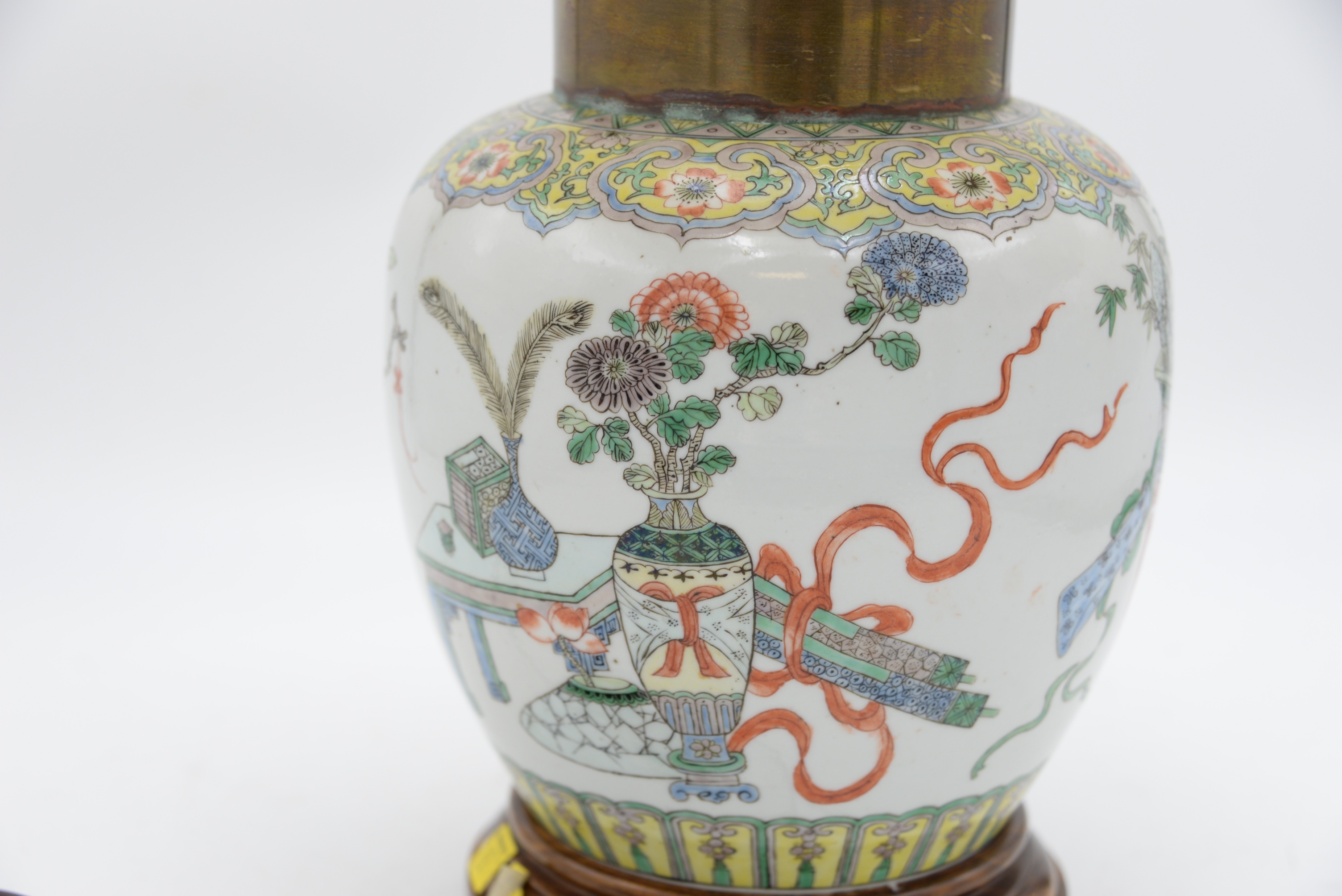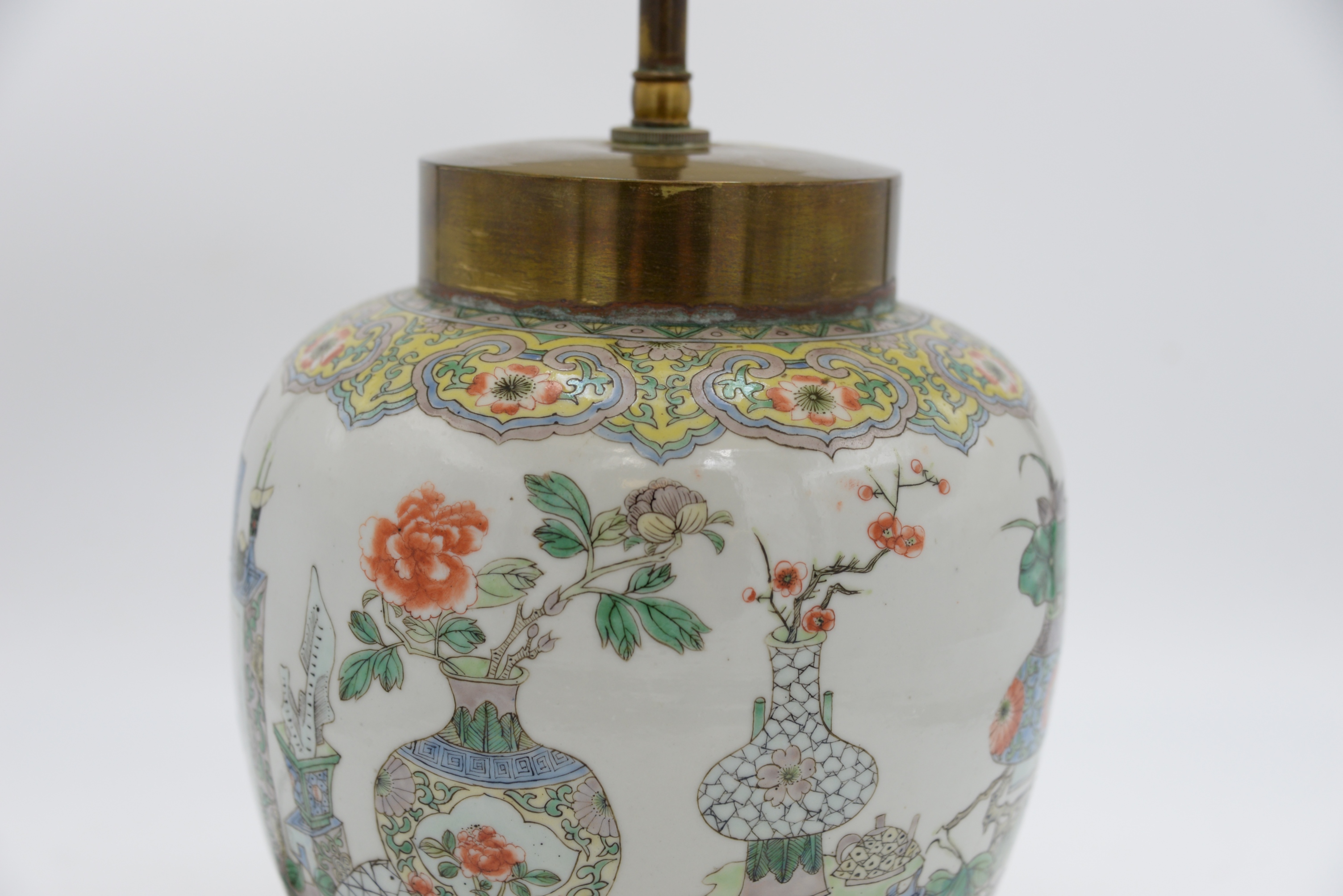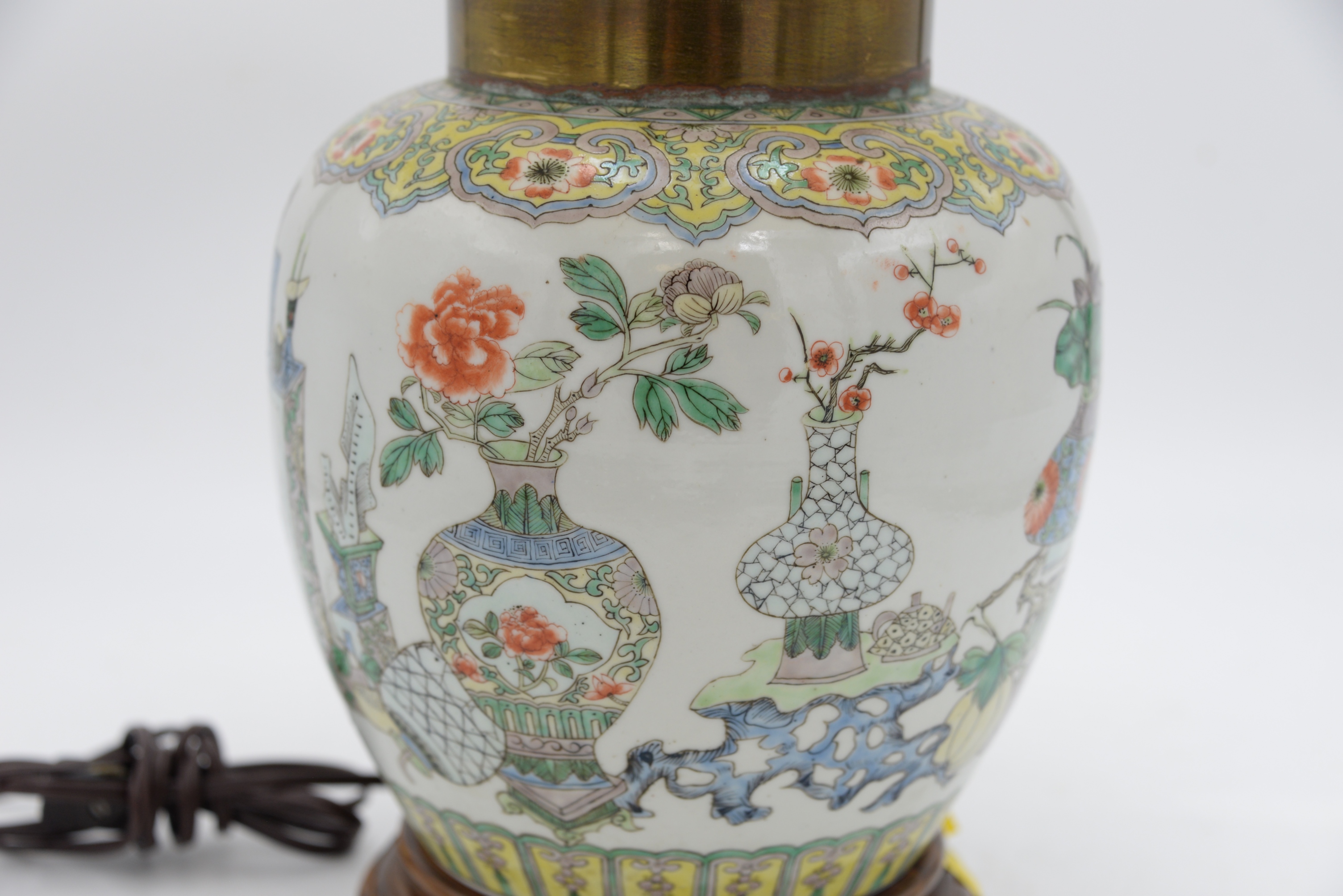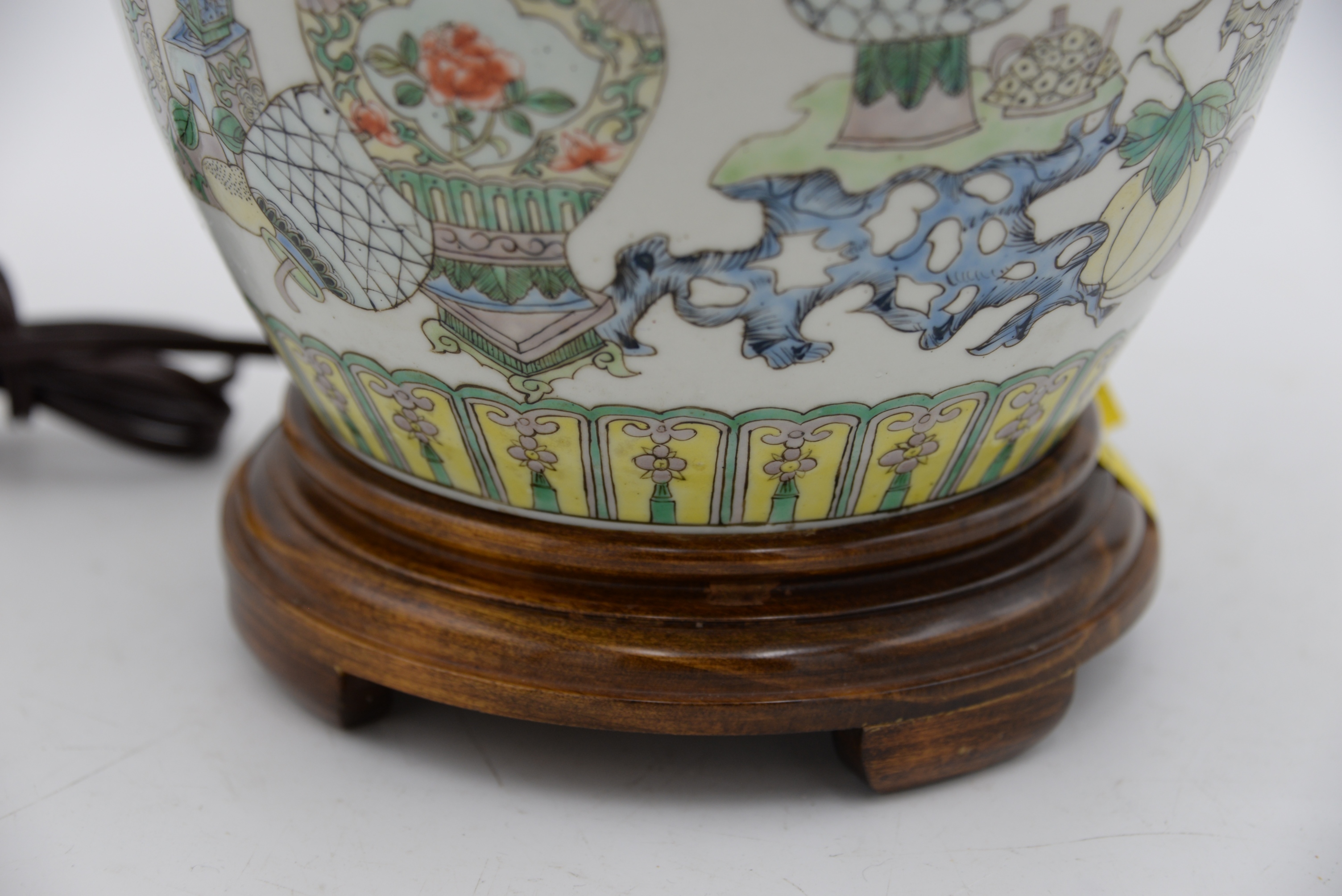 Chinese Famille Verte Covered Jar, 19th Century, the main circular body decorated with vases and flowers, the shoulder with stylized jui-head border. Mounted as a lamp with metal cover and wooden base, height 8 inches.