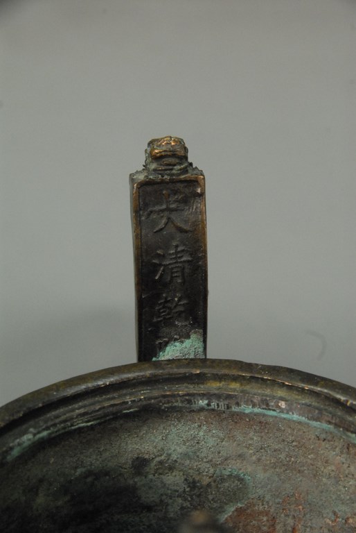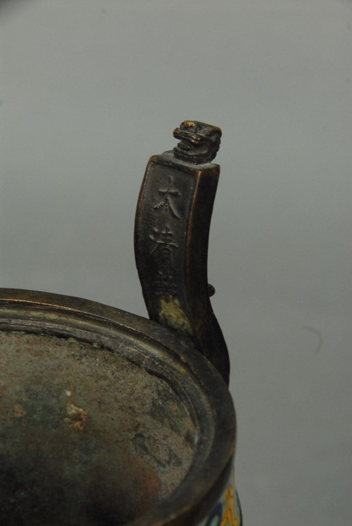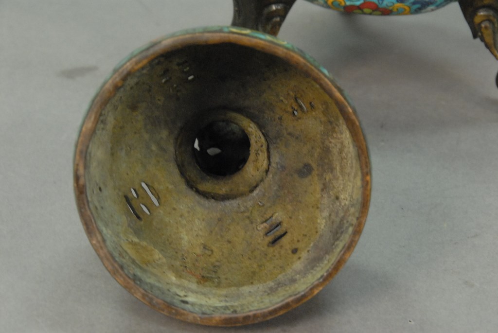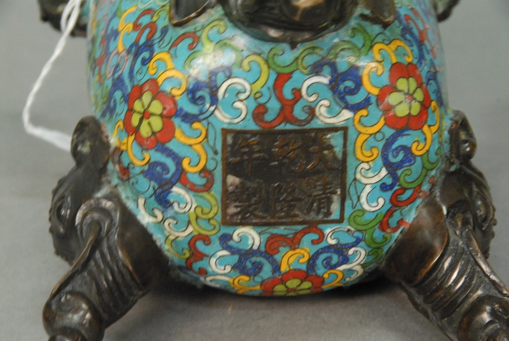 Lot 561: Cloisonn and bronze censor Ching Dynasty six character mark on bottom, censor having dragon finial and tripod elephant head feet. h…