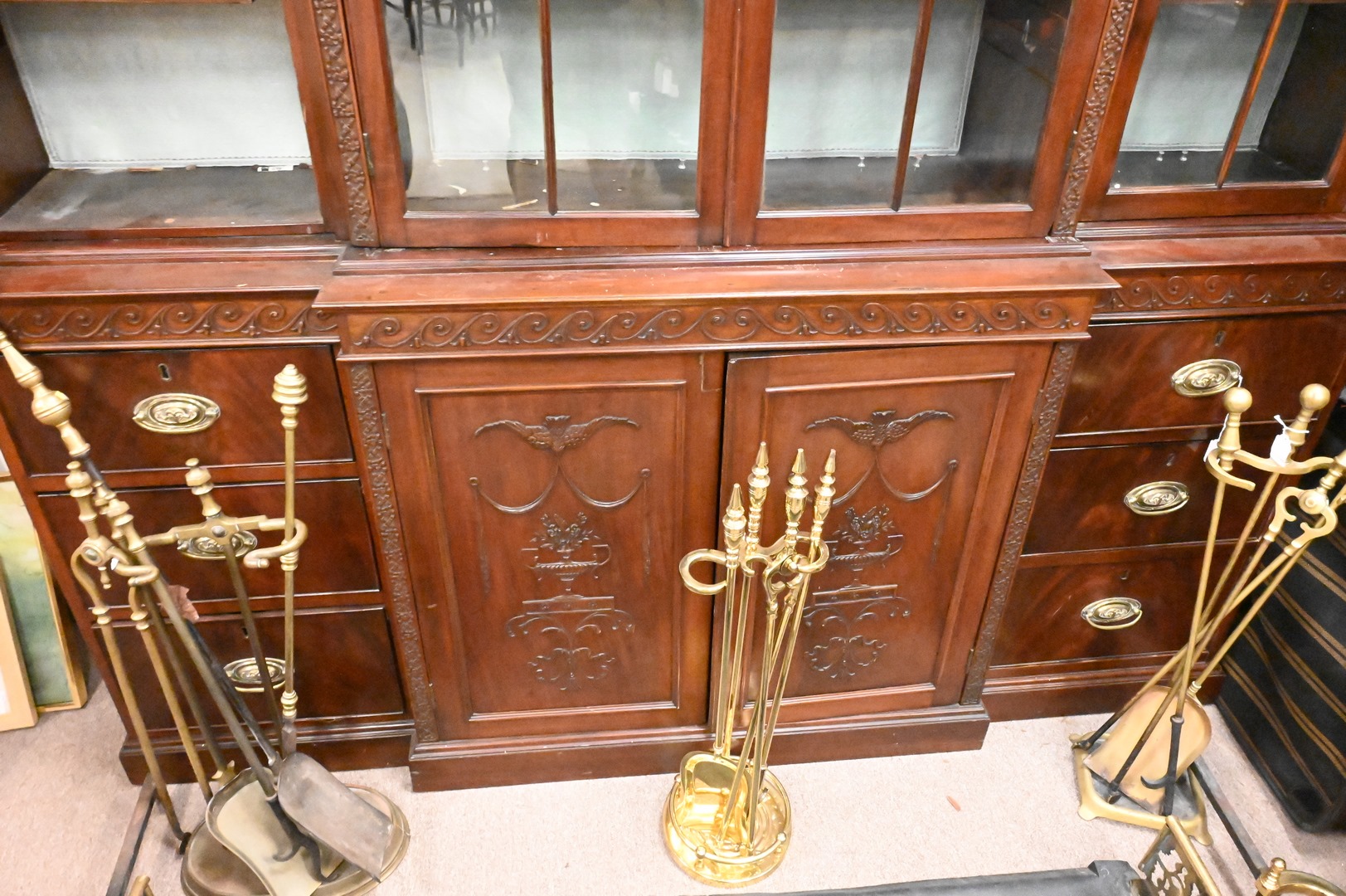Mahogany Breakfront in Five Parts, top molding having floral and Greek key carvings, over three sections with glazed doors, on lower cabinet a pair of carved doors flanked by drawers, circa 1780. height 76 inches, width 73 inches, depth 16 inches, Provenance: Estate of Peter Tillou, Litchfield, Connecticut.