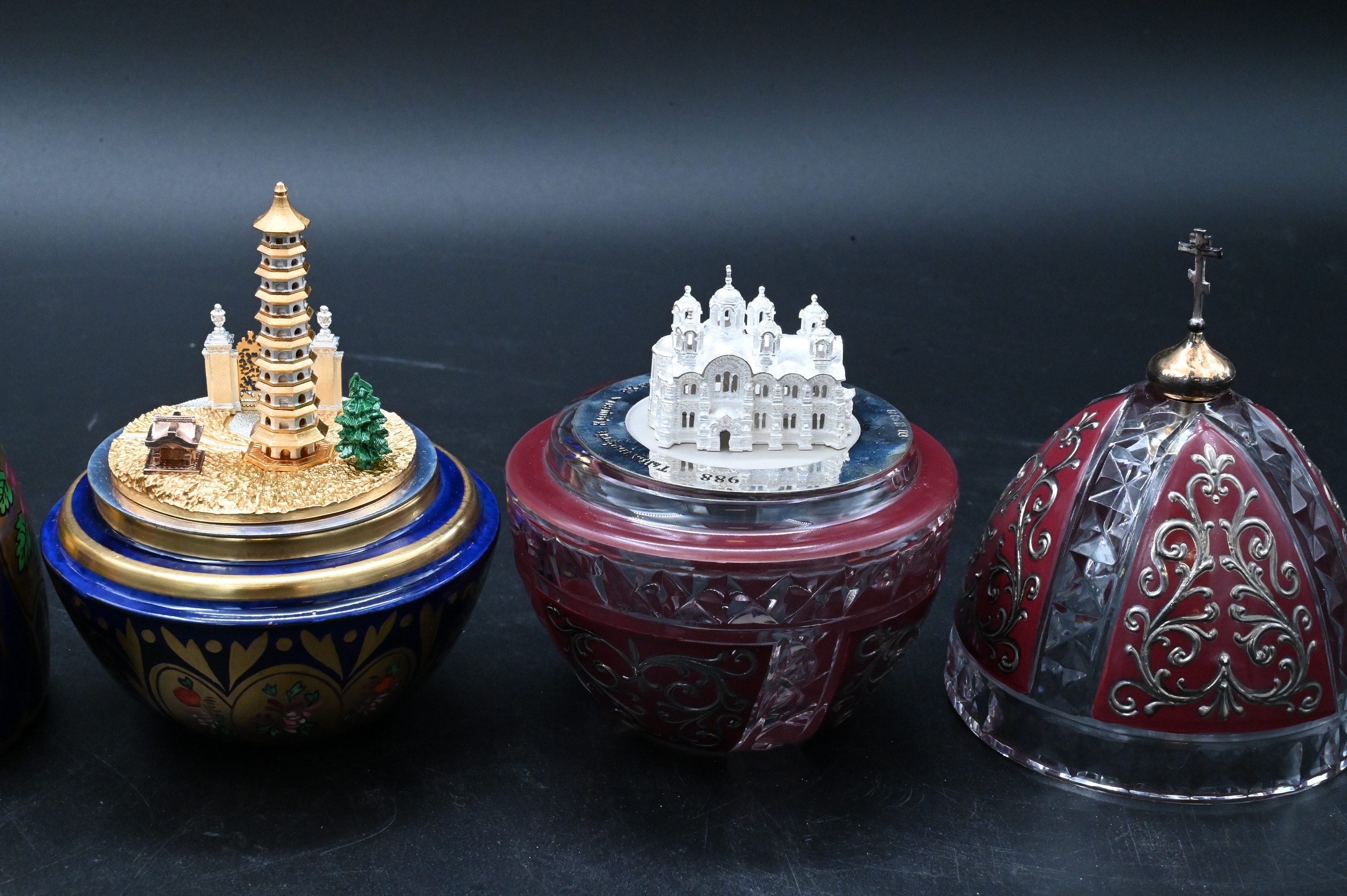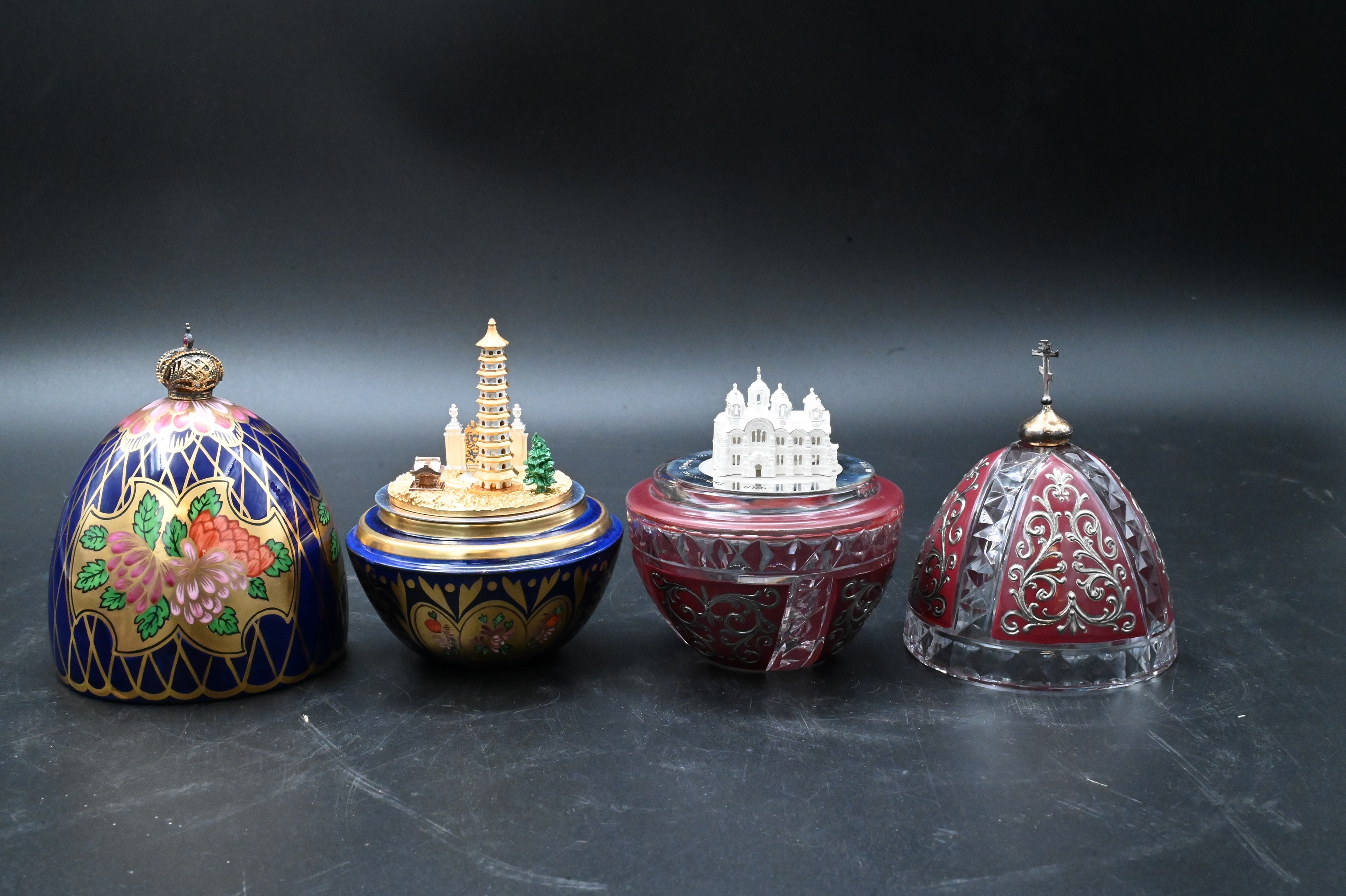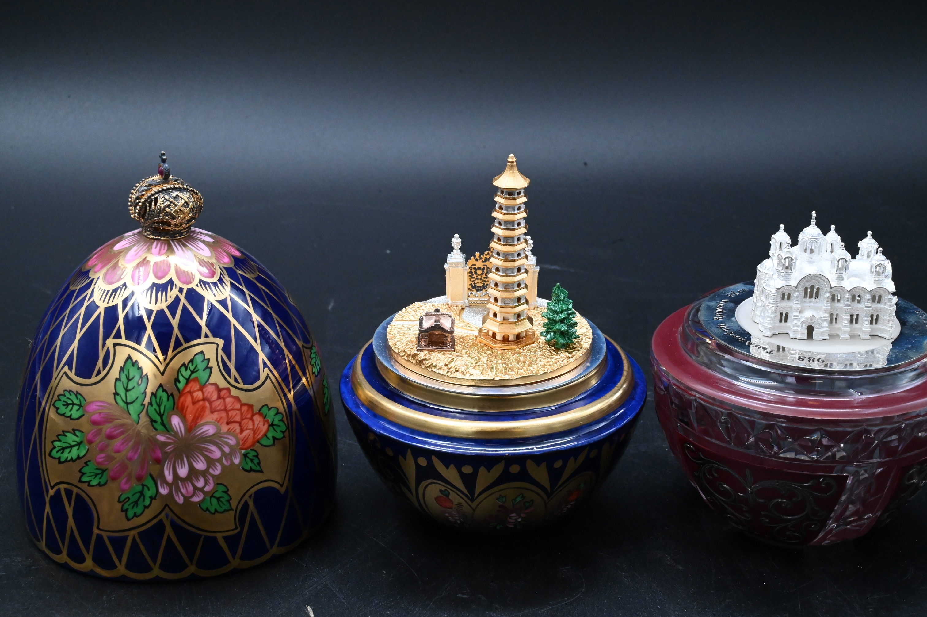 to include “Imari” egg 1992, hand painted Imari style egg opening to reveal sterling silver Japanese Pagoda and temple, edition 144/500