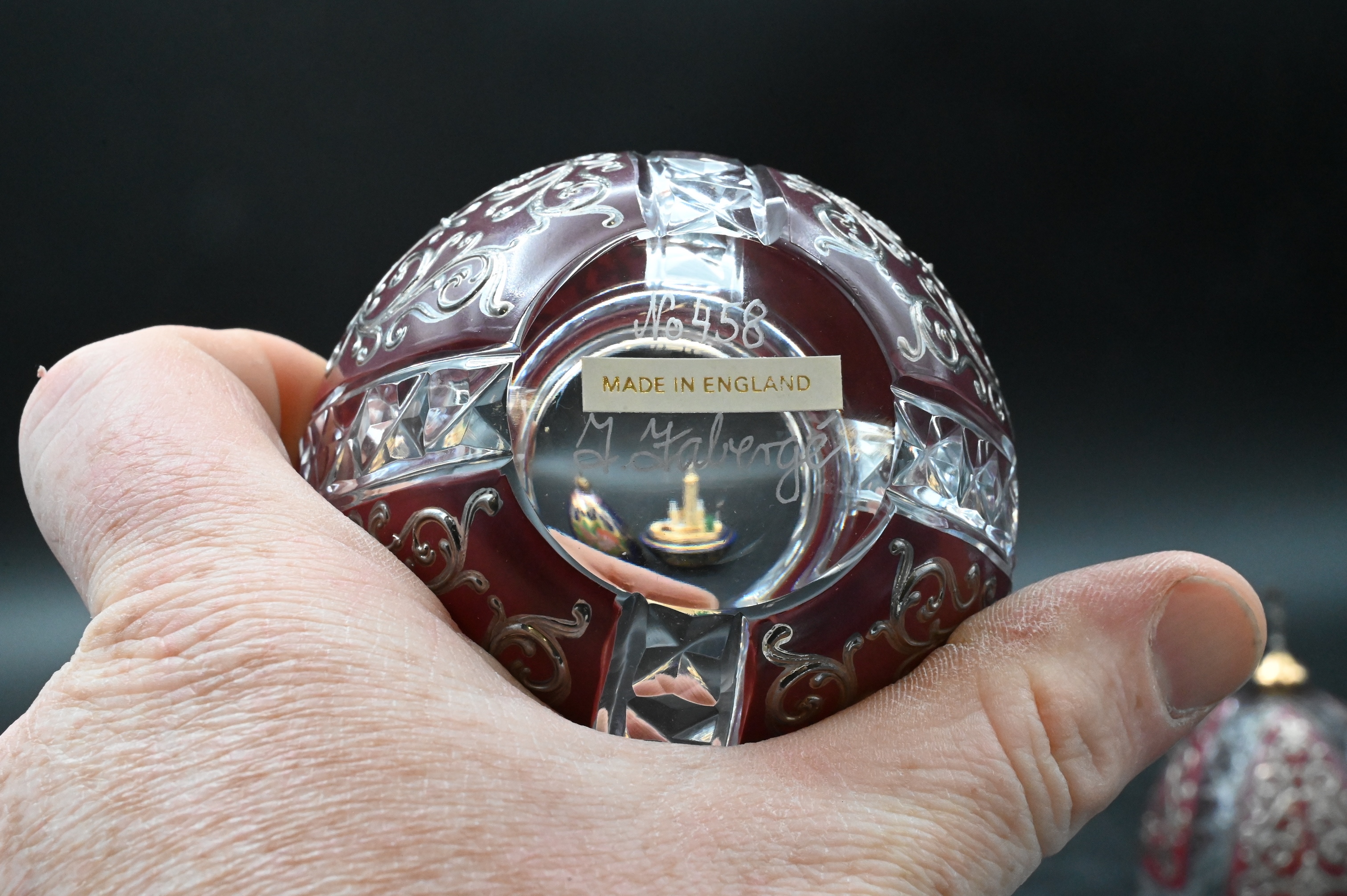 “St. Vladimir” egg, 1987 celebrating the millennium anniversary of Russian Orthodox Christianity, burgundy enamel opening to reveal sterling silver St. Vladimir’s Cathedral, edition 458/500