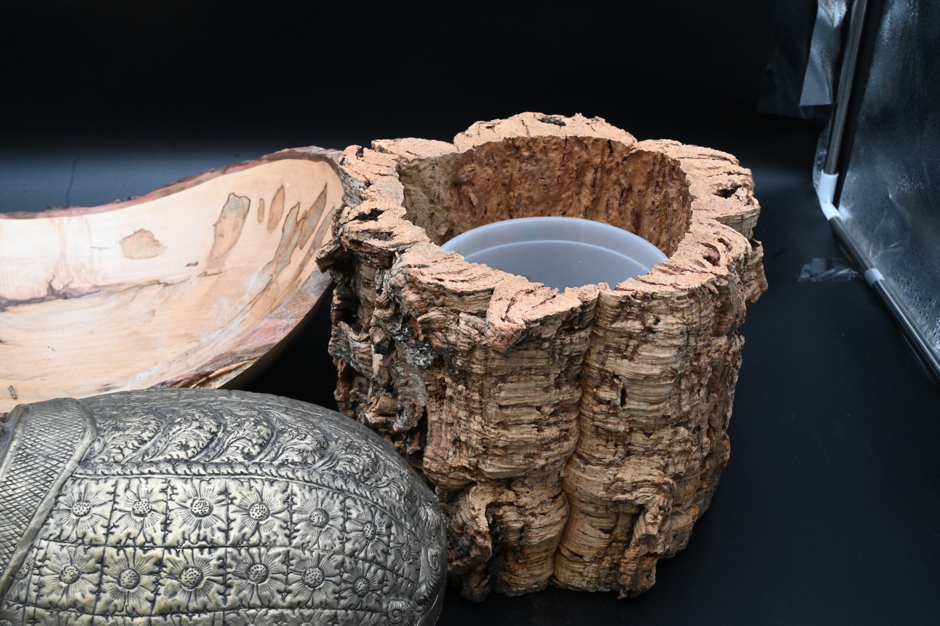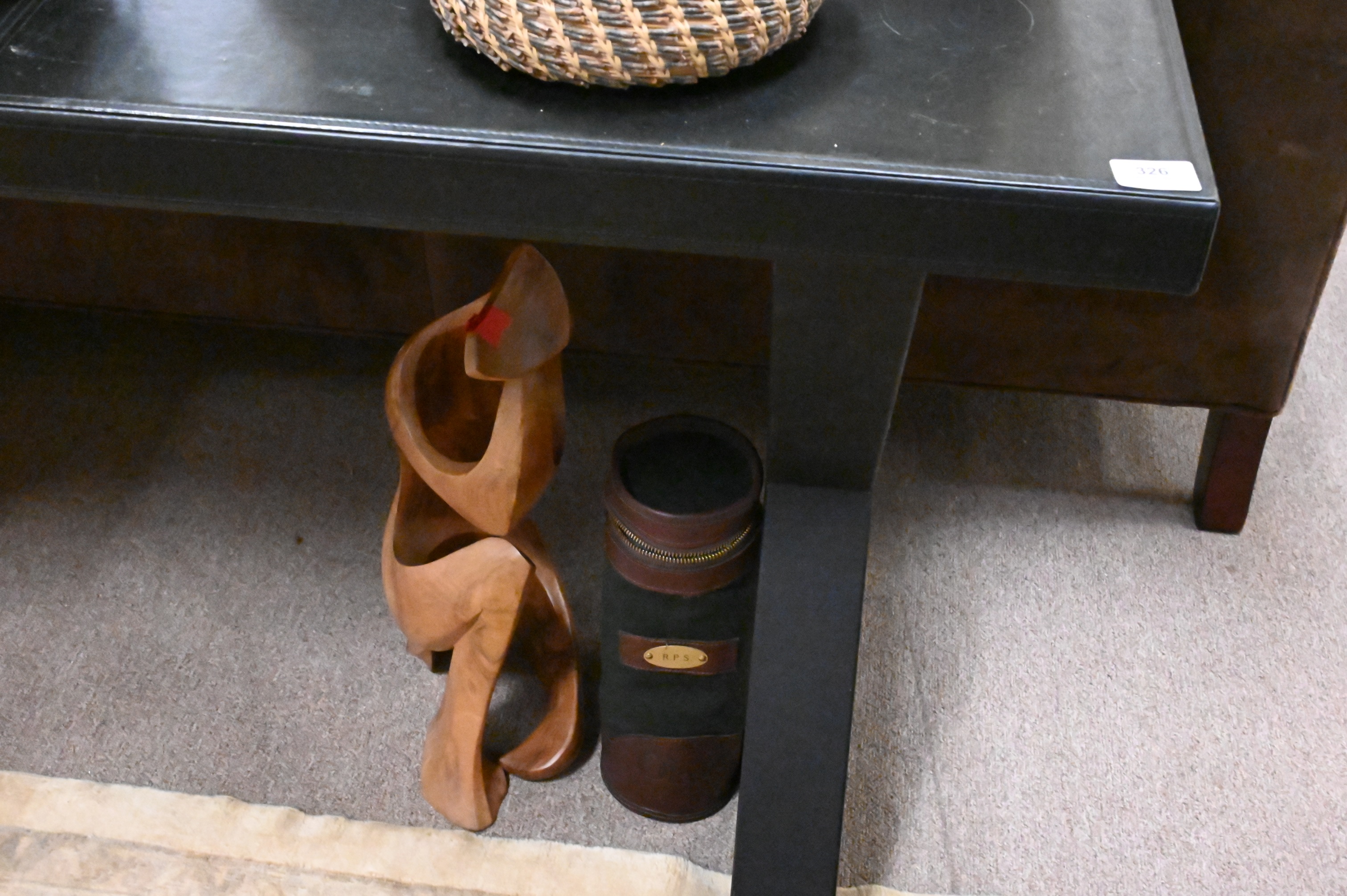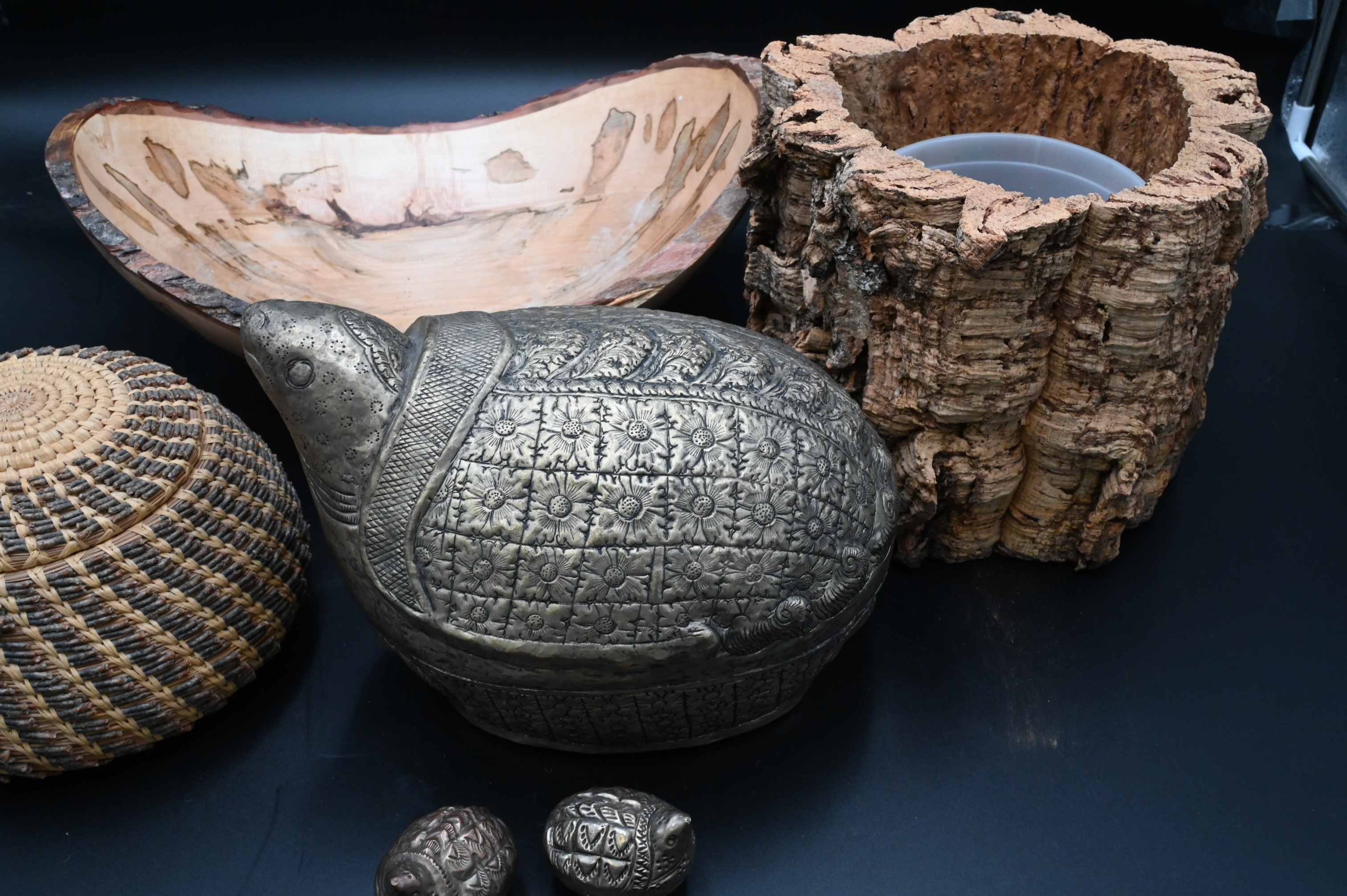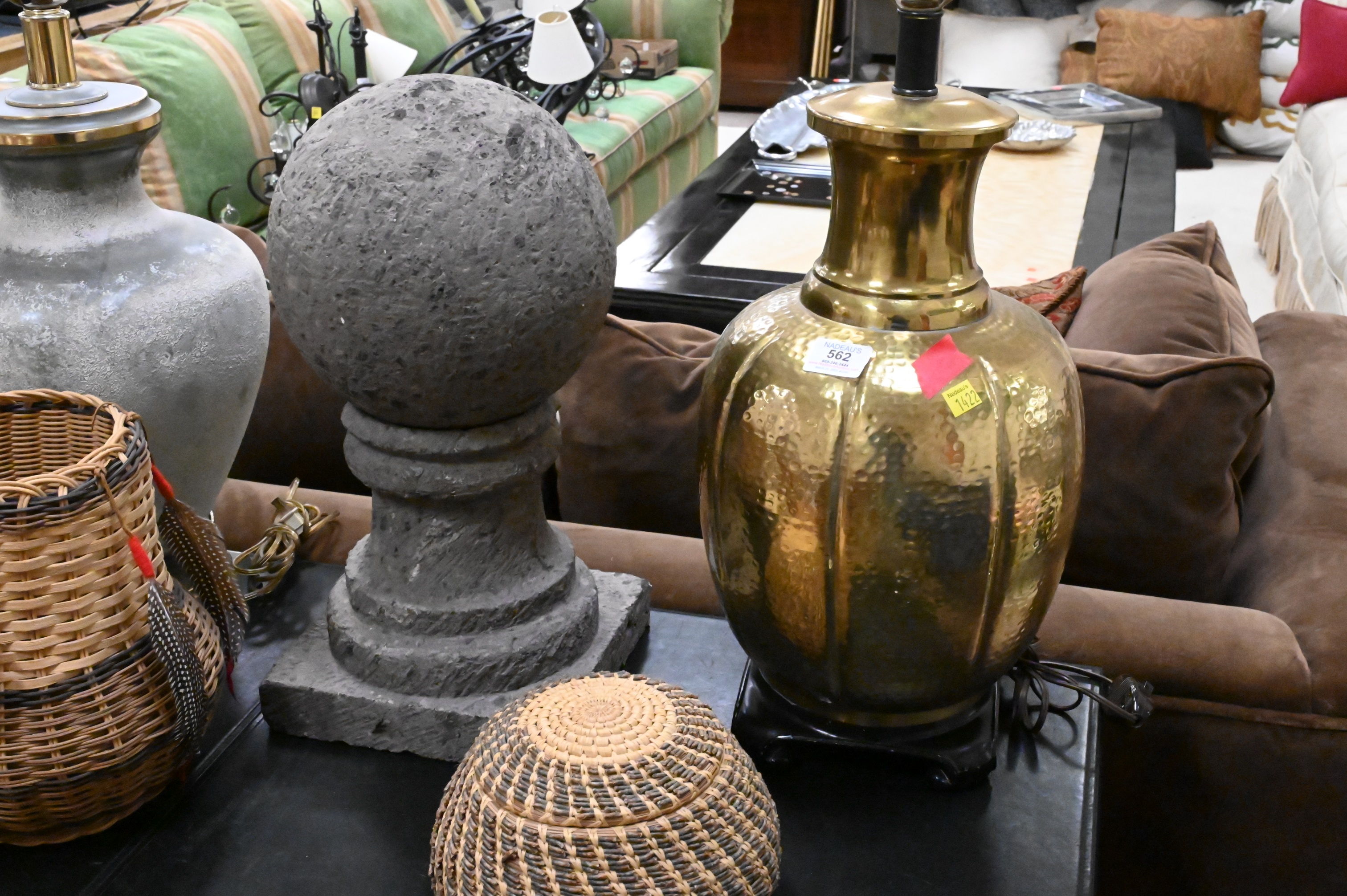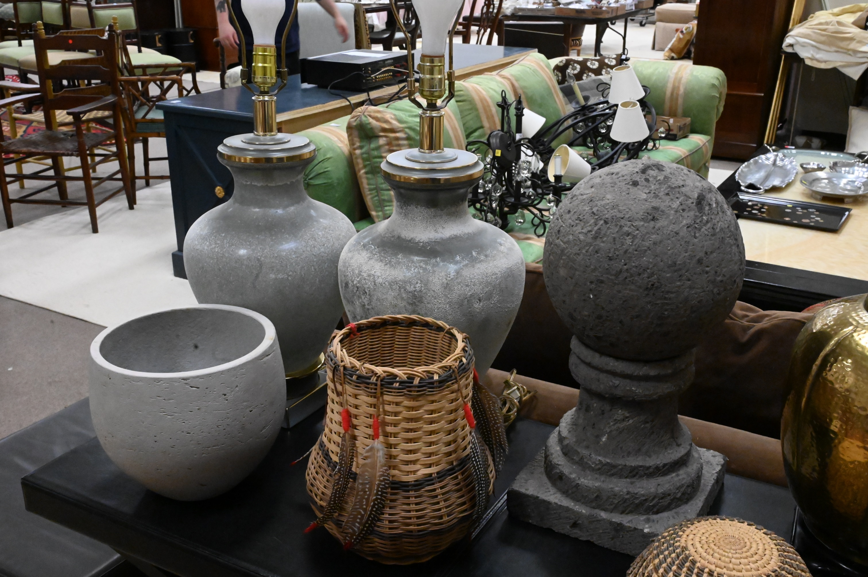 13 Piece Decorative Grouping, to include 3 lamps, (2 glass, 1 brass); a wooden modern sculpture by Lois Potosi; 2 hand woven baskets; Orvis bag; 2 wooden containers, 2 outdoor garden decorations, along with 3 metal turtle boxes; largest 22″ x 12″.