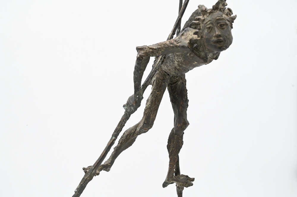 Lot 562: Bruno Lucchesi (b. 1926), Figure Walking on Stilts, bronze, signed B. Lucchesi, Forum Gallery Label on bottom, height 24 inches.