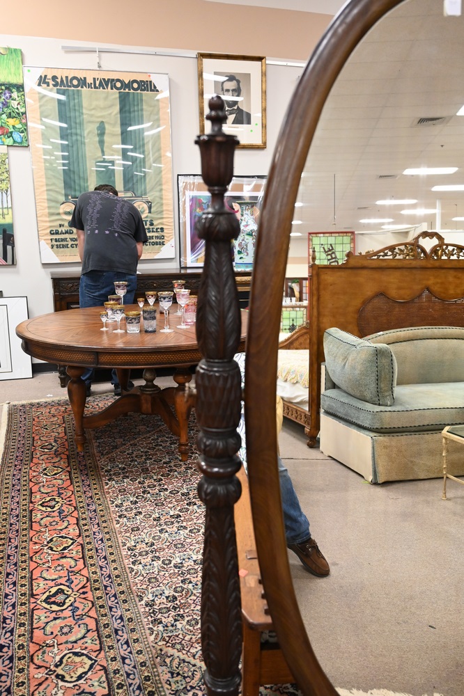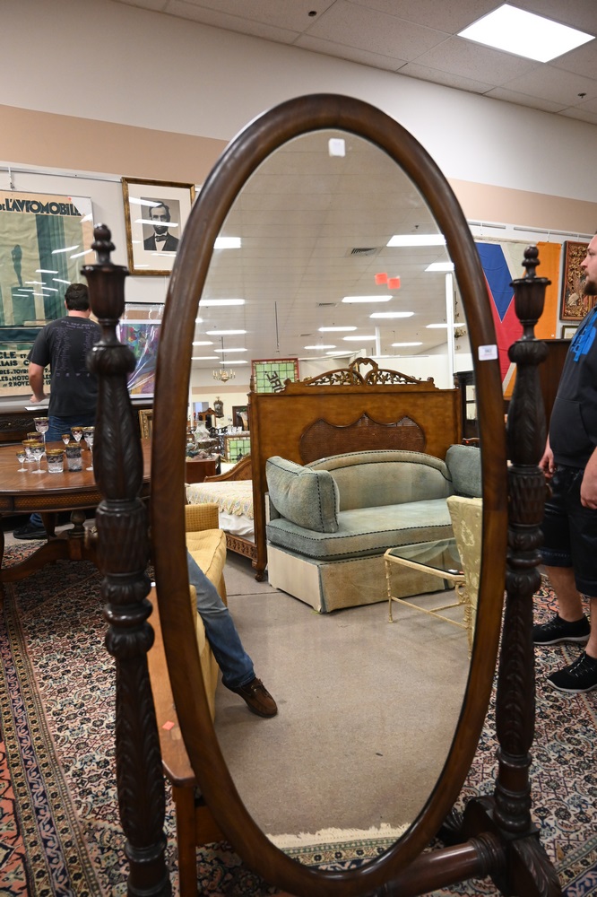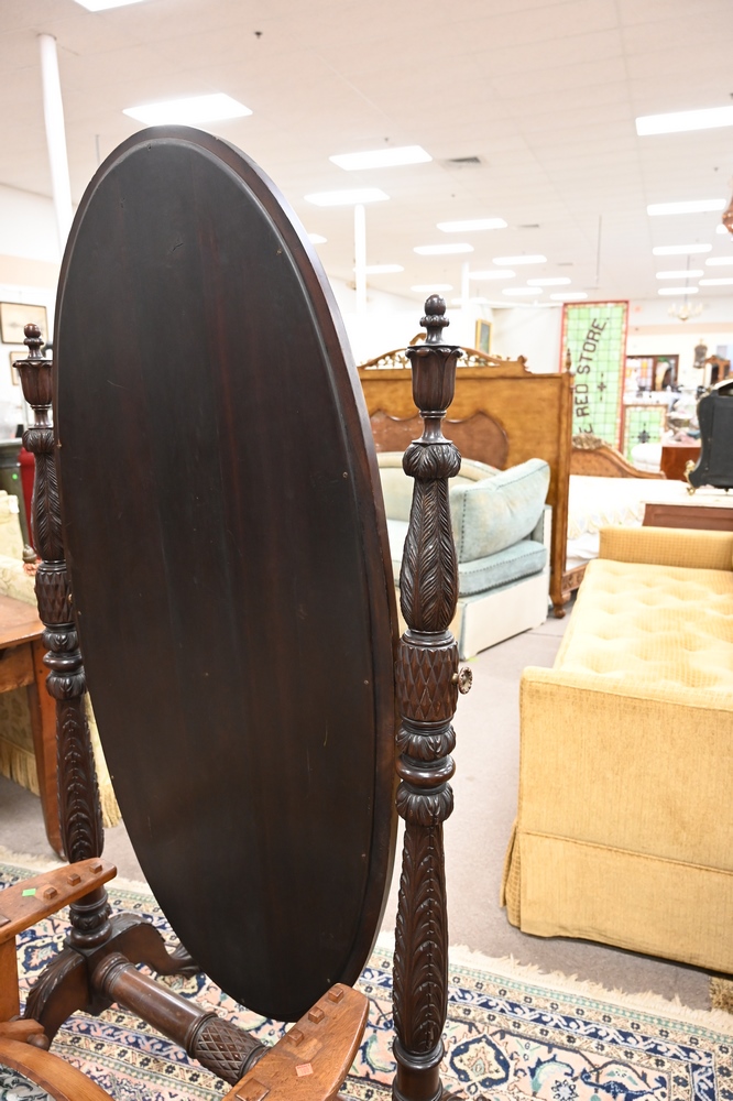 Lot 562: Federal Style Mahogany Cheval Mirror, having carved posts and paw feet, height 71 inches, width 36 inches.