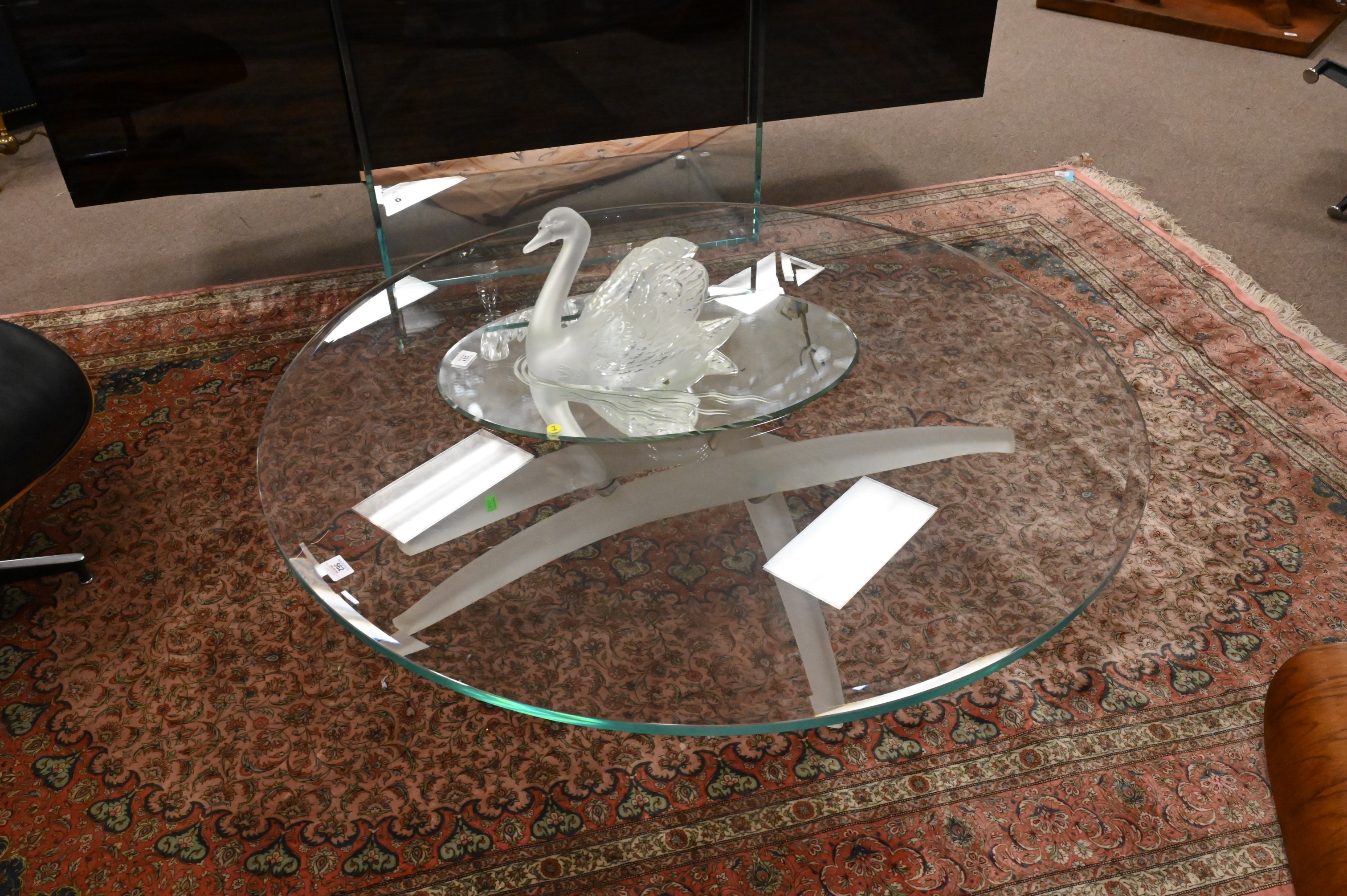 Fili D’ Erba Glass Top Coffee Table, having beveled round glass top set on Murano glass base, height 17 inches, diameter 48 inches, Provenance: A Private Collection from Greenwich Connecticut.