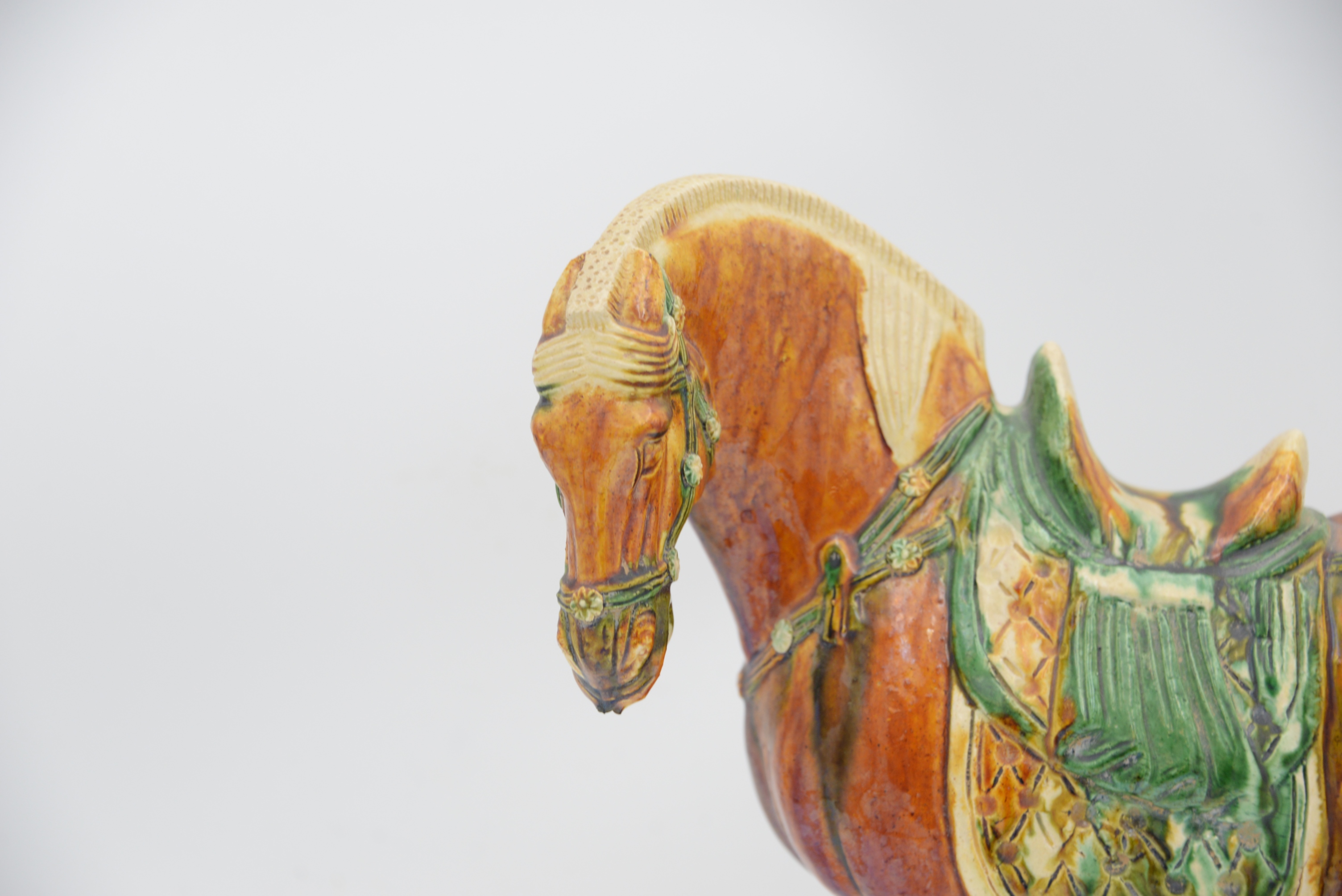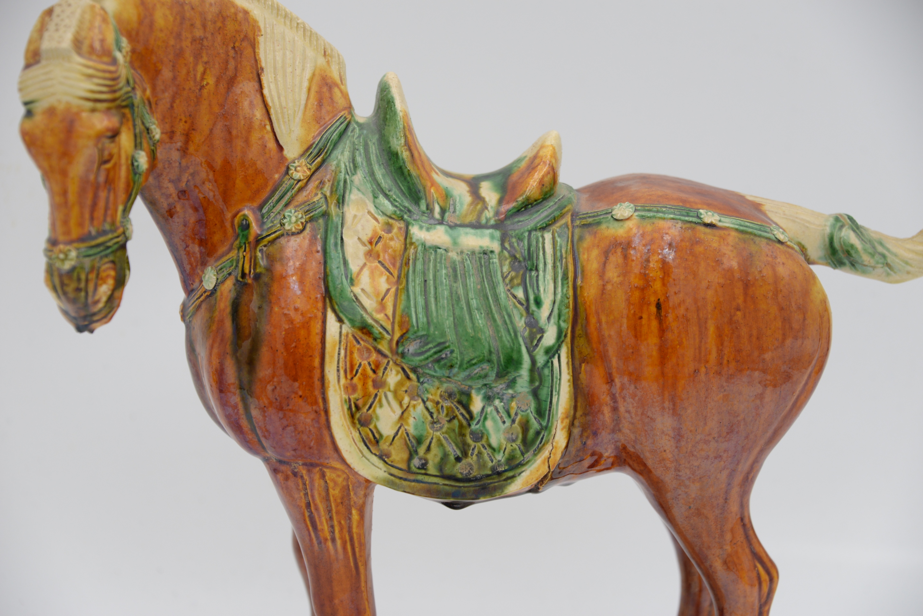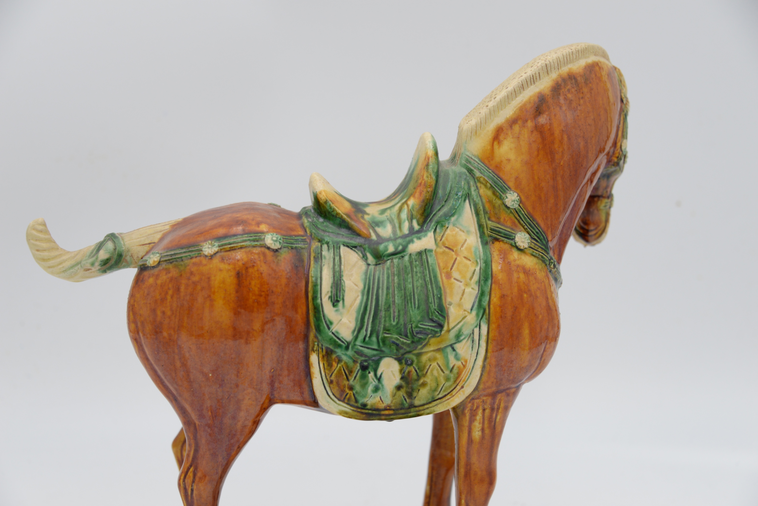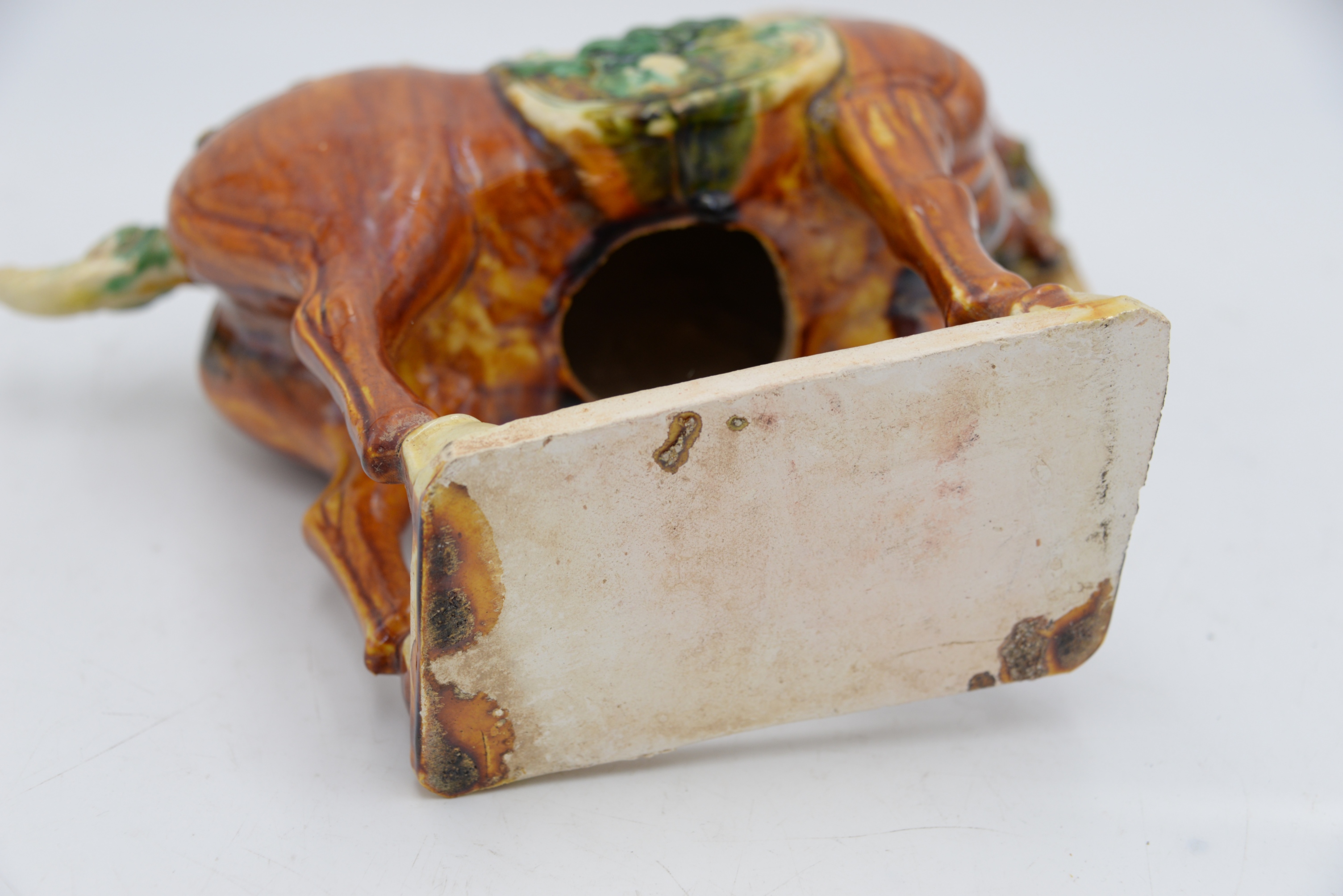 Tang Dynasty Style Pottery Horse, brown and green glaze on rectangular base, height 11 1/2 inches, length 13 inches. Provenance: Julius H Jacobson II a Fifth Avenue Estate.