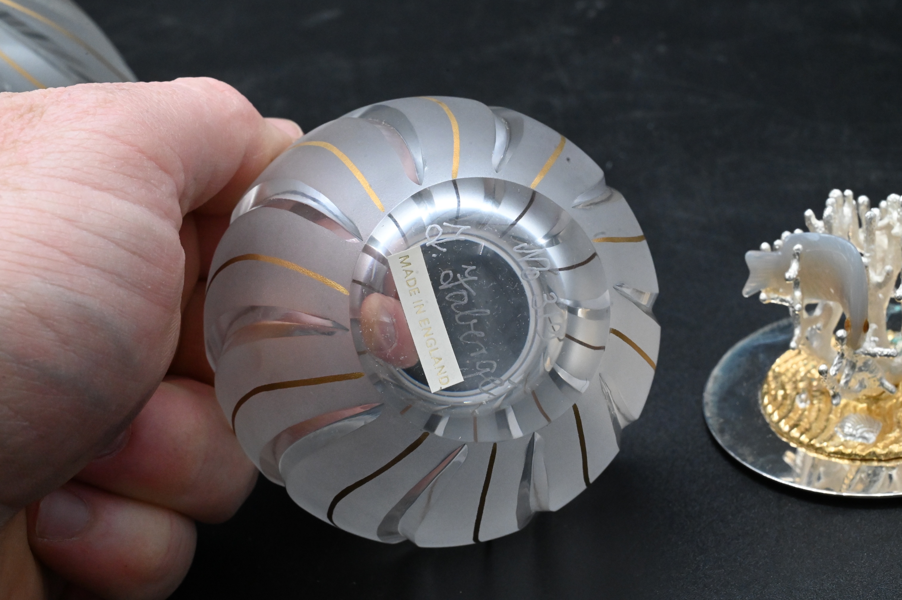 signed T. Faberge #319, featuring two fish swimming amongst the coral set on a sterling silver base, vermeil, English silver marks