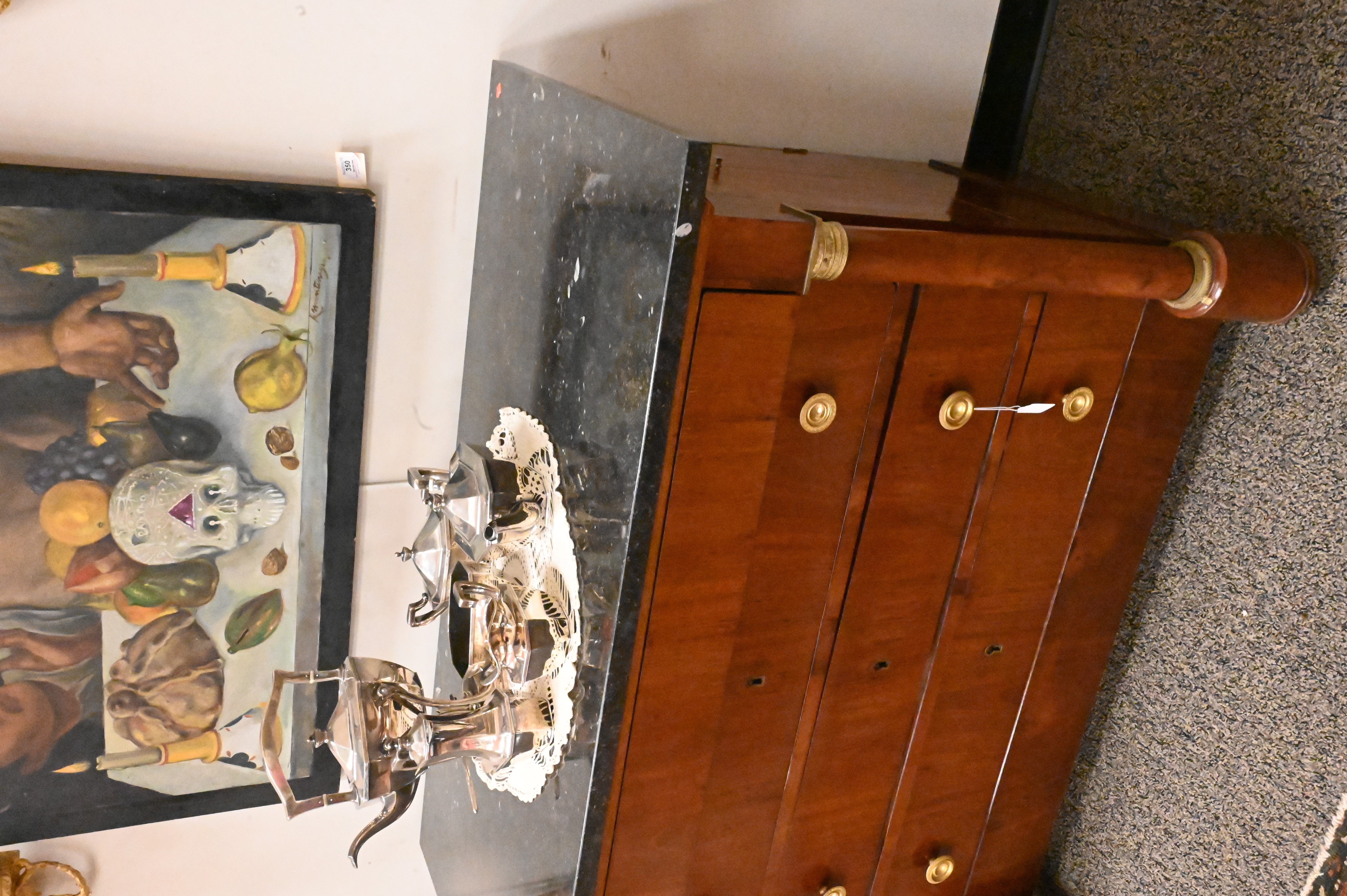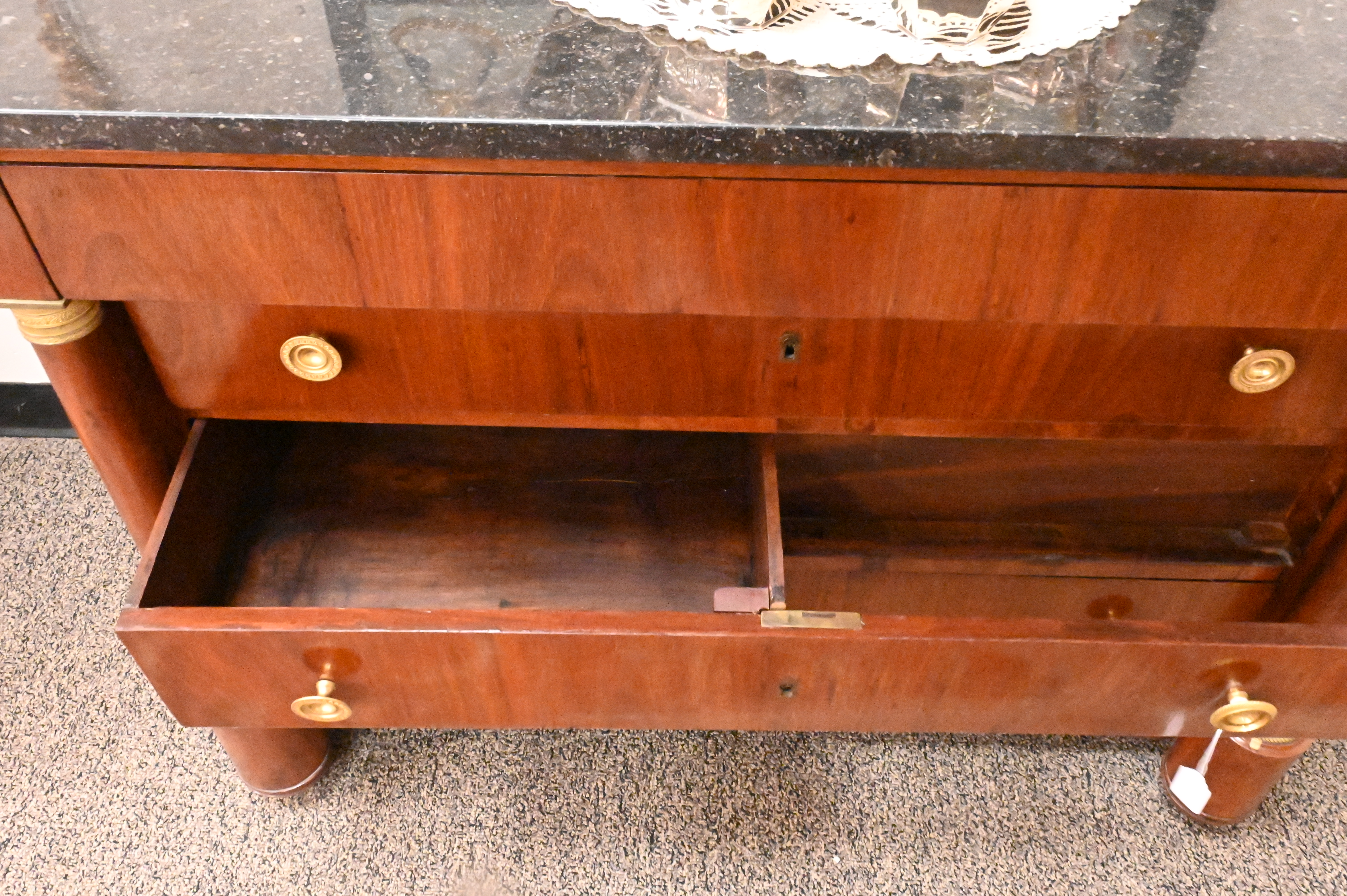each having a rectangular black fossil marble top over a frieze drawer over-hanging three long drawers flanked by Doric columns, later-fitted interior, along with half drawers and secret compartments accessible from side, 19th and 20th century