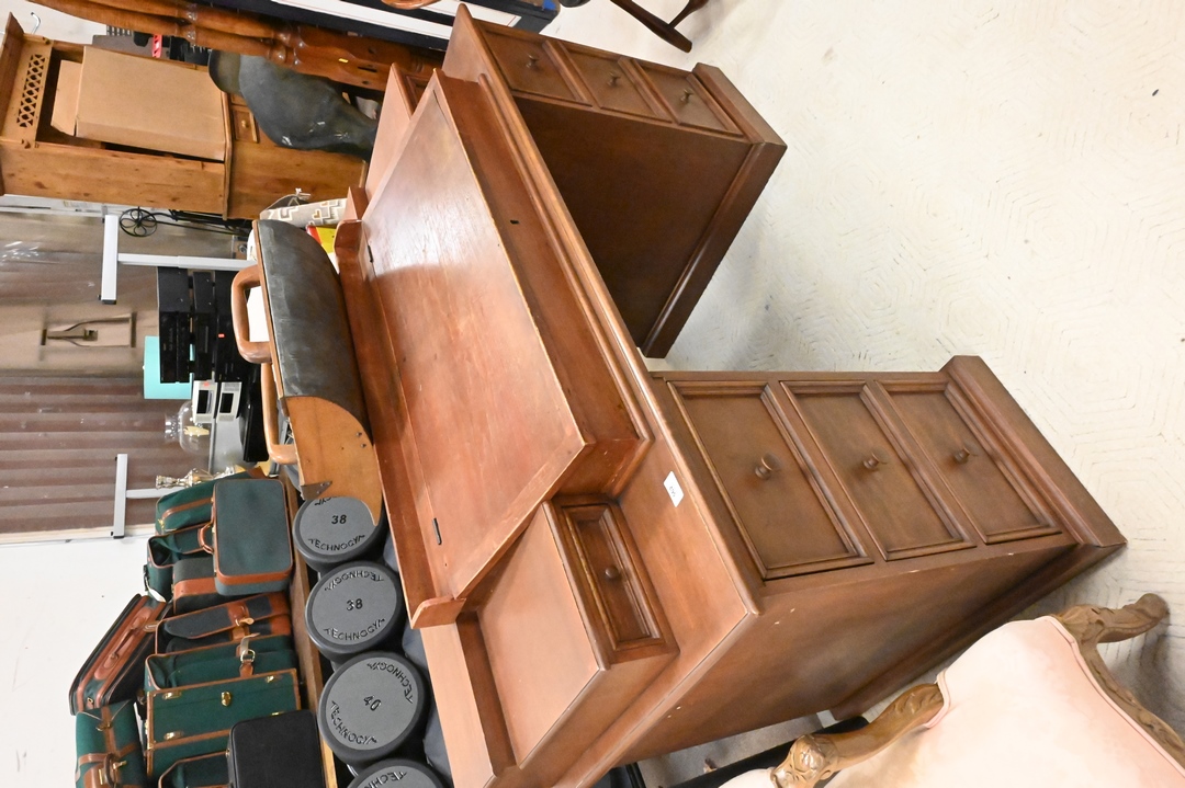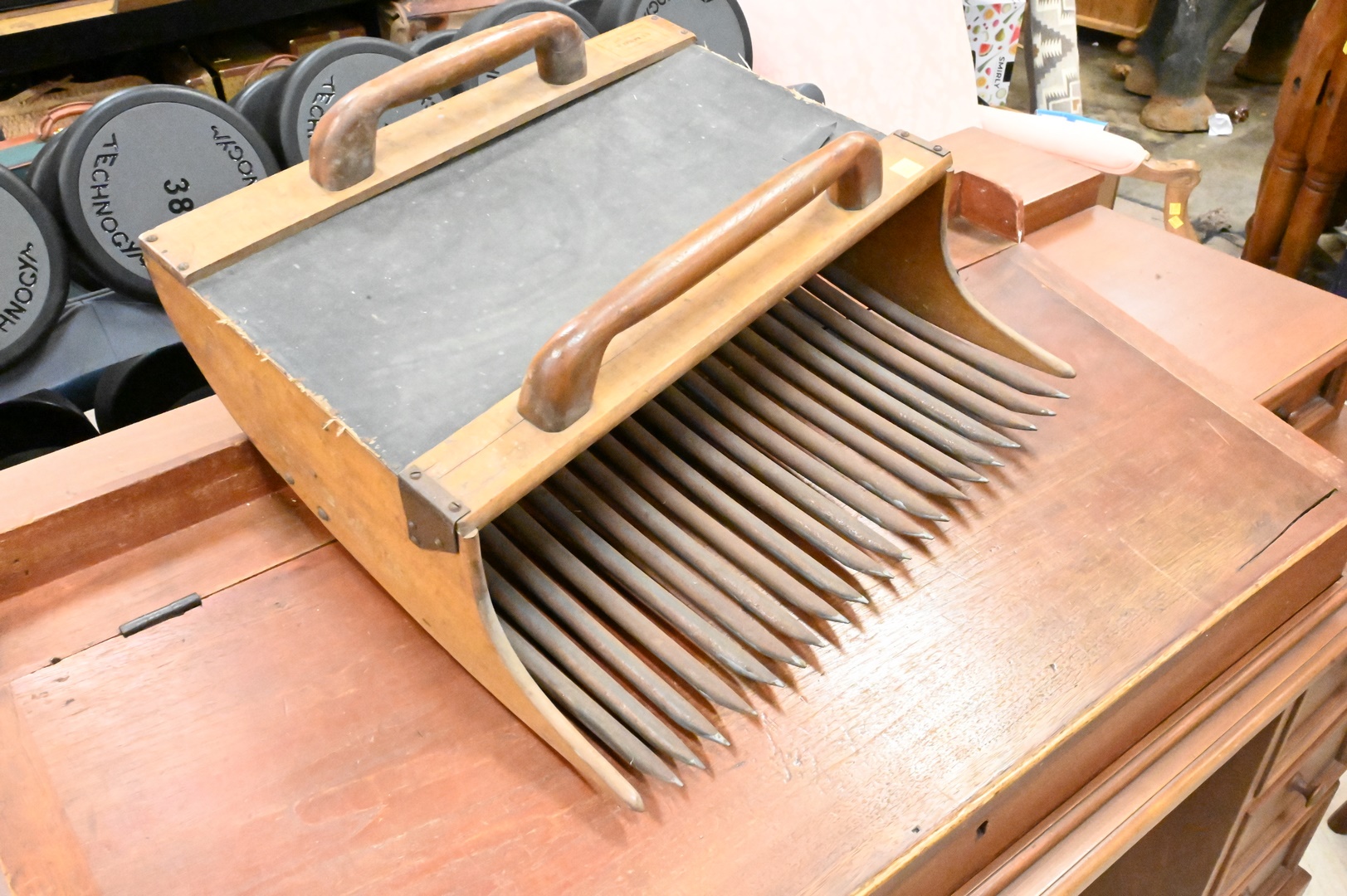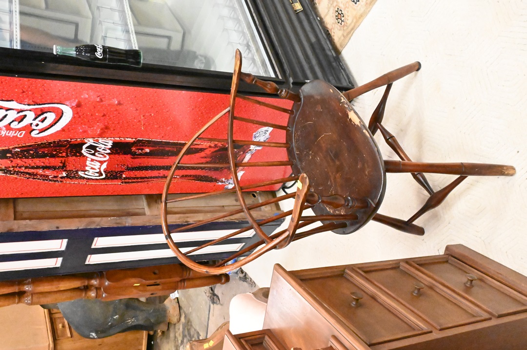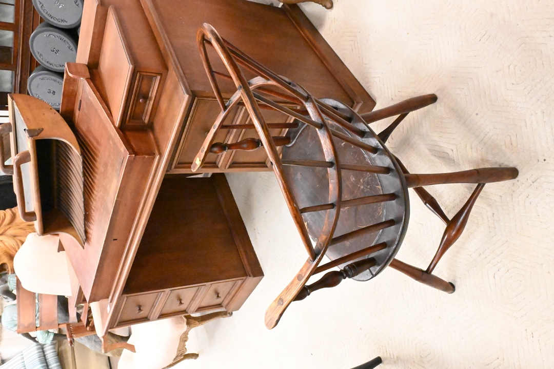 Three Piece Lot, to include a Windsor bowback armchair, along with a cranberry scoop, a antique lap desk now built into a custom kneehole desk frame, seat height 17 inches, height 34 inches.