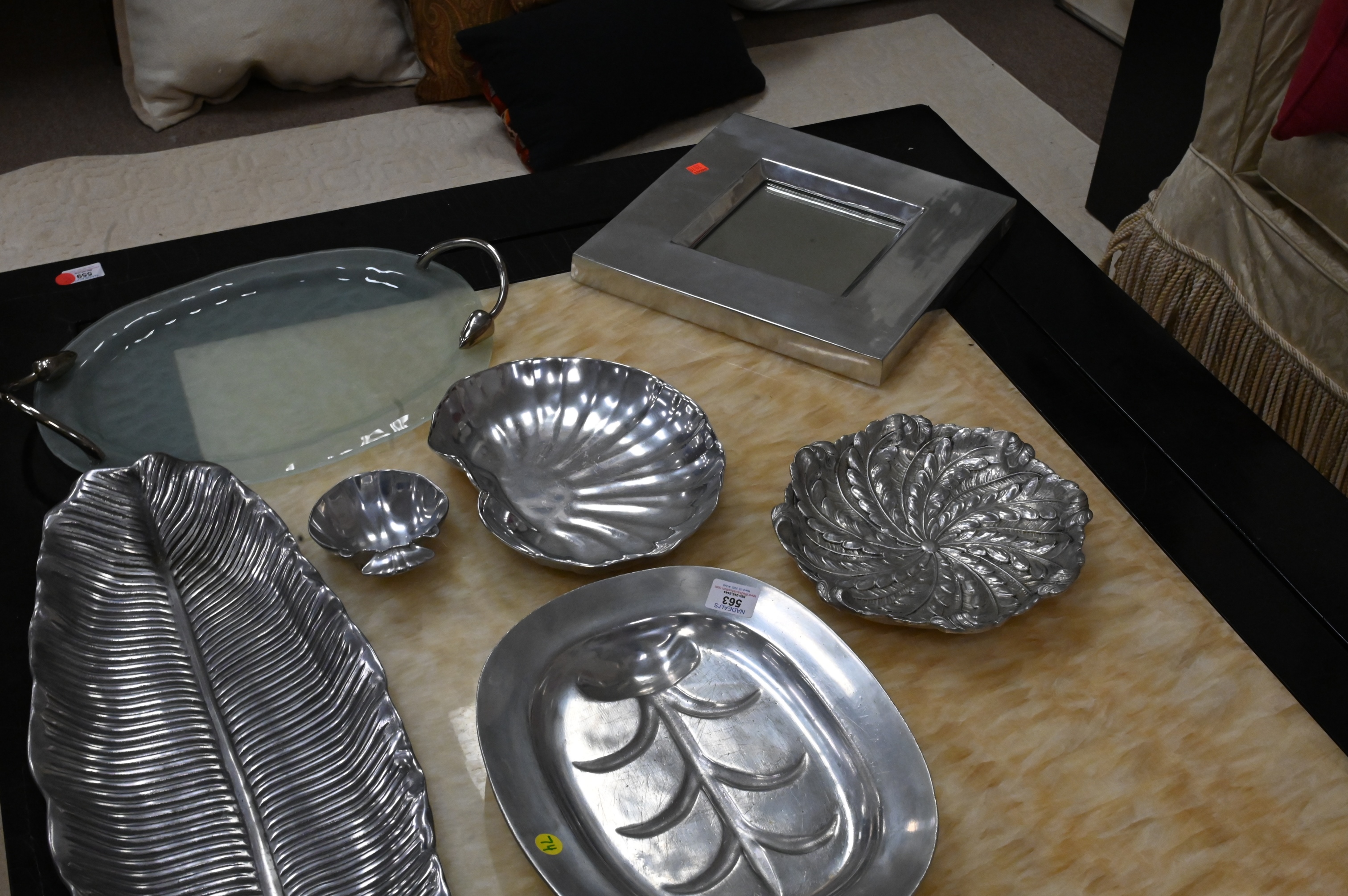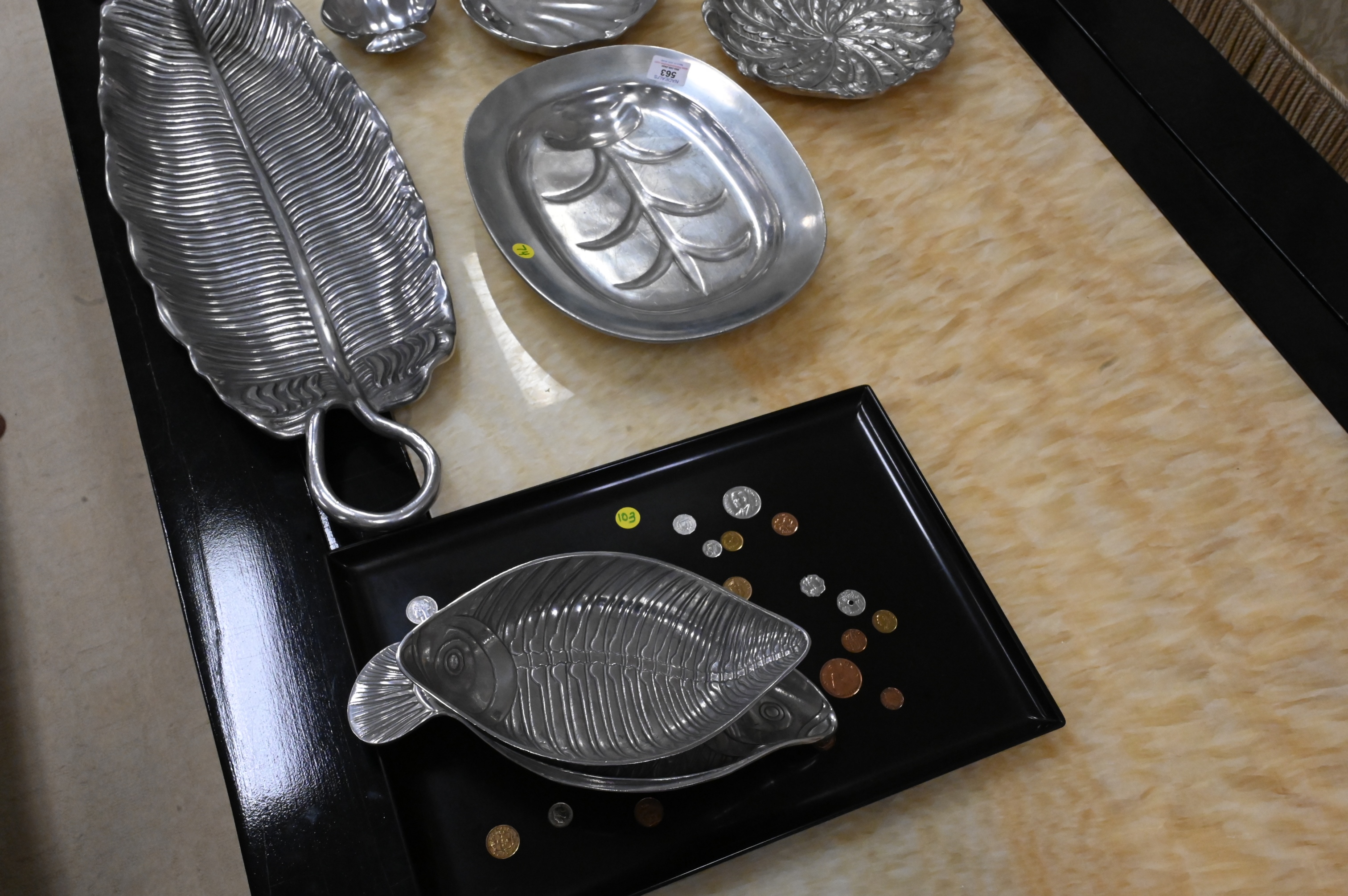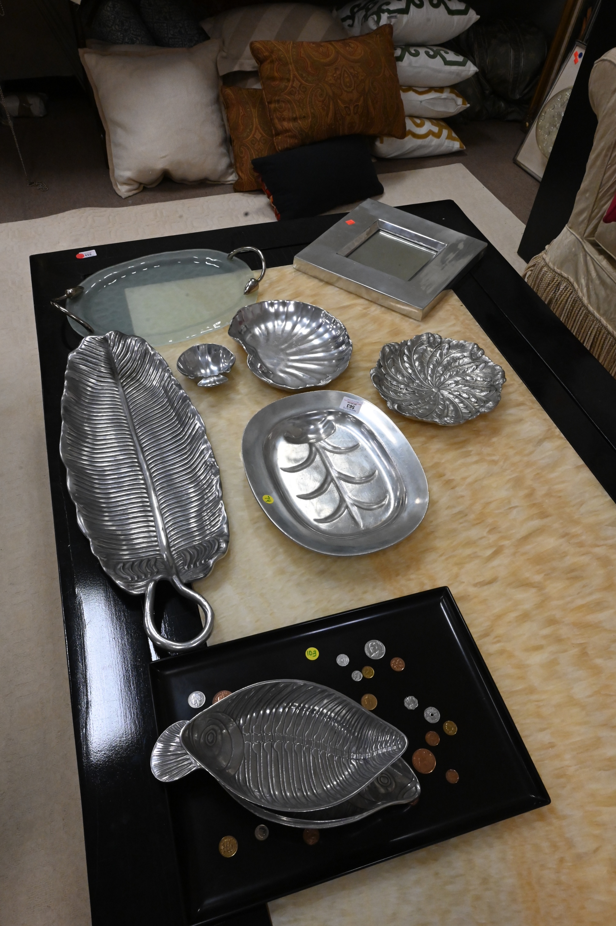 10 Piece Platter Grouping, to include Arthur Court fish bowl, vintage mid century coin tray, a glass tray having metal tulip handles, etc.; largest 28″ x 10″.