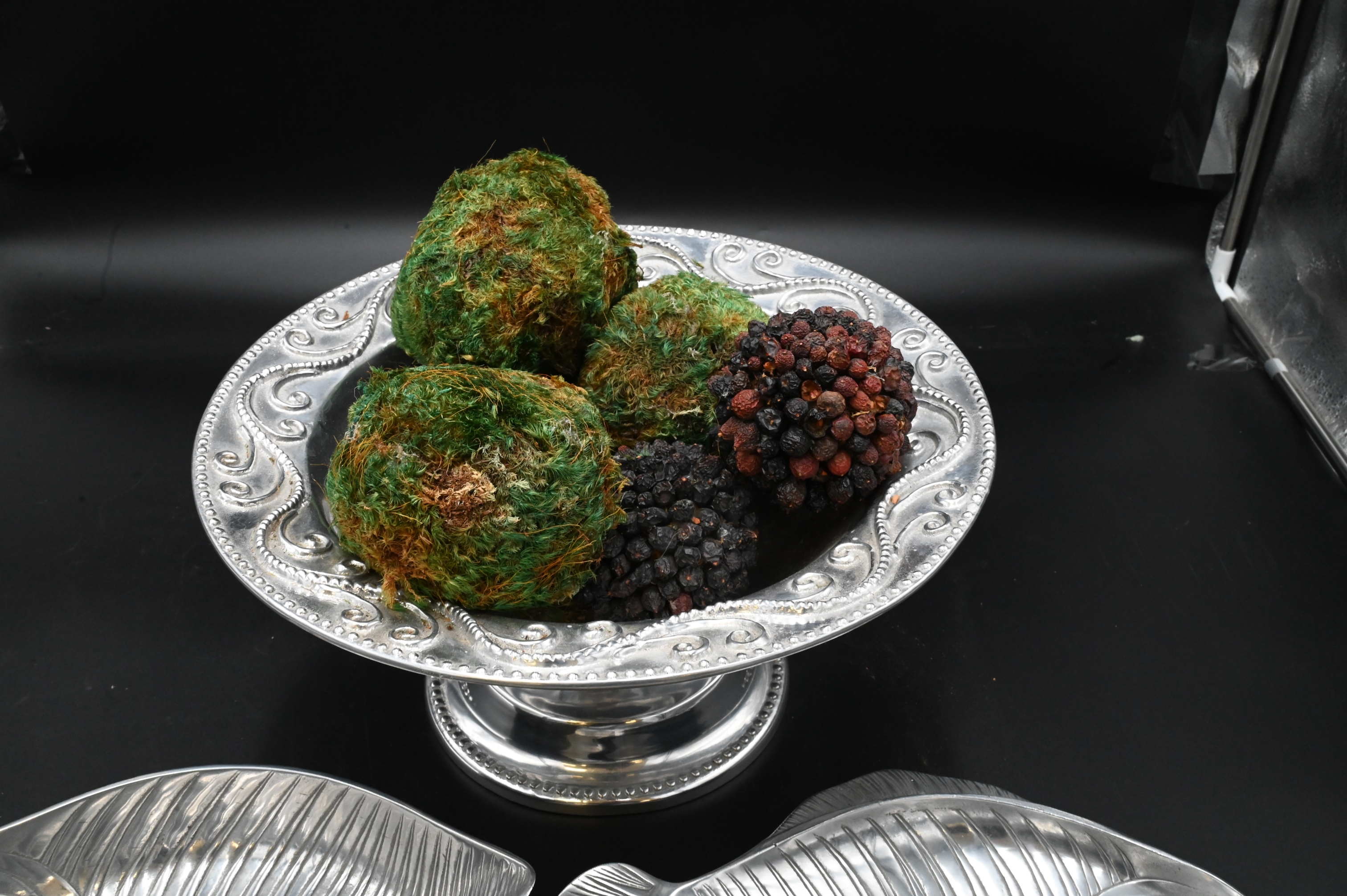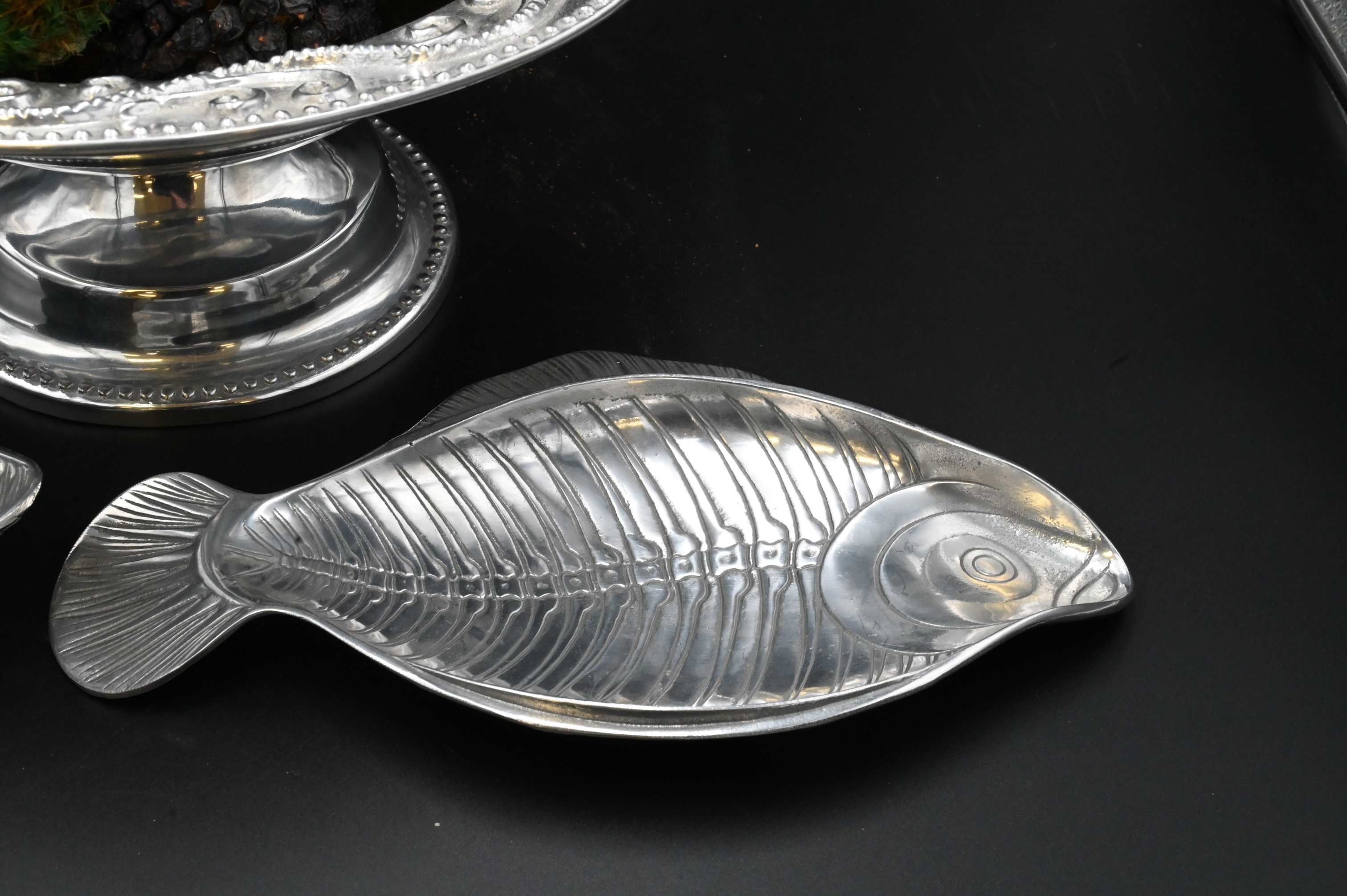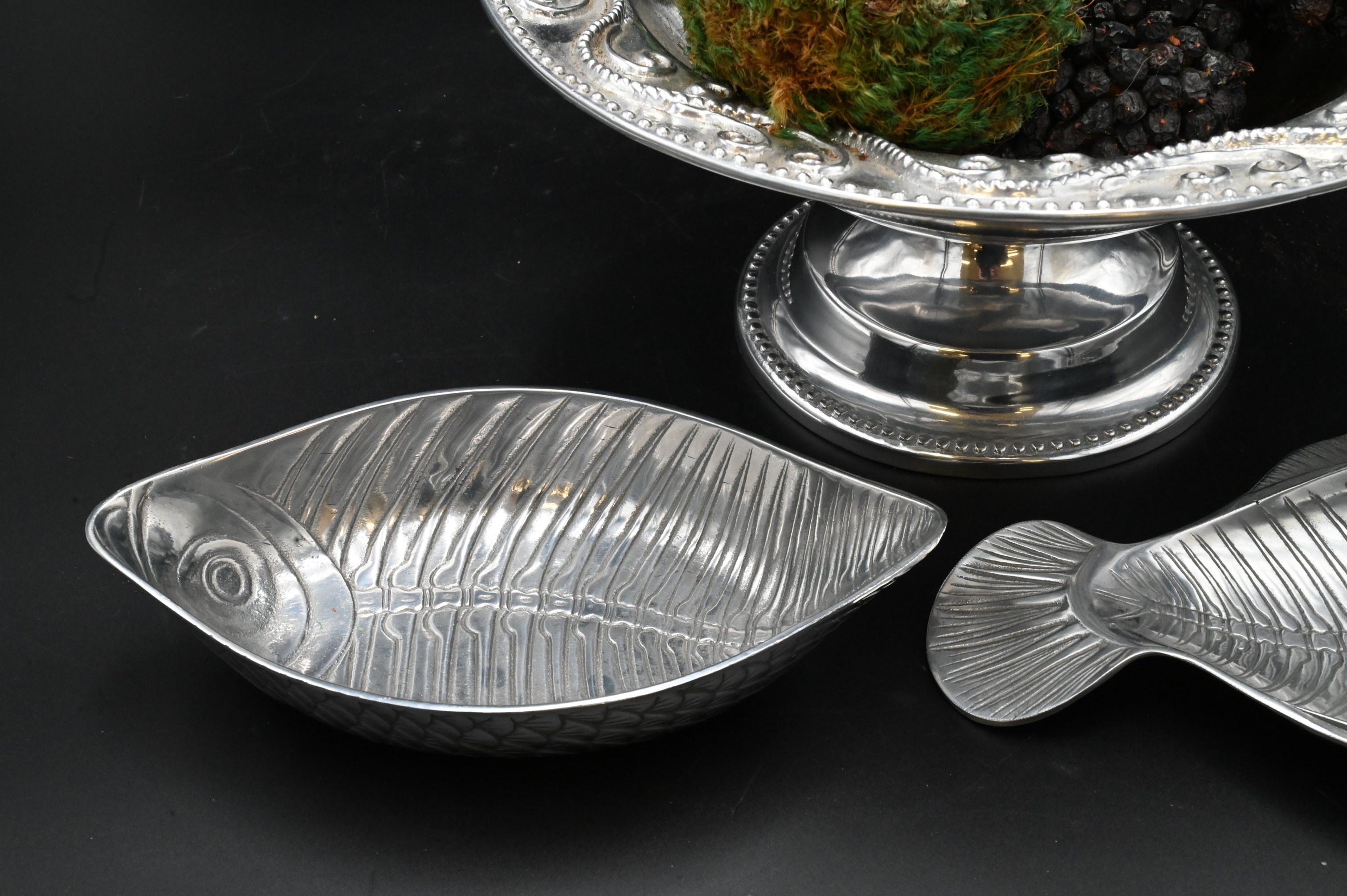 10 Piece Platter Grouping, to include Arthur Court fish bowl, vintage mid century coin tray, a glass tray having metal tulip handles, etc.; largest 28″ x 10″.