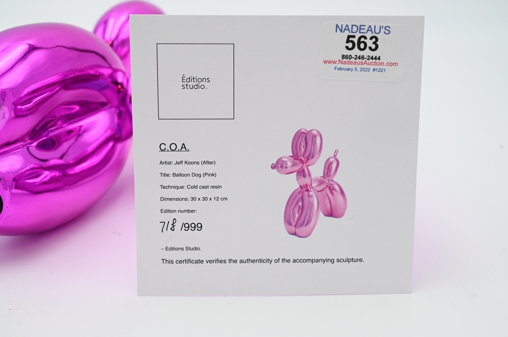 Lot 563: Pink Balloon Dog by Editions Studio, cold cast resin, numbered 718/999, height 11.5 inches.