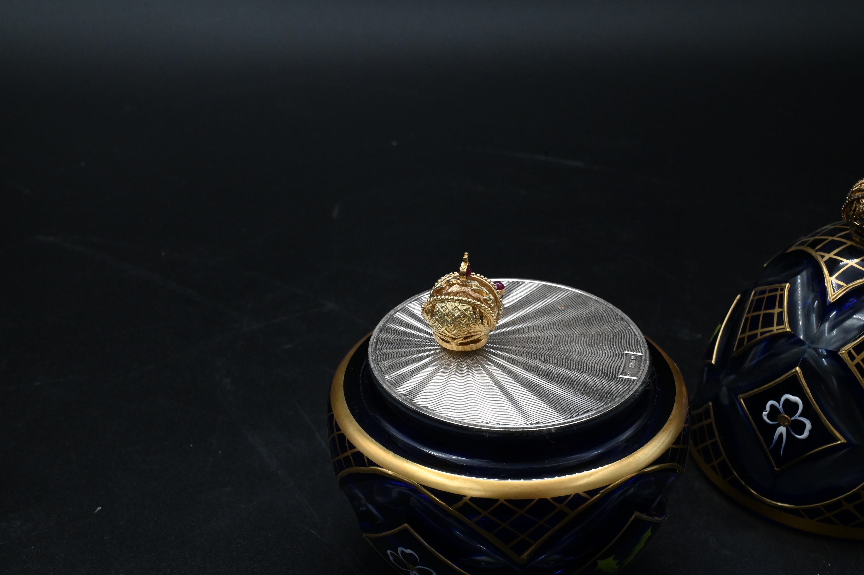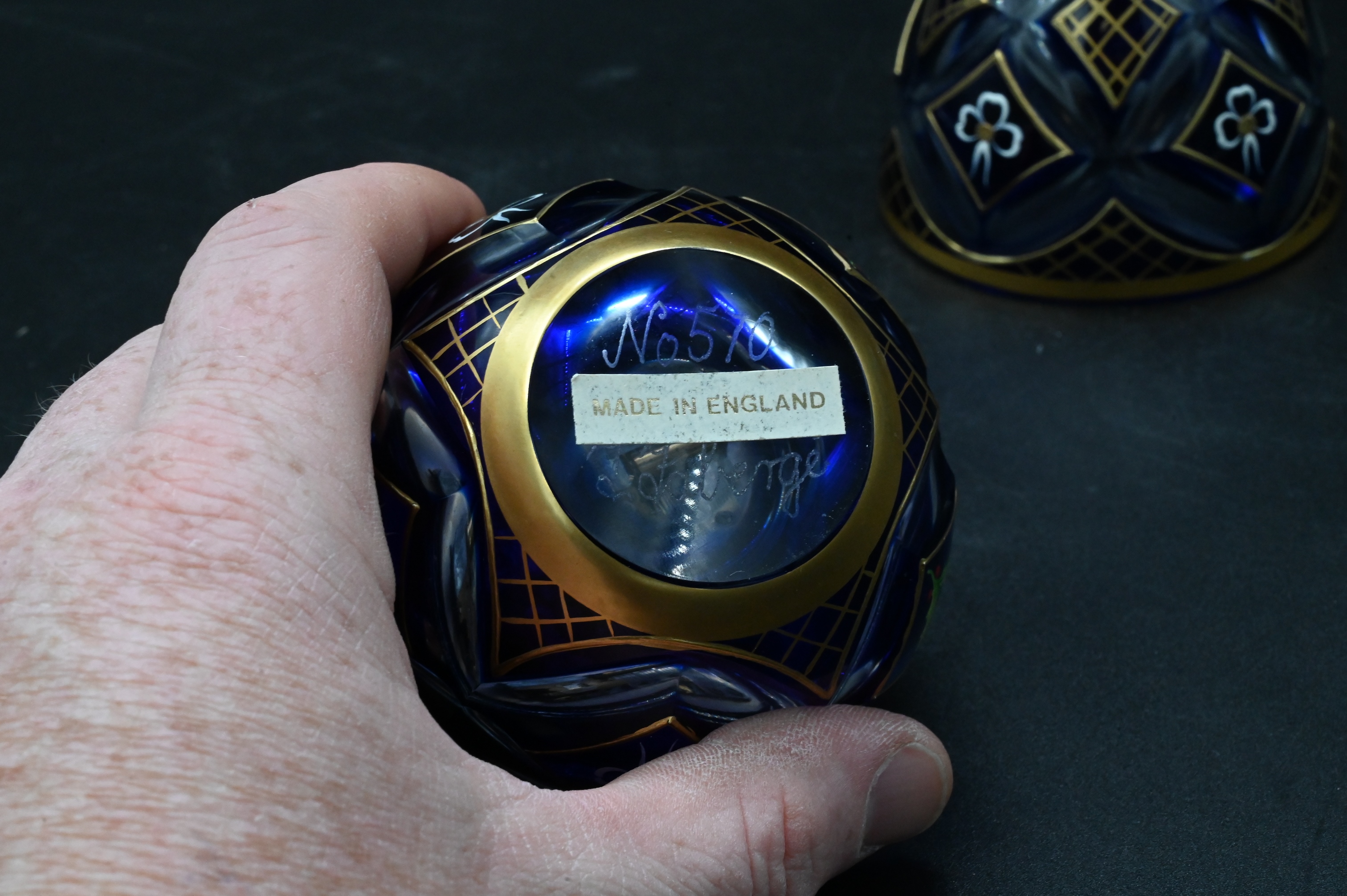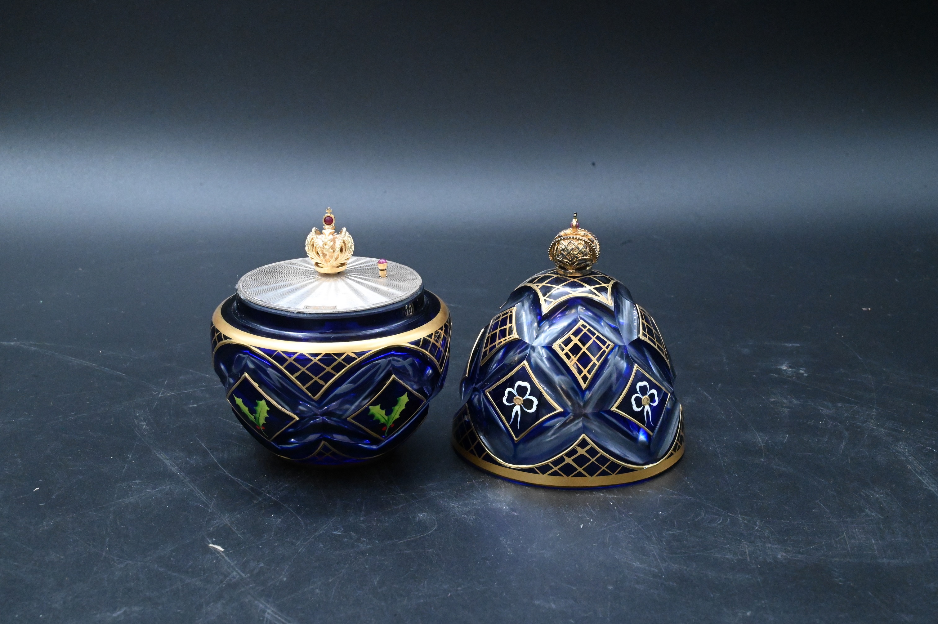 cobalt blue and clear crystal, having holly accents with music box that plays “Silent Night” in working condition, 1986, edition 570/750, marked sterling silver