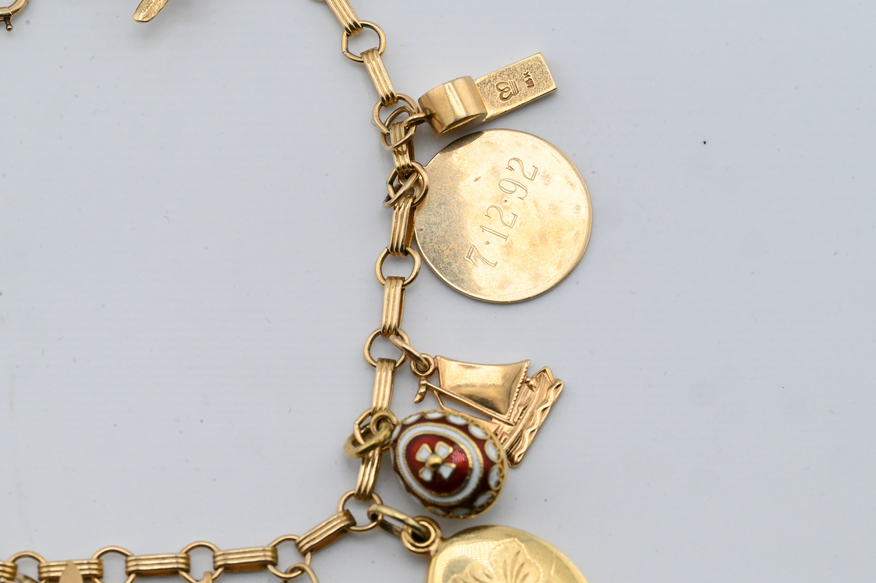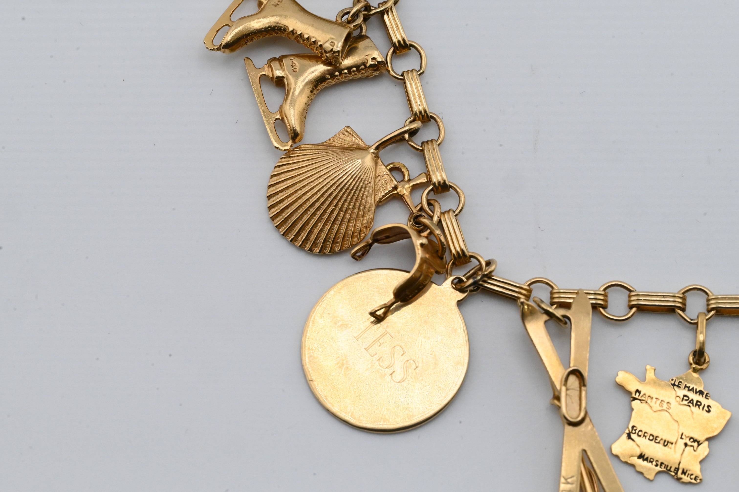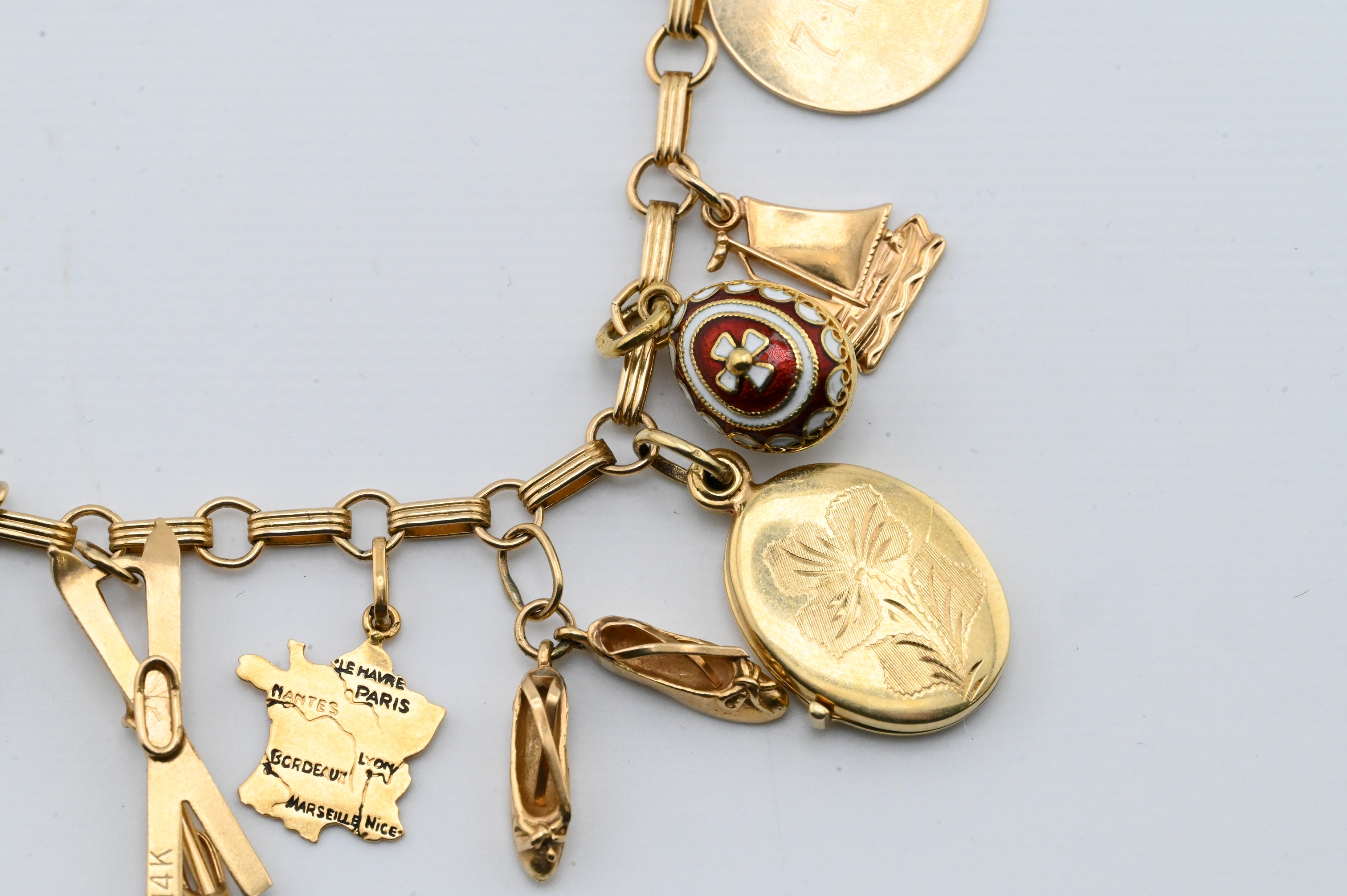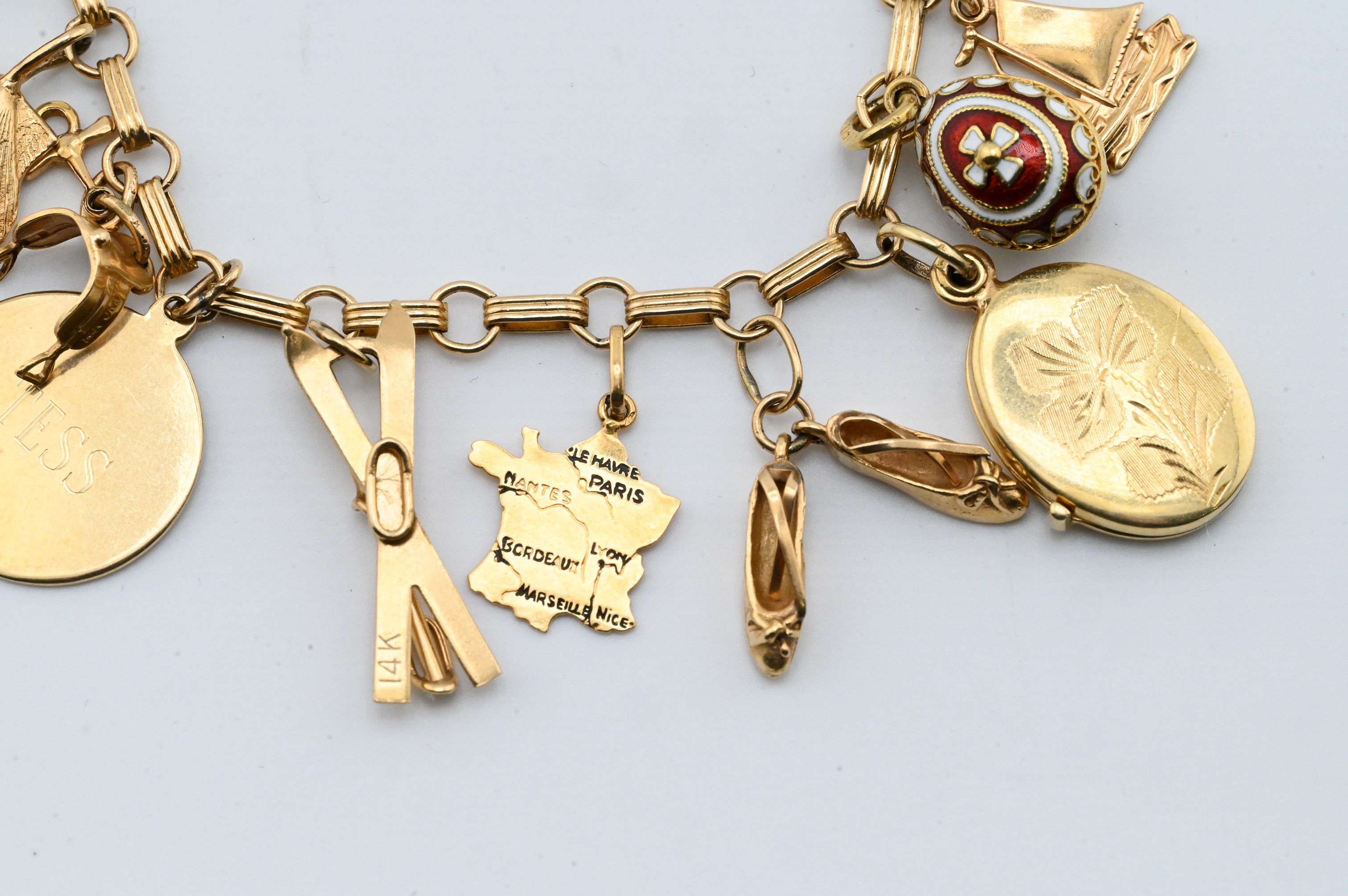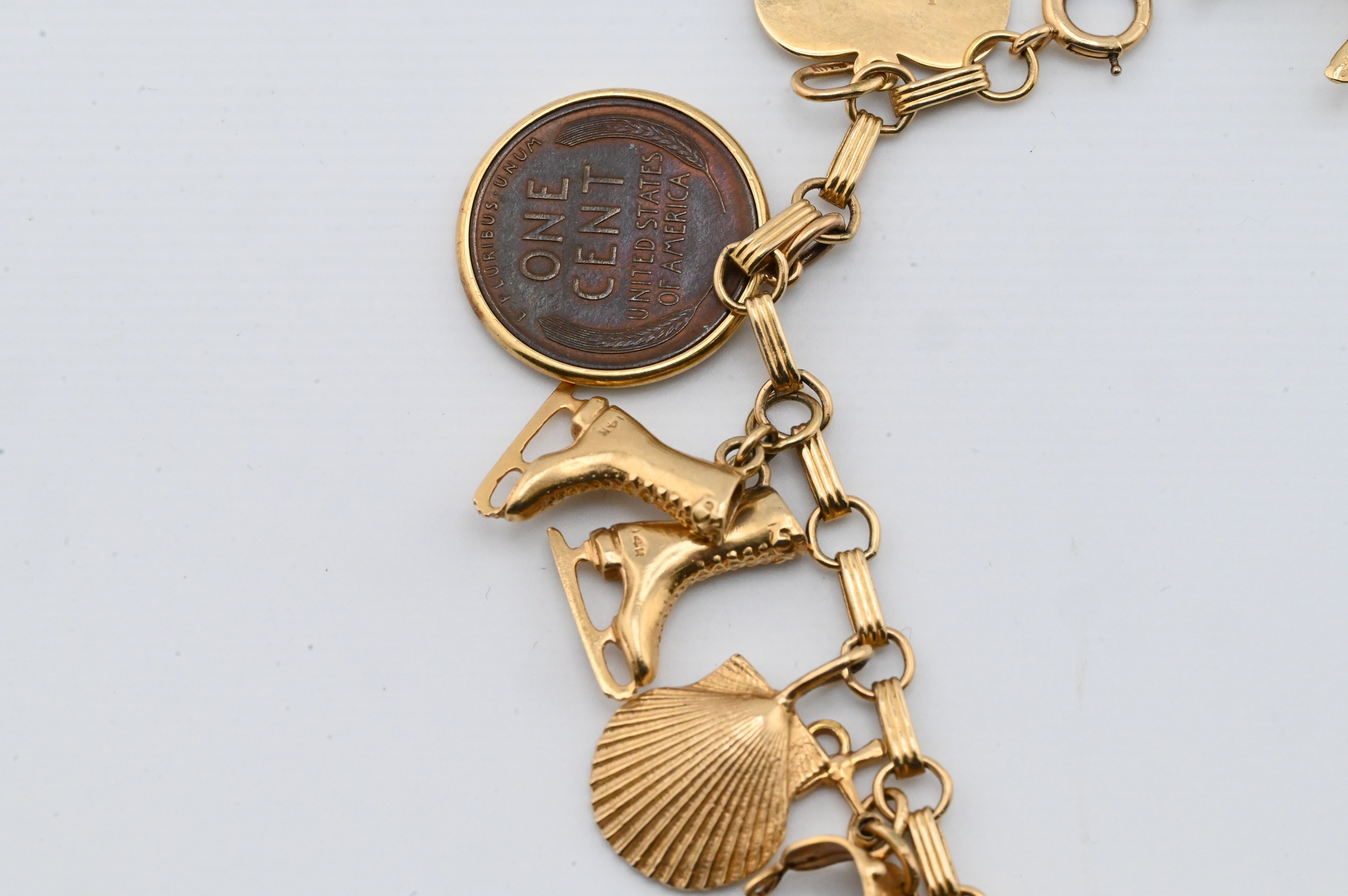 featuring a 7-inch 14K gold link bracelet suspending an assembled collection of vintage gold charms, including: a heart engraved “Love Mummy”, a 1913 Lincoln penny bezel-set charm, a shell, miniature skis, map of France, ballet slippers, engraved oval locket, enamel egg (18K), whistle, round disc engraved “7•12•92”; and a three-dimensional jet airplane