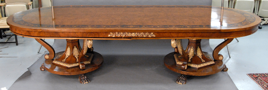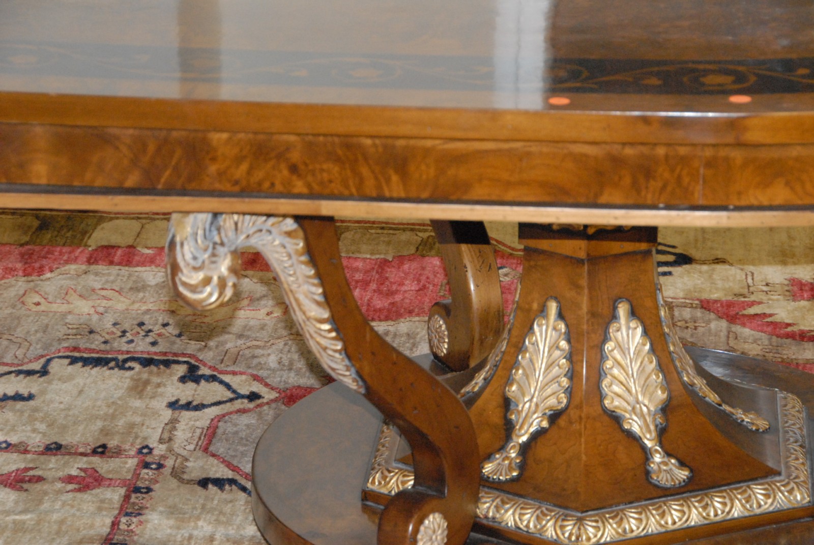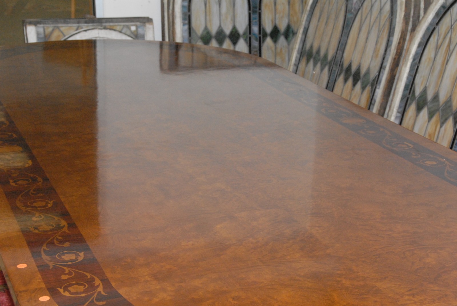 Burlwood inlaid oval conference table with gilt metal mounts and gilt decoration all set on double pedestals with paw feet.