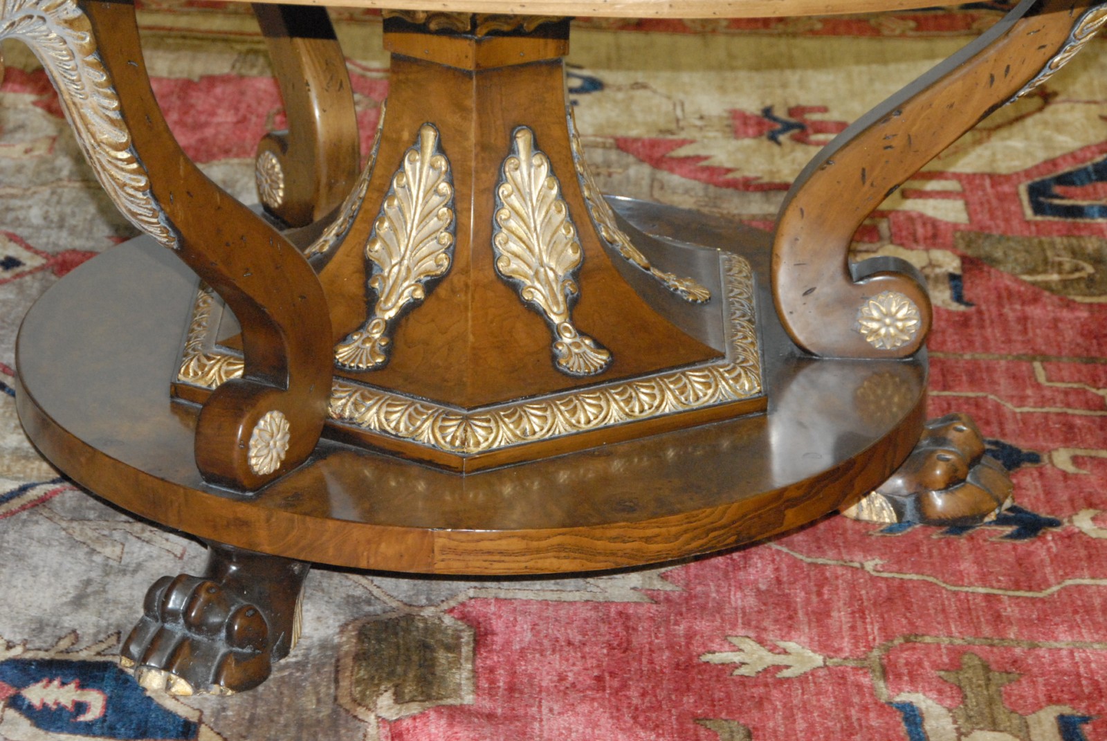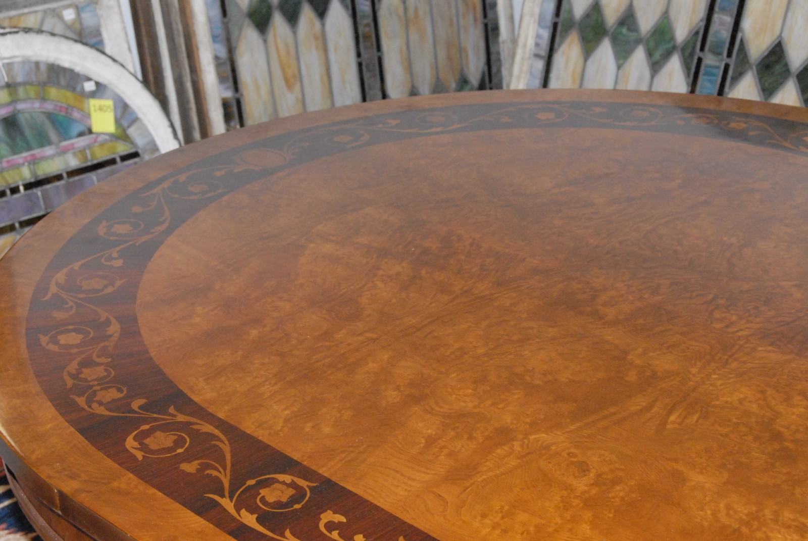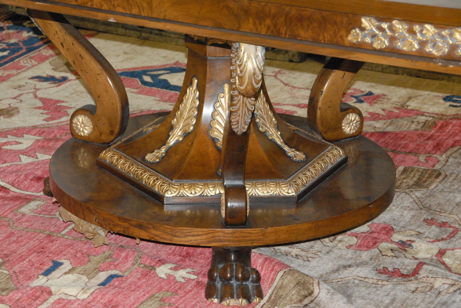 Burlwood inlaid oval conference table with gilt metal mounts and gilt decoration all set on double pedestals with paw feet.