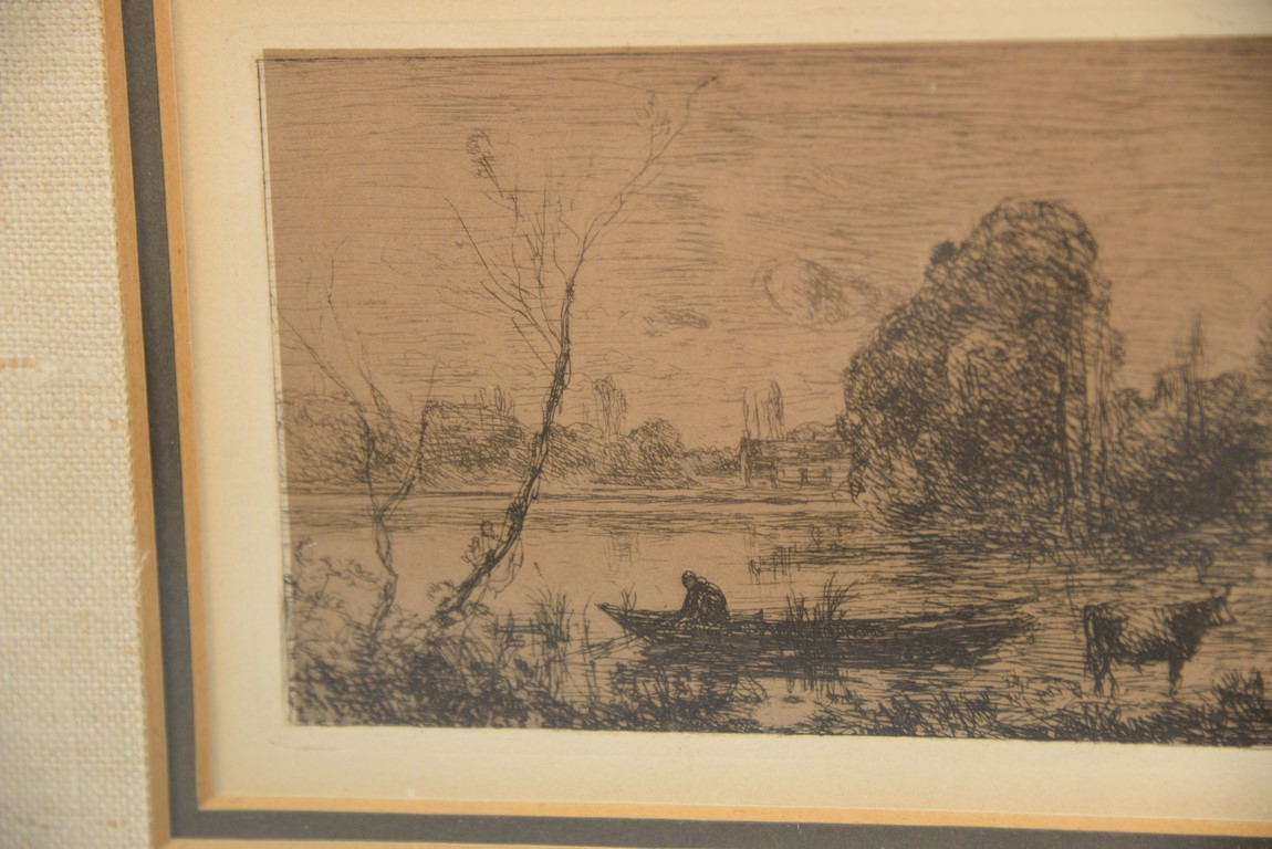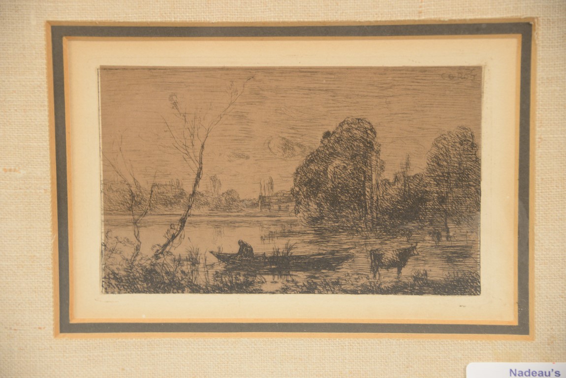 Camille Jean-Baptiste Carot 1796-1875 Ville d’Auray: l’Etang au Batelier etching and drypoint on tan chin colle signed in plate top right: Carot 3 x 4 3/4 Provenance: The Estate of Natalie Rafferty