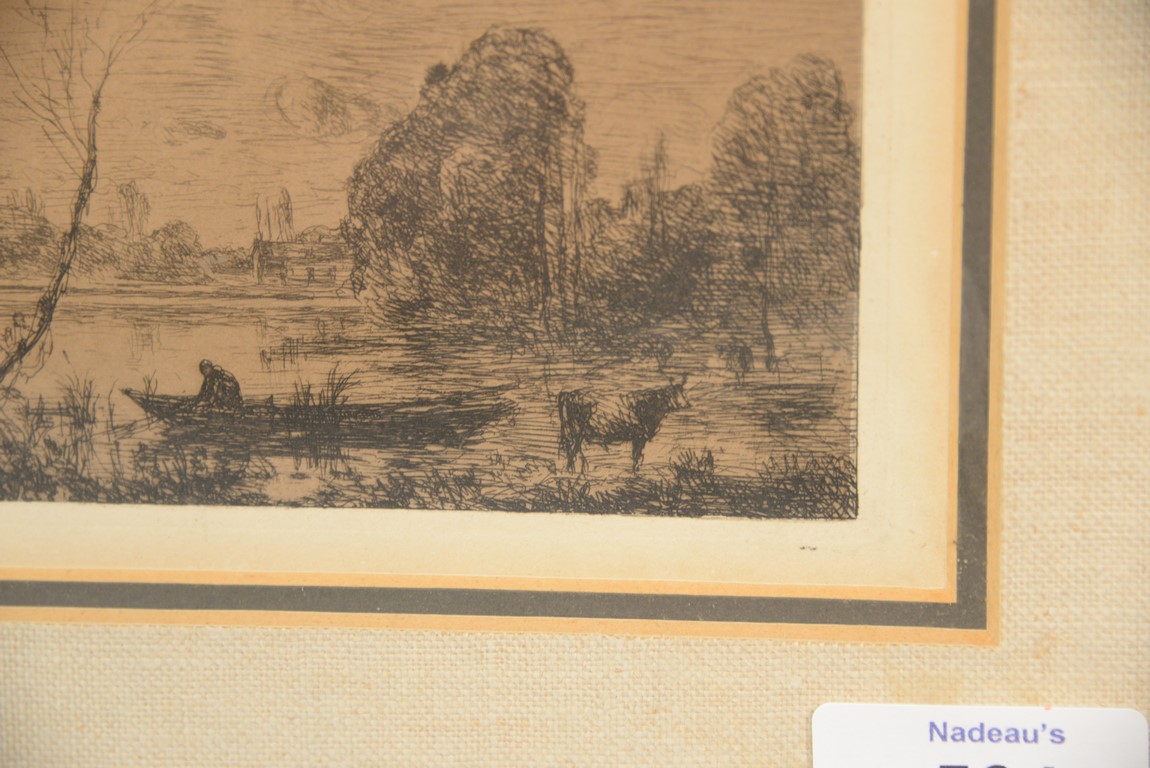 Lot 564: Camille Jean-Baptiste Carot 1796-1875 Ville d’Auray: l’Etang au Batelier etching and drypoint on tan chin colle signed in…